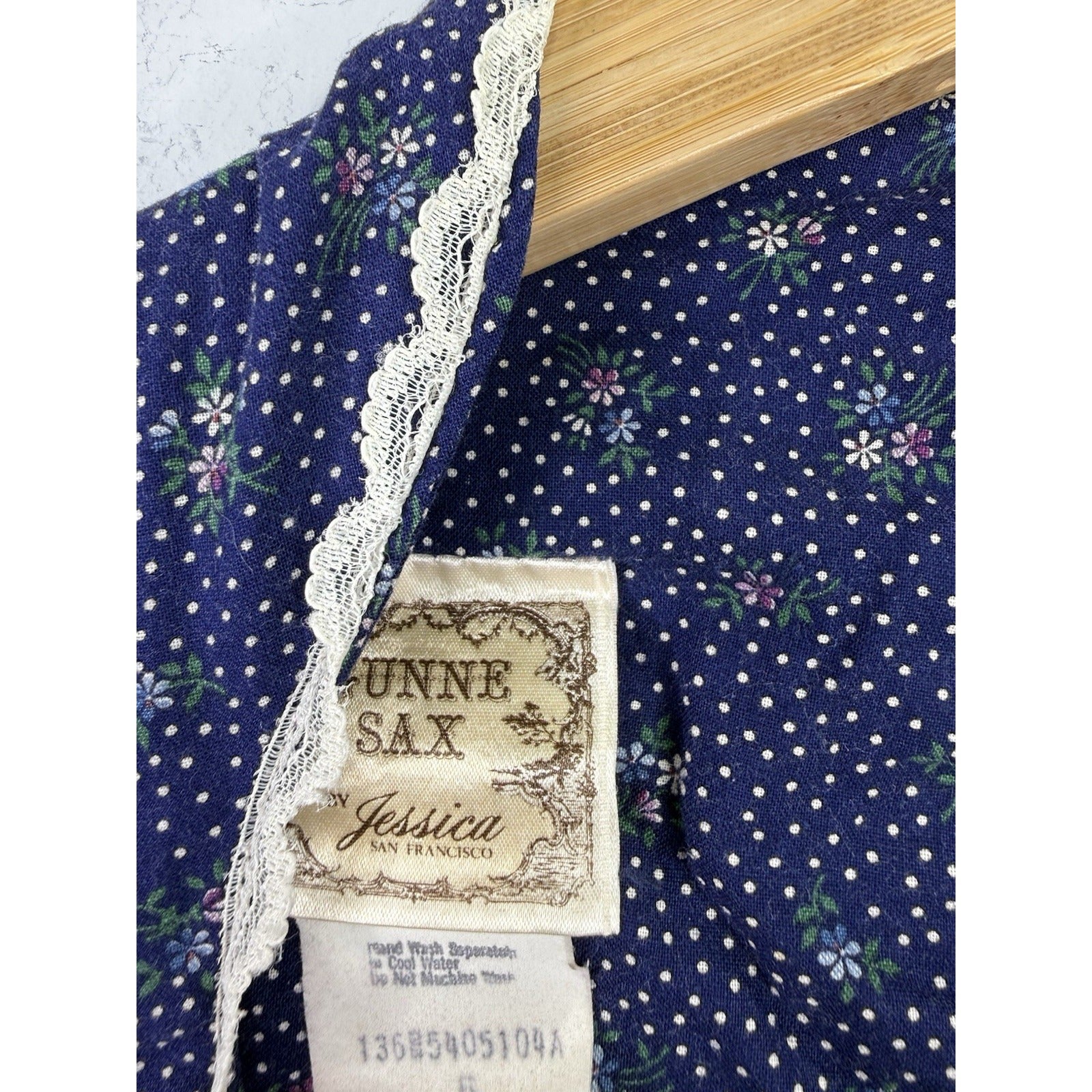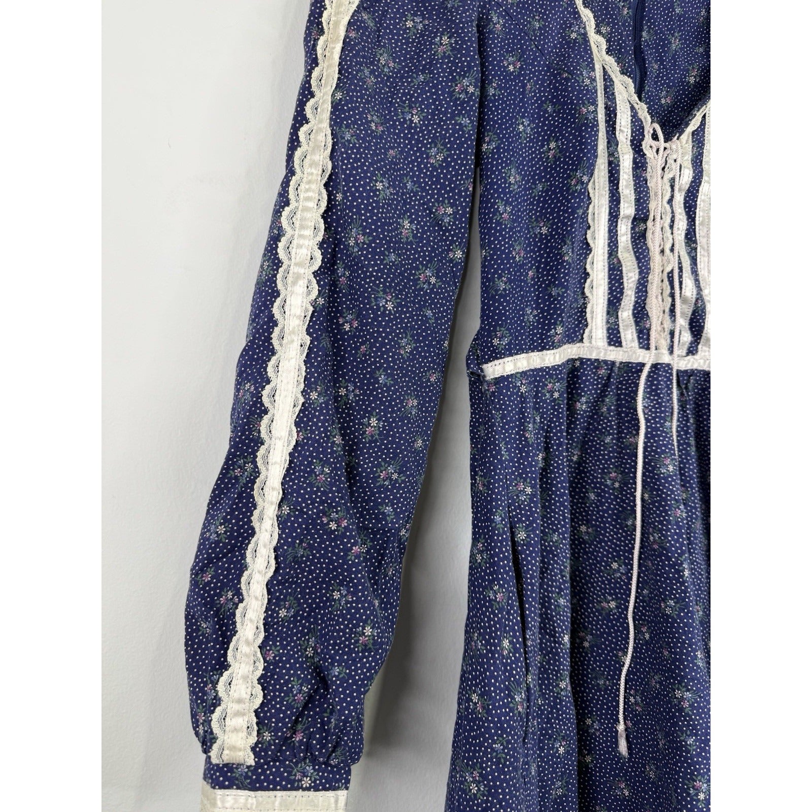 This product is a 1970's Vintage Gunne Sax Jessica McClintock Prairie Maxi Dress in navy blue floral, size 5. The dress is made of cotton and has a bohemian look, perfect for a special occasion. With its original design and production in the United States, this vintage dress embodies the style of the 1970s prairie fashion.