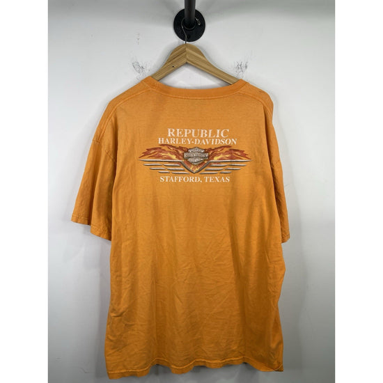 This 2006 Harley Davidson Stafford Texas Orange T-shirt in size 2XL is a regular fit men's T-shirt with a crew neck and short sleeves. Featuring the iconic Harley-Davidson brand, this vintage-inspired shirt showcases a classic motorcycle theme in a bold orange color. Perfect for Harley-Davidson enthusiasts looking to add a touch of motorcycle culture to their wardrobe, this T-shirt is a stylish and comfortable choice for any casual outfit.