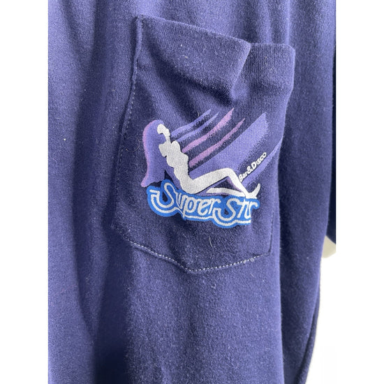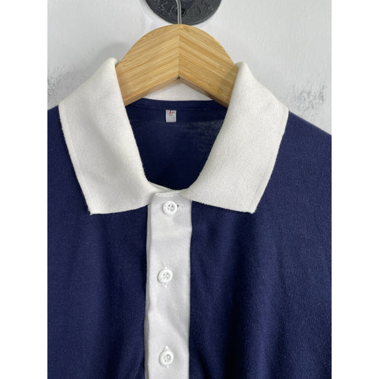 The product is a classic navy blue collared T-shirt with a graphic print of stars, designed for men. Made of cotton, this short sleeve shirt features a regular fit and is available in size L. Perfect for adding a touch of disco flair to your wardrobe, this shirt from Thailand is a stylish and comfortable addition for any casual or trendy look.