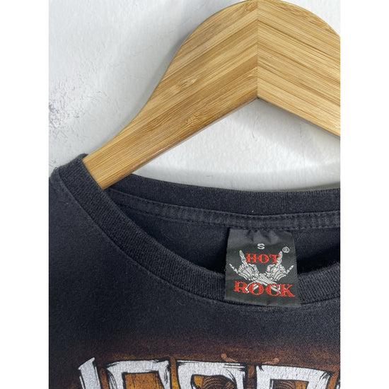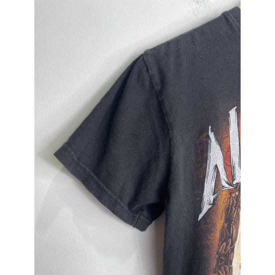 This vintage 2007 The Emptiness Alesana official band graphic black T-shirt in size S features a classic crew neck and short sleeves. Made from breathable cotton material, this regular fit shirt is perfect for all seasons and easy to care for. The black color and graphic print make it a stylish choice for any band enthusiast.