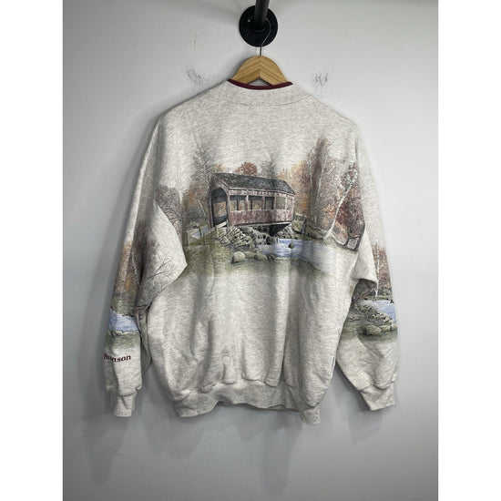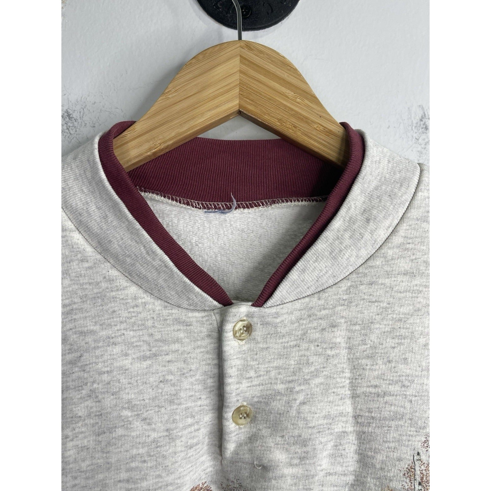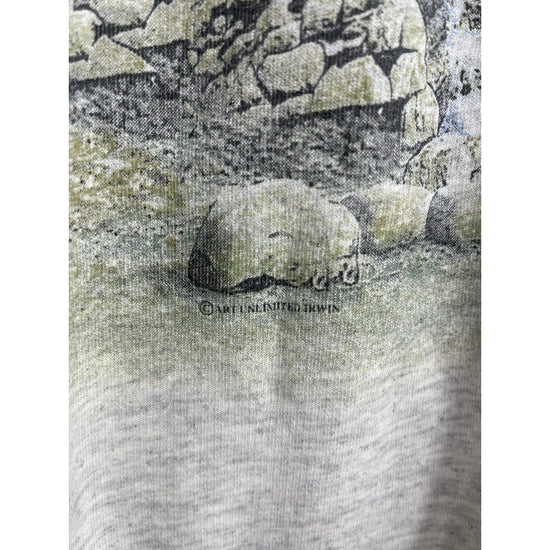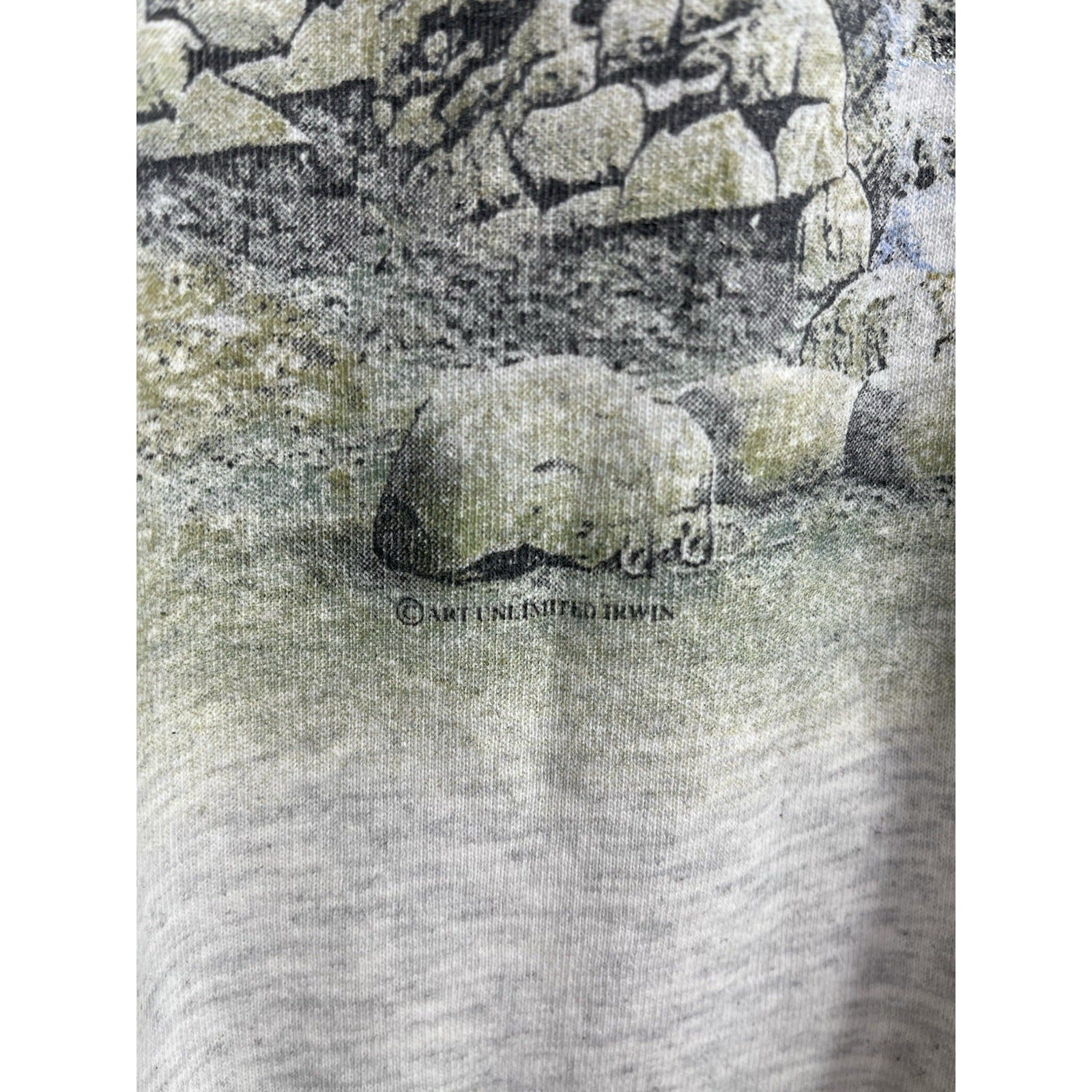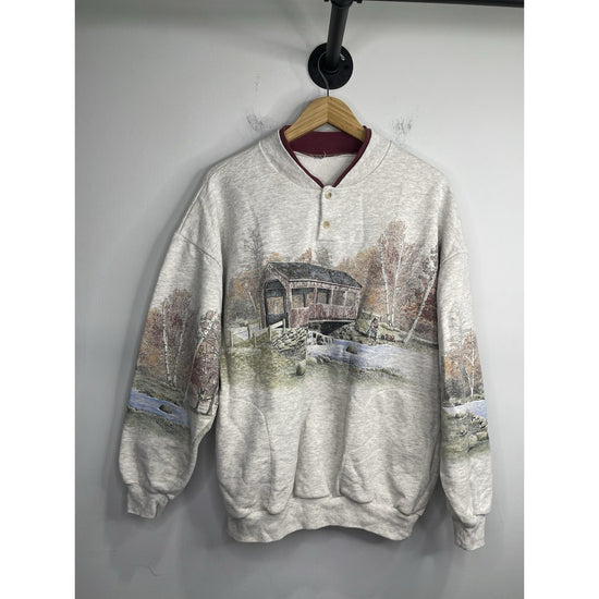 The Adult VTG Art Unlimited Sweatshirt in Fishing In The River Nature Grey 90s size XL is a vintage-inspired pullover with a crew neck and fleece fabric type. Featuring a unique artistic print depicting a scene of fishing in the river, this sweatshirt is perfect for outdoor activities like camping, hiking, and walking. It includes accents like buttons and pockets, making it both stylish and functional for the fall, winter, and spring seasons. Made of cotton and designed by Art Unlimited Sportswear, this sweatshirt is a great addition for men who appreciate a blend of art and nature in their wardrobe.