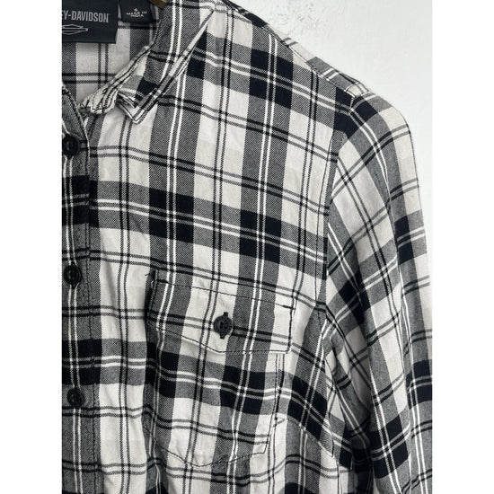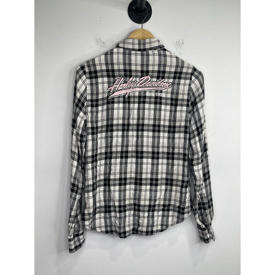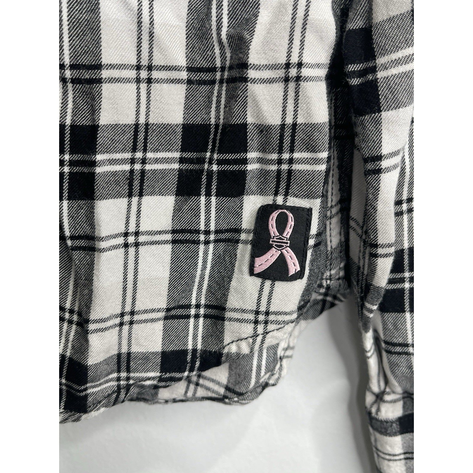 This Adult Vintage Breast Cancer Awareness Harley Davidson Plaid Button Down Shirt in size small is a stylish and colorful addition to any man's wardrobe. Made of comfortable cotton material, this shirt features a classic button-up closure, long sleeves, and a button-down collar. The plaid pattern, along with the embroidered accents and Harley-Davidson brand, gives it a unique retro and biker-themed look. Perfect for all seasons, this shirt is easy to care for and includes convenient pockets for added functionality. Perfect for casual wear or showing support for a great cause.