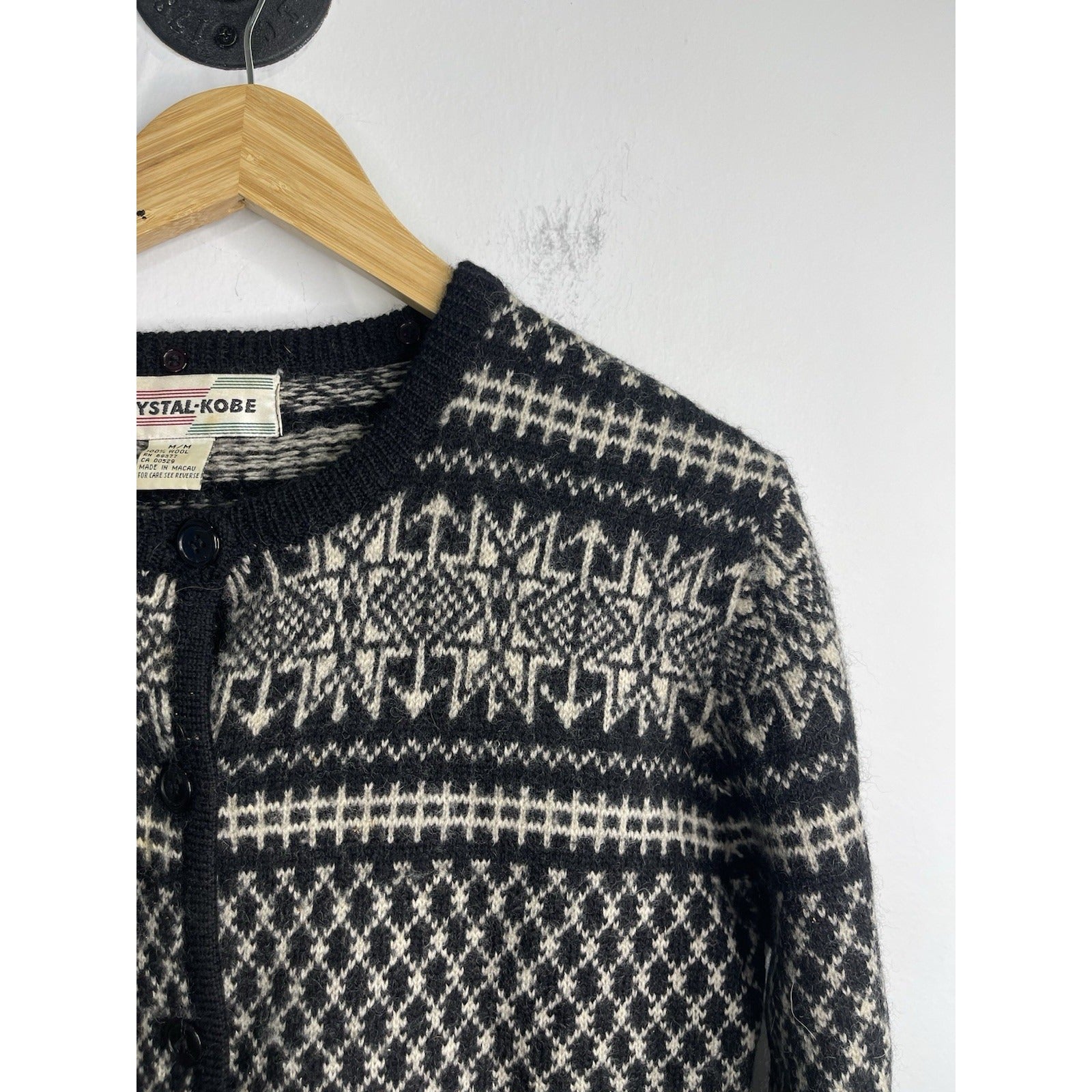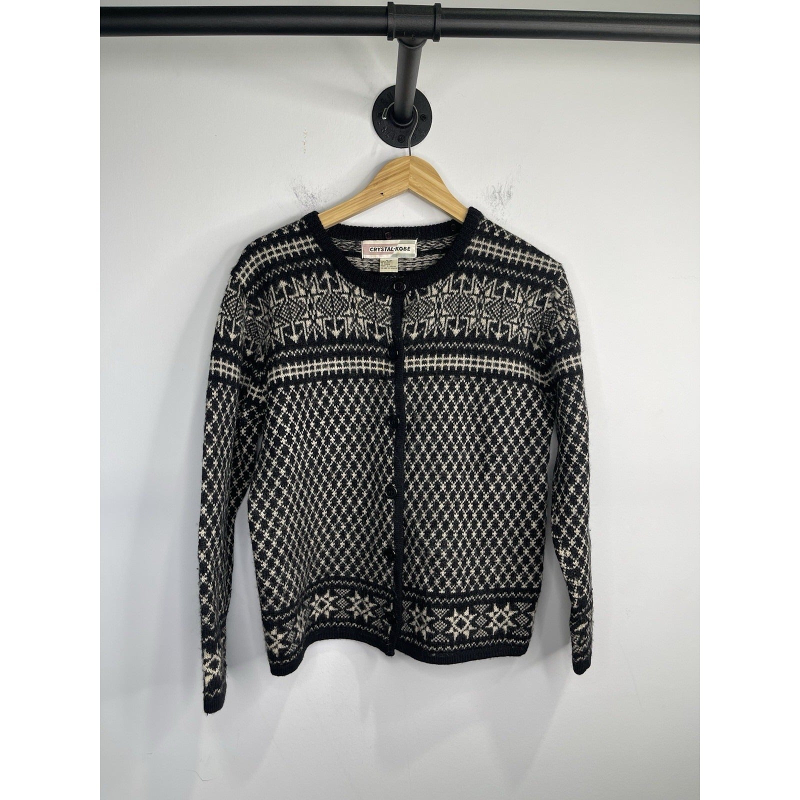 The Adult VTG Crystal Kobe Cardigan in Black is a stylish and classic addition to any woman's wardrobe. Made from 100% wool with a tight-knit fabric, this long sleeve cardigan features embroidered accents for a touch of sophistication. The hand wash only care instruction ensures the longevity and quality of this timeless piece, perfect for adding a chic layer to any outfit. Made in Mexico by the brand Crystal-Kobe, this cardigan is designed for regular sizing in women's medium.