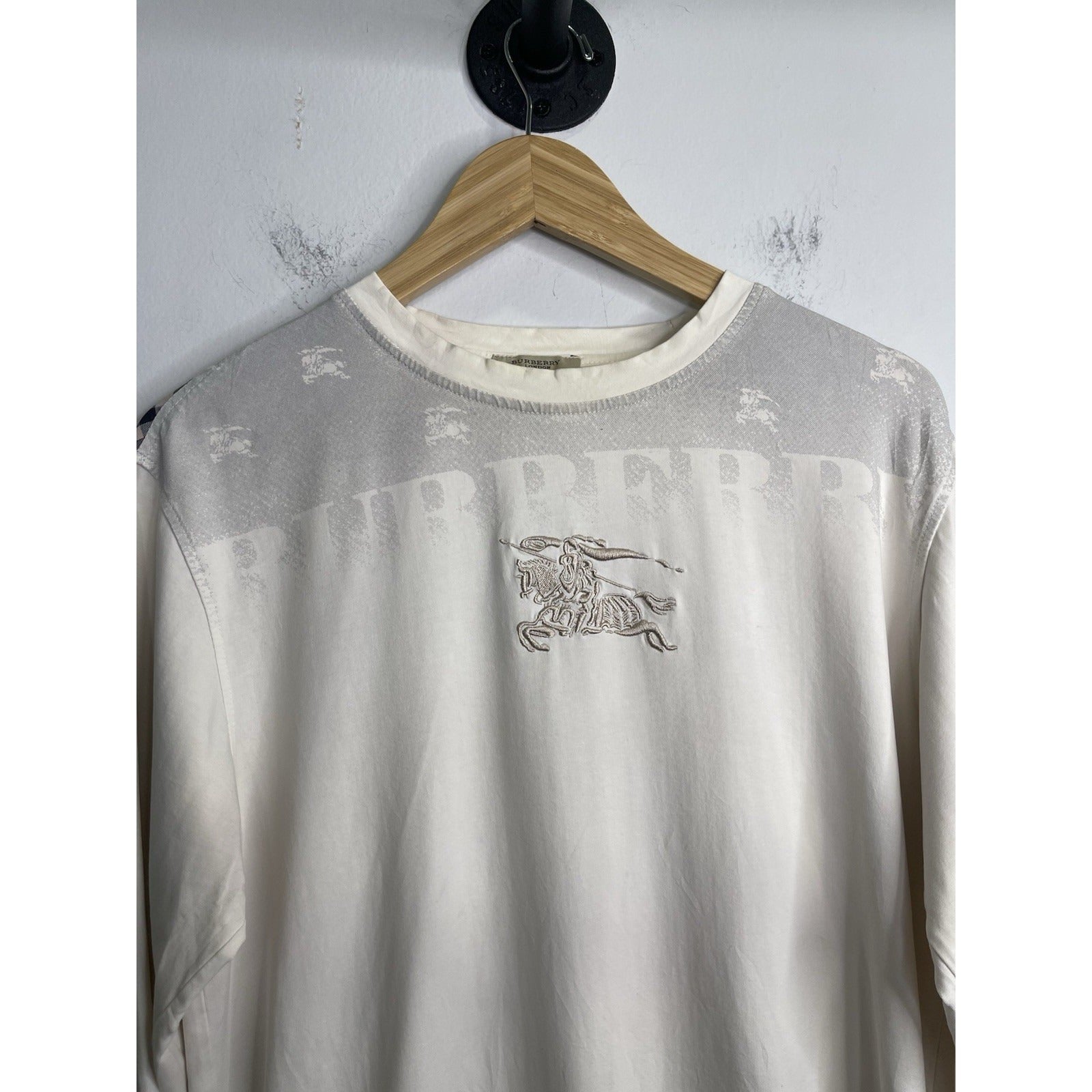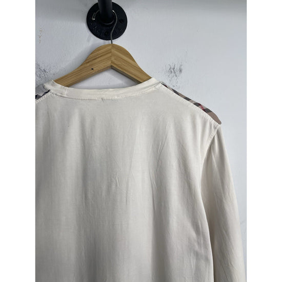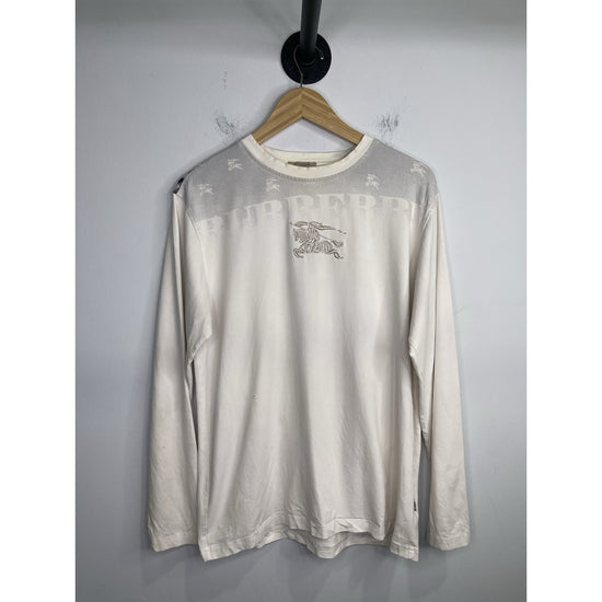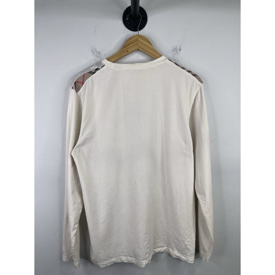The Burberry London long sleeve white t-shirt in size large is a stylish and elegant addition to any man's wardrobe. Made by the prestigious Burberry London brand, this t-shirt exudes luxury and sophistication. The long sleeves add a touch of versatility, allowing it to be worn in multiple ways depending on the occasion. The crisp white color adds a timeless and classic touch to the wardrobe, making it a must-have piece for any man looking for high-quality and fashionable clothing options.