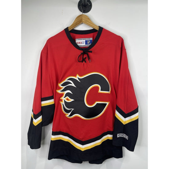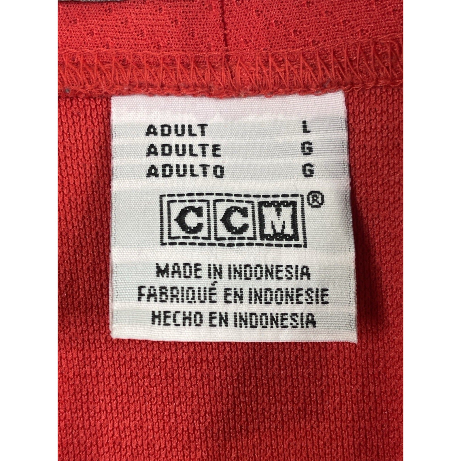 The product is a CCM Calgary Flames NHL ice hockey jersey shirt in red and black, size L. It is designed for men and represents the Calgary Flames team in the National Hockey League (NHL). This jersey shirt is perfect for fans looking to show their support for the team during regular season games. Made with quality materials, this officially licensed fan apparel is ideal for hockey enthusiasts wanting to represent their favorite team on and off the ice.