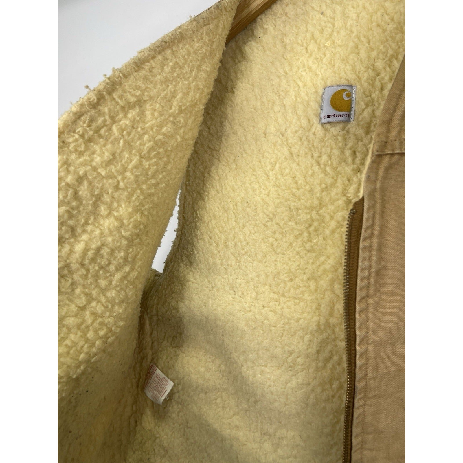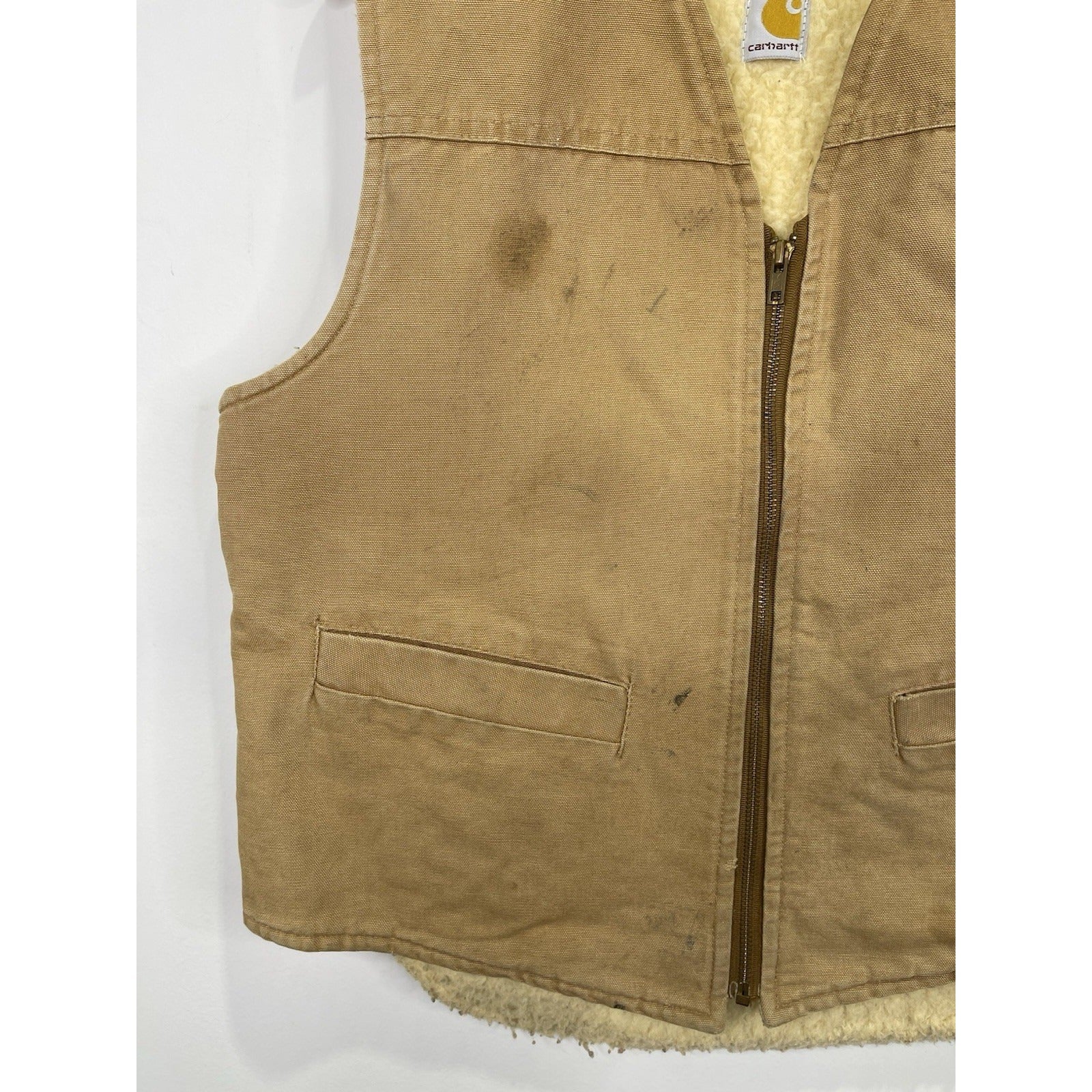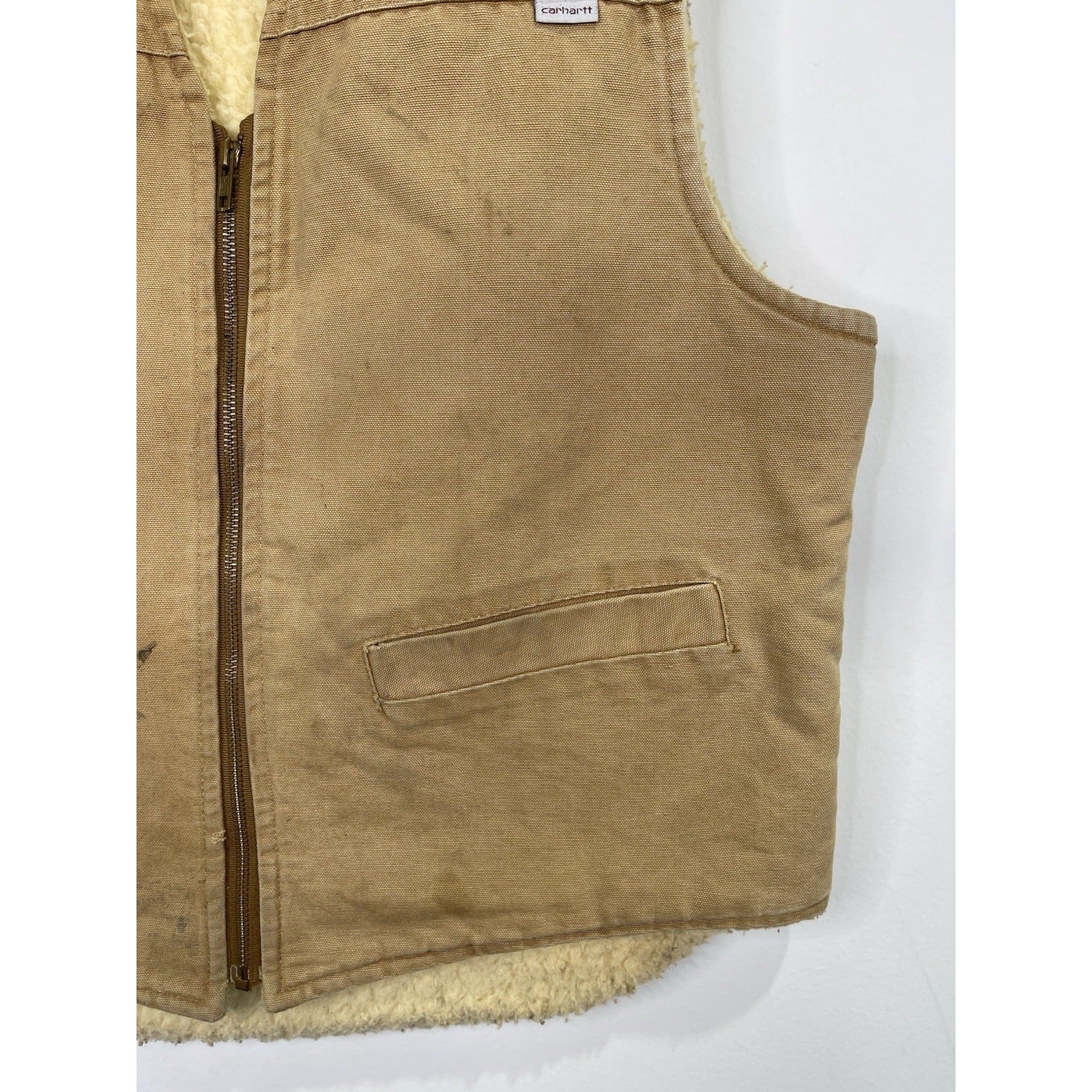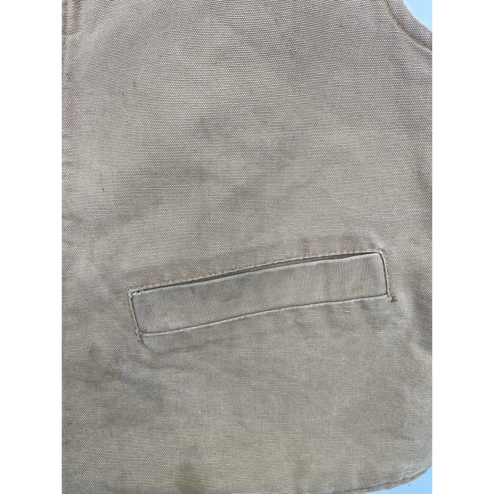 The Carhartt Duck Work Vest in USA-made Camel Brown is a vintage collectible piece featuring a solid pattern and zipper closure. Made of 100% cotton duck canvas, this medium-sized vest is perfect for workwear or casual occasions. Insulated and durable, this bomber bullet-style vest is a unique addition to any collection. The Carhartt brand ensures quality craftsmanship and a classic design that will stand the test of time.