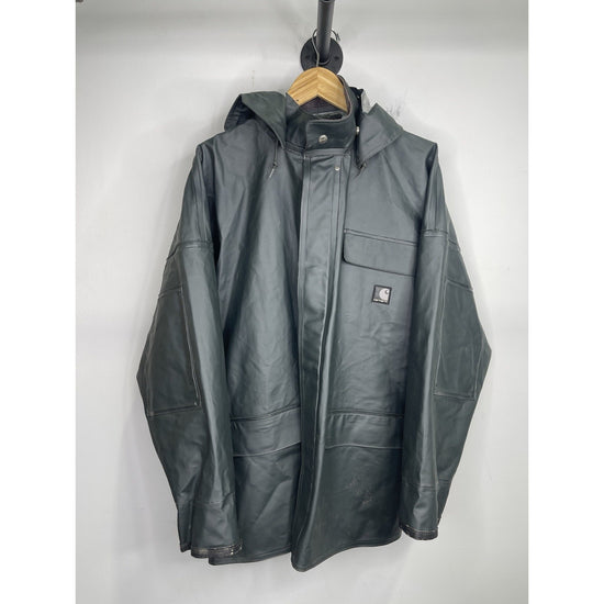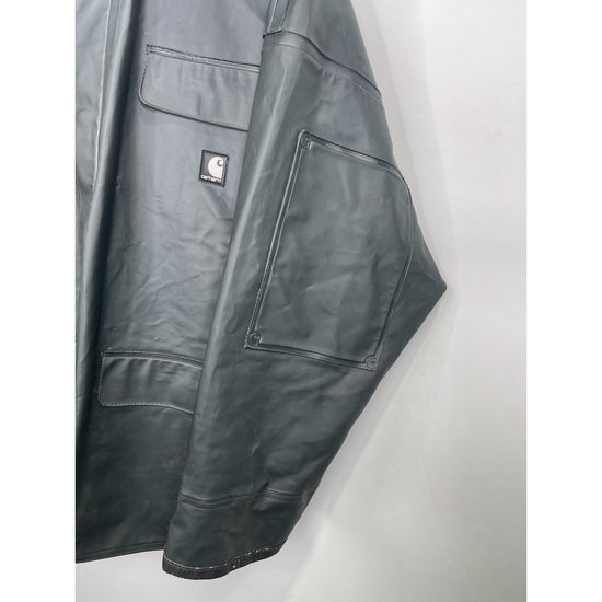 The Carhartt Green Waterproof PVC Hooded Jacket in size large is a durable and practical outerwear option for men. Made with PVC outer shell material and lined with polyester, this jacket features a solid green color and a hooded collar for added protection. With button and snap closures, it is suitable for travel, casual wear, and workwear, making it a versatile choice for various occasions. The Carhartt brand ensures quality and reliability, while the waterproof feature makes it ideal for winter, fall, and spring seasons. Perfect for outdoor activities and staying warm in unpredictable weather conditions.