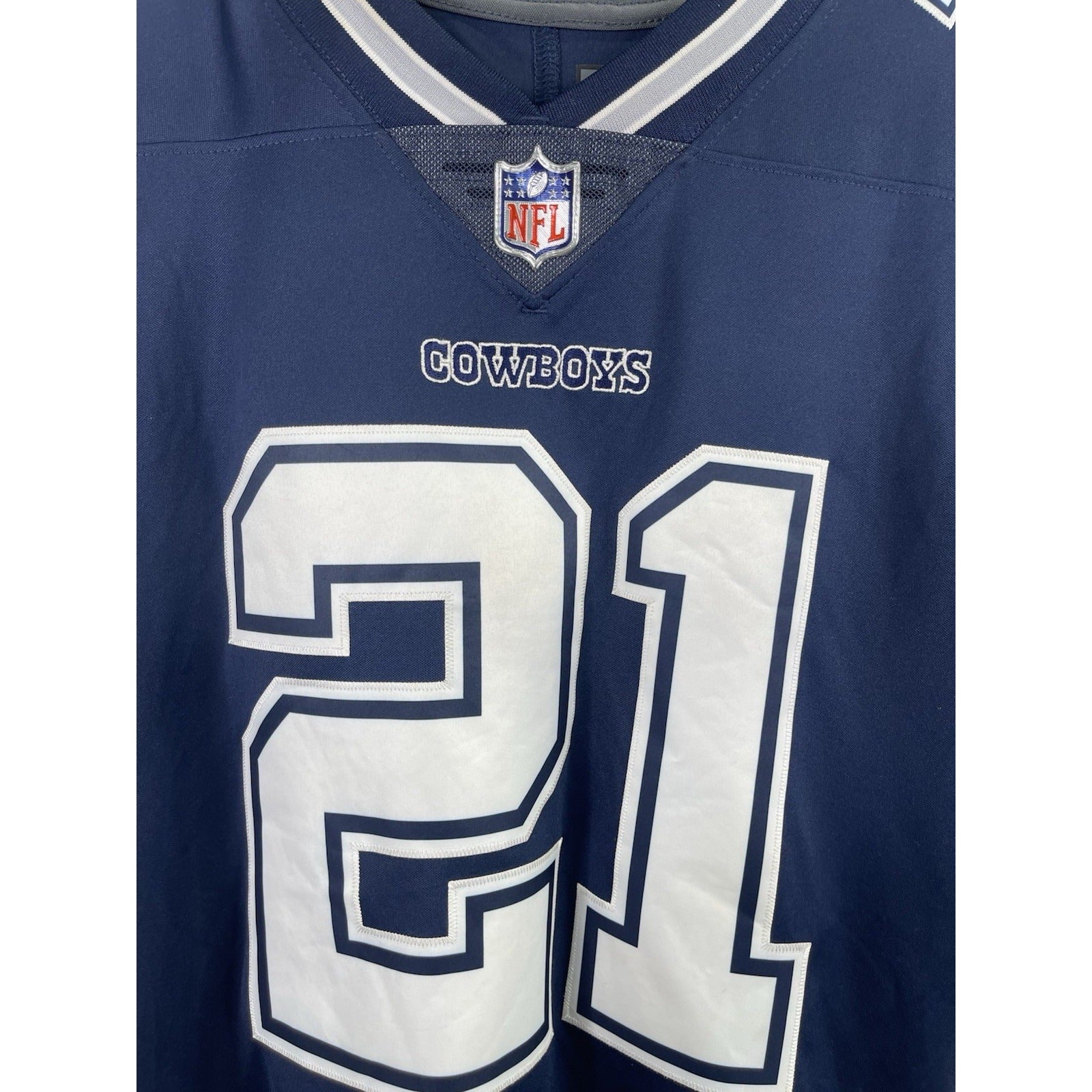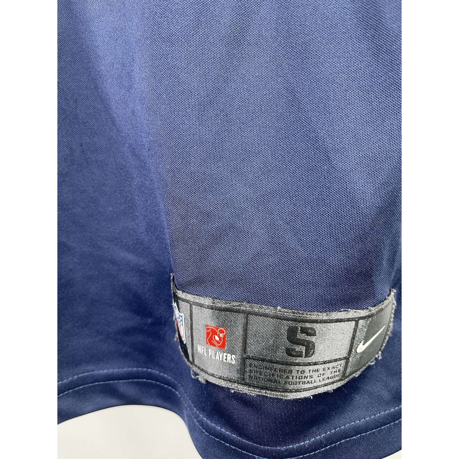 The product is a Nike Ezekiel Elliott Dallas Cowboys NFL on-field blue jersey in Men's size small. This officially licensed jersey is perfect for any football fan looking to support the Dallas Cowboys and one of their star players, Ezekiel Elliott. Made in Guatemala, this jersey is designed for the regular season games and features the iconic Dallas Cowboys team colors and logos. Perfect for showing team pride at home or during game days.