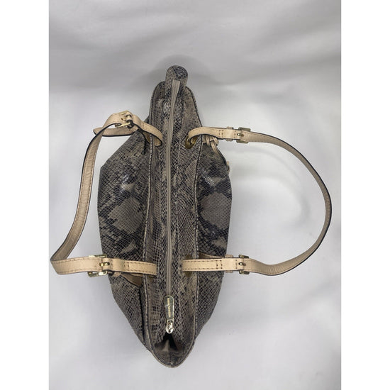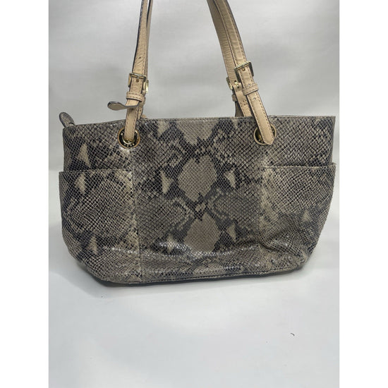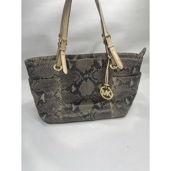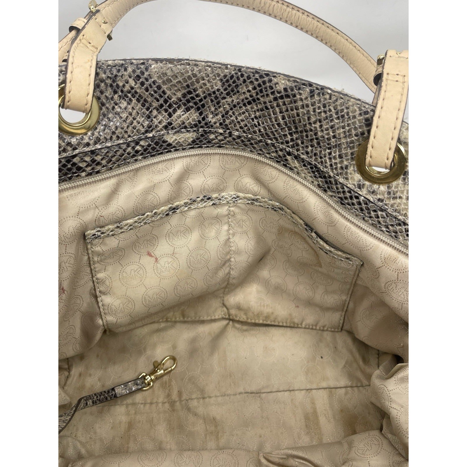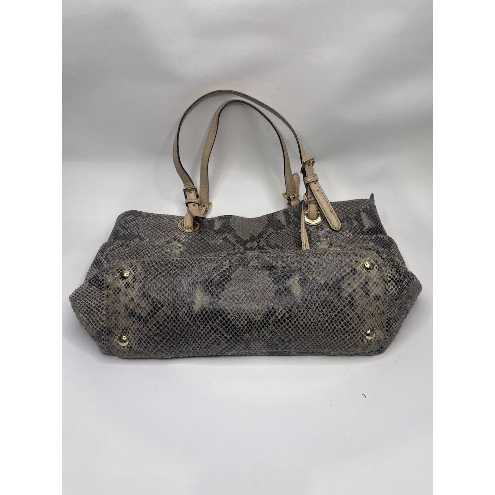 The Gray Michael Kors Women's Python Jet Exotic Travel Shoulder Bag is a stylish and practical accessory for travel. Made with suede exterior material in a beige color with animal print pattern, this medium-sized rectangular bag features a zip closure and silver hardware. The brown leather handle/strap adds a touch of luxury, while the interior is lined with polyester and includes inner pockets for organization. This shoulder bag from the Michael Kors Python collection is a perfect blend of fashion and functionality for the modern woman on the go.