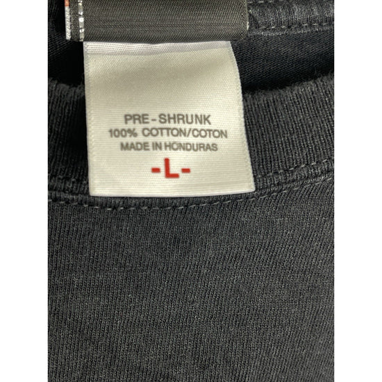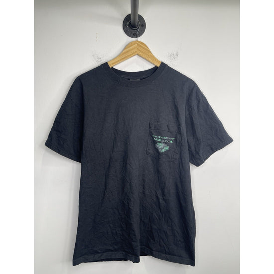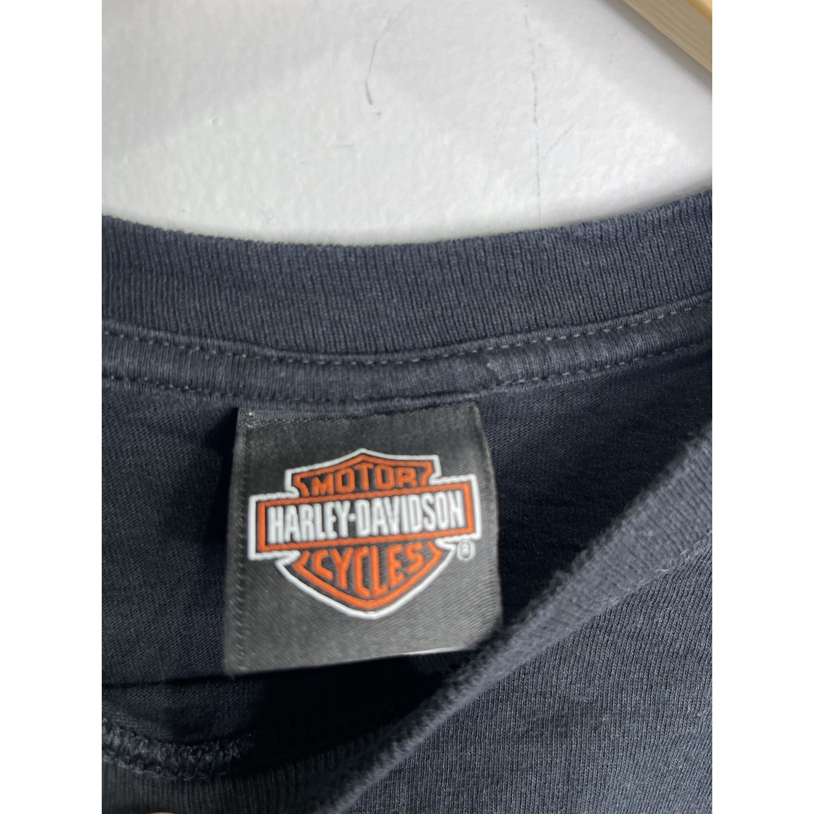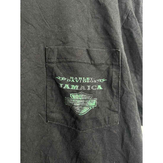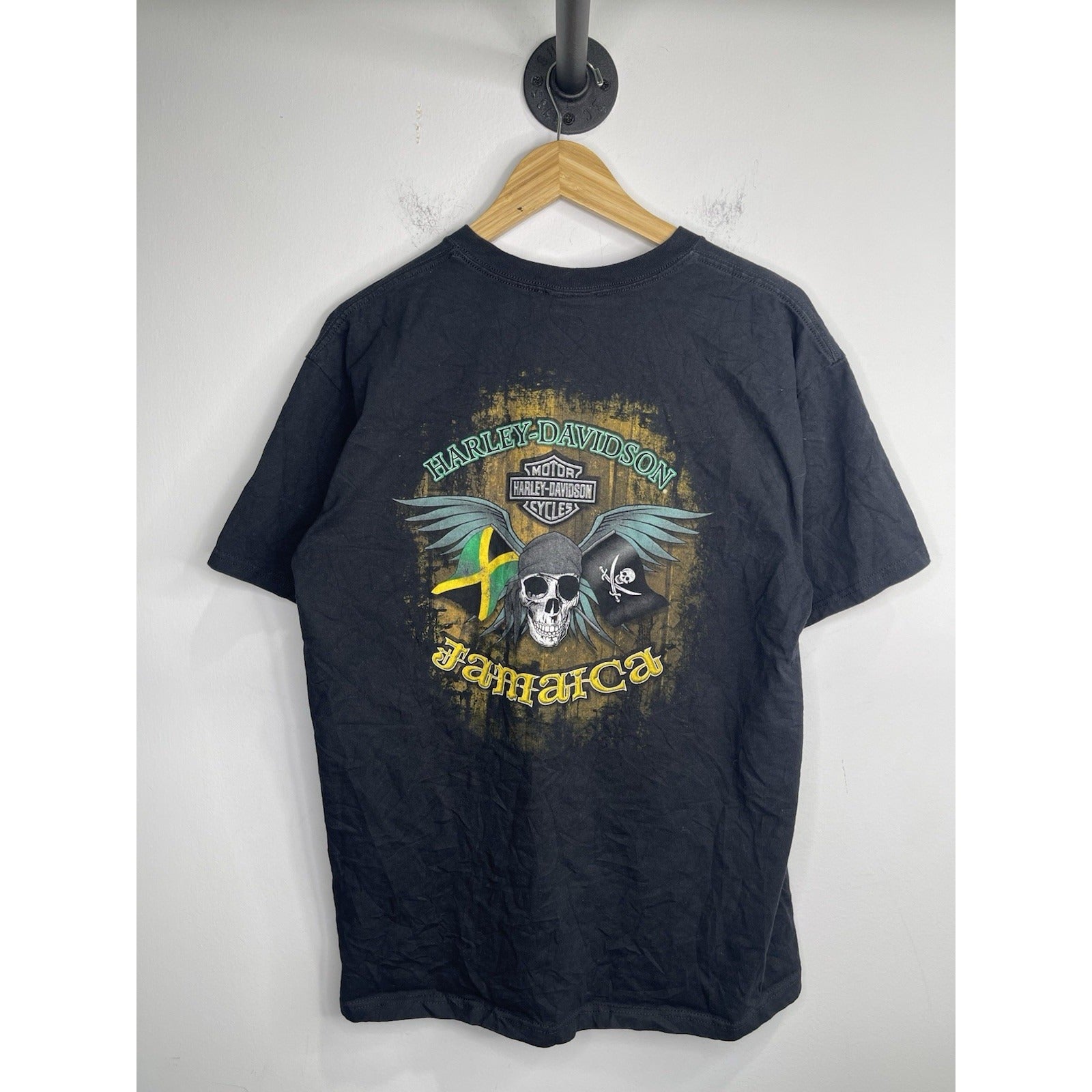 The product is a Harley Davidson Black T-Shirt featuring a pirate skull design from Jamaica. This crew neck shirt in size L is made of knit cotton fabric with a double-sided graphic print. The shirt is suitable for the seasons of summer, fall, and spring and is machine washable. It is part of the Harley Davidson product line and embodies the themes of motorcycle, skull, pirate, flag, and jolly roger. Perfect for Harley Davidson enthusiasts who appreciate a unique and edgy style.