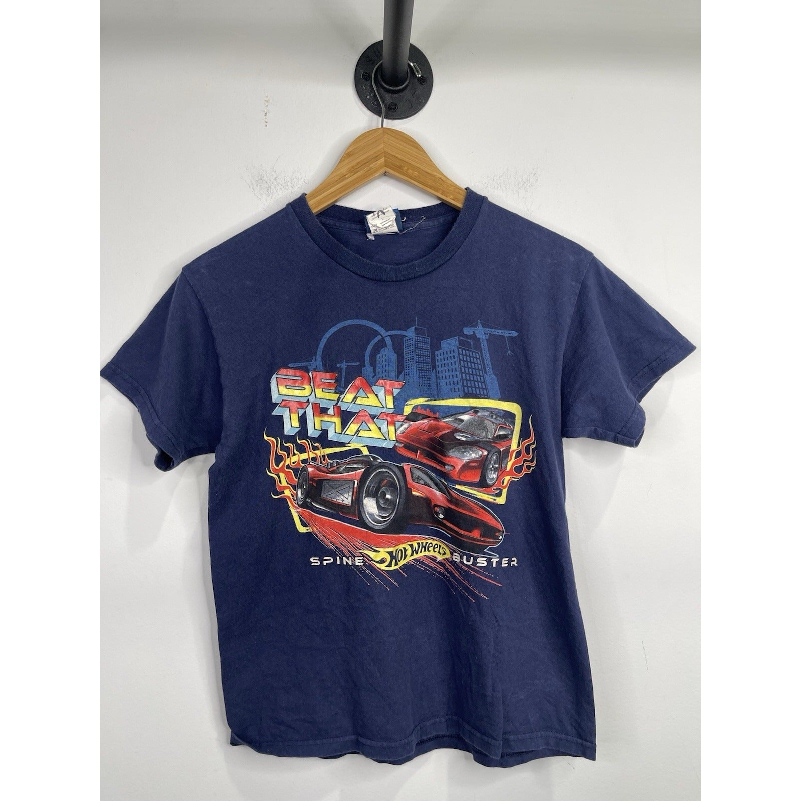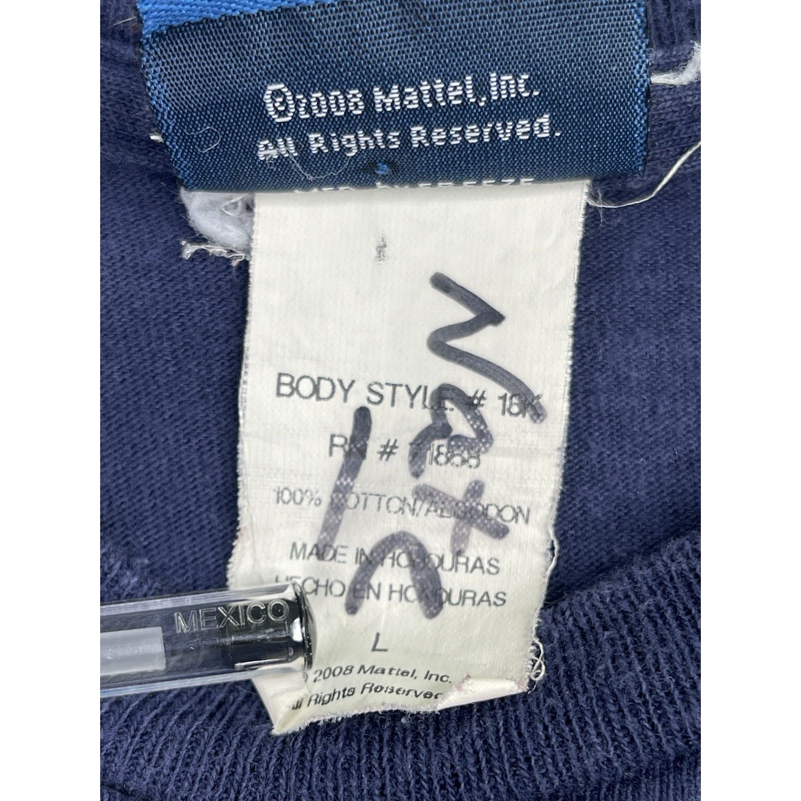 The Hot Wheels 2008 Blue T-shirt for boys in size Large features a graphic print of the iconic Hot Wheels character, with a logo accent on the front. This vintage-inspired pullover shirt has short sleeves, a crew neck, and is made of comfortable cotton material. The blue color and regular fit make it a versatile option for all seasons, perfect for young boys who love cars and racing.