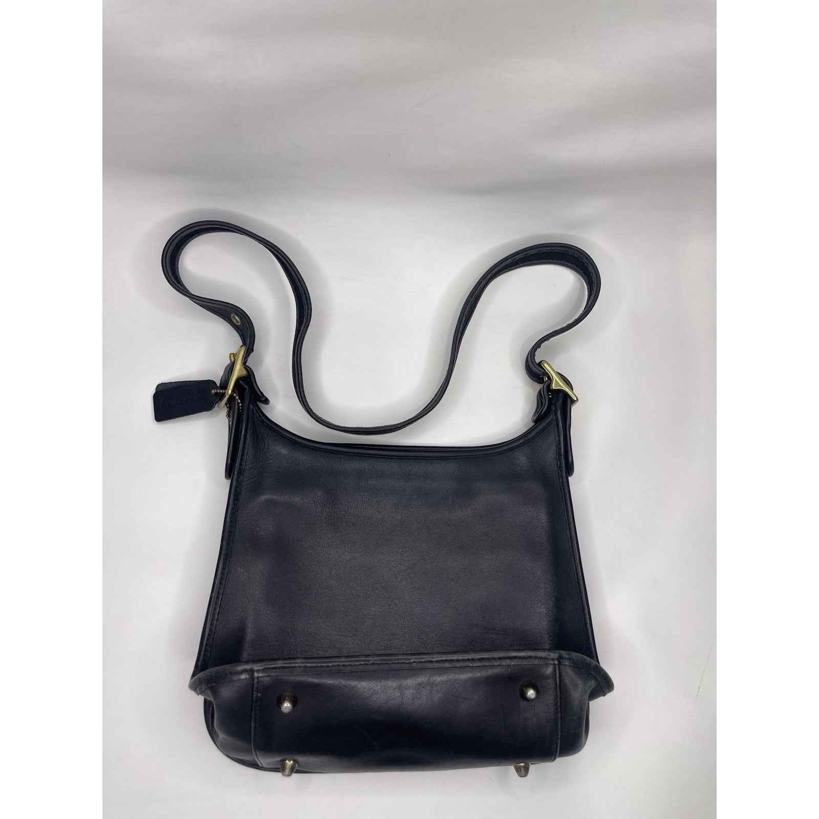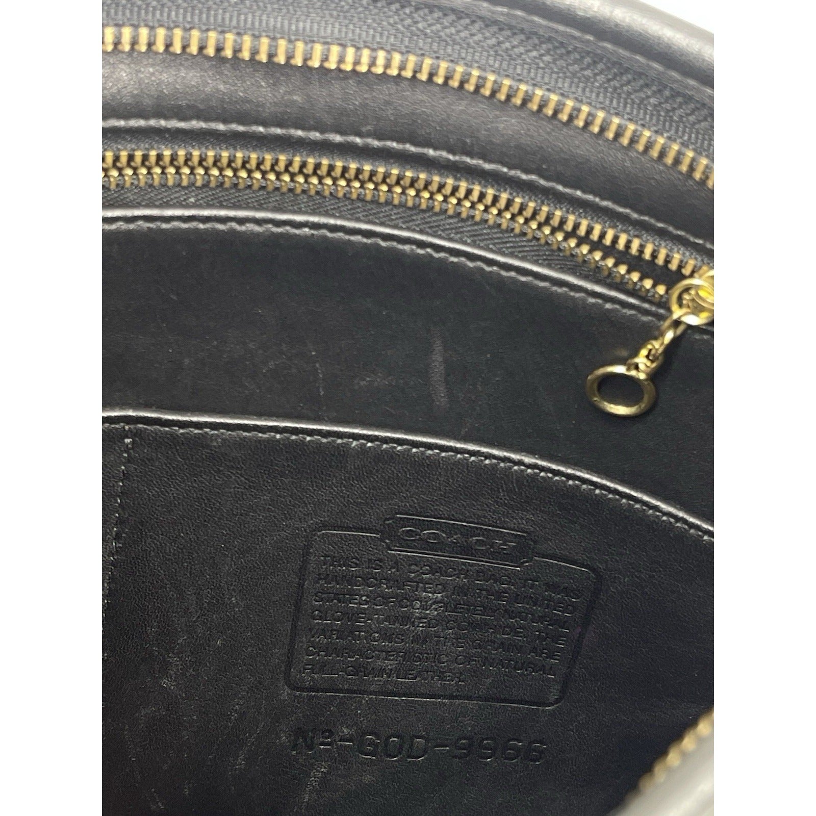 The Leather Coach Purse #9966 Vintage Made In USA Black Shoulder Bag is a classic medium-sized shoulder bag crafted from butter-soft black leather. It features a square shape, zip closure, and a black shoulder strap with a brass hardware accent. The unlined interior includes inner pockets and an adjustable strap, making it a versatile accessory suitable for travel or casual occasions. With a vintage design from the 80s and 90s, this Coach Legacy purse is a timeless piece that embodies American craftsmanship and style.