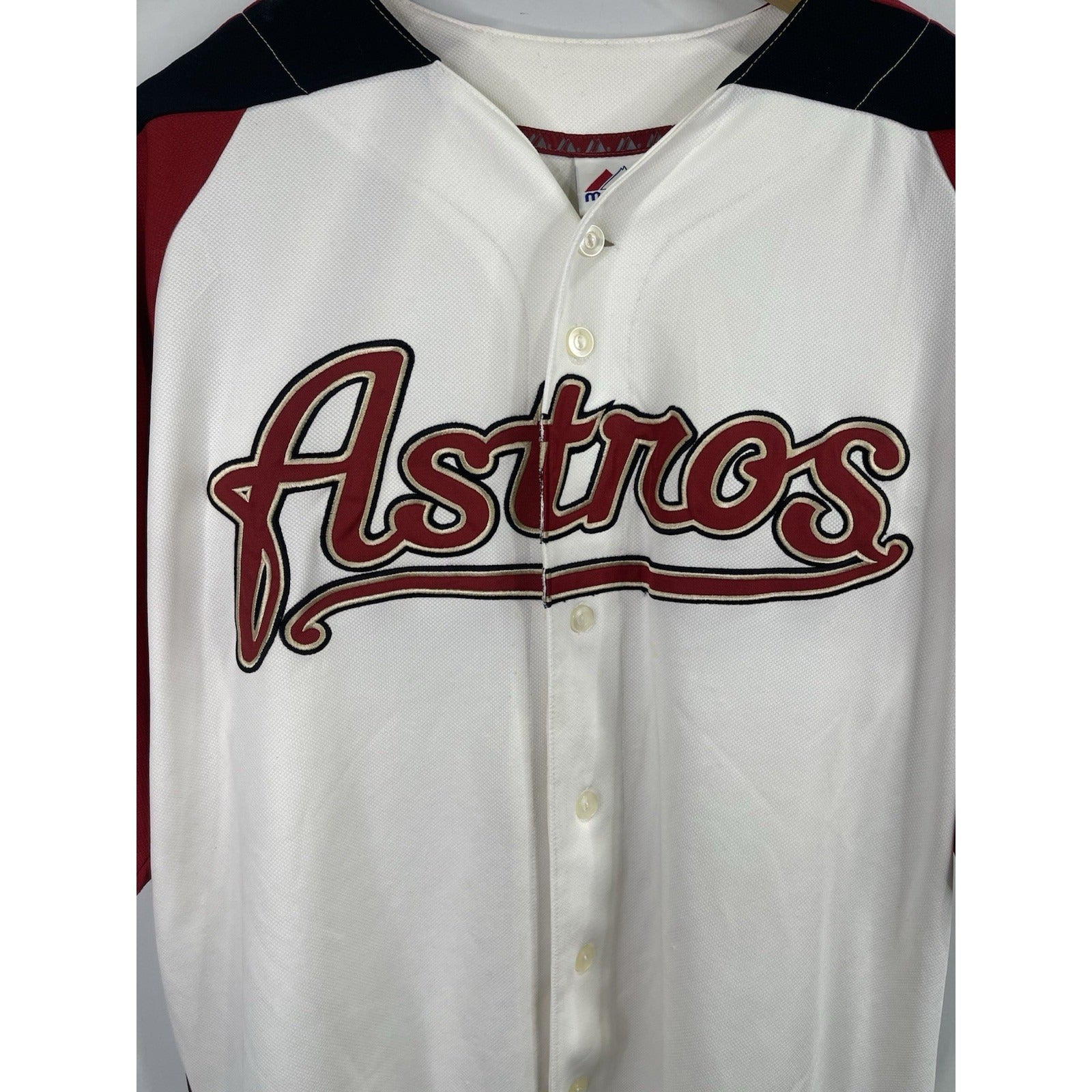 This product is a majestic men's Houston Astros 2000's white/red jersey in size XL. It is officially licensed by Major League Baseball (MLB) and features the Houston Astros team logo. The jersey is perfect for fans of the team looking to show their support and represent their favorite Major League Baseball club during game days or casual outings. The white color and official team branding make it a stylish and comfortable option for any baseball fan.