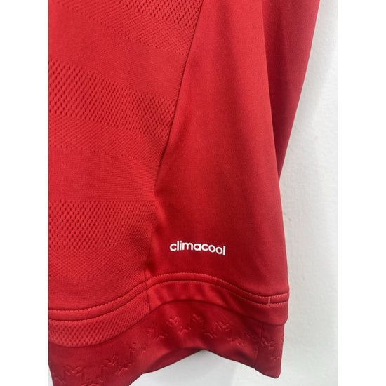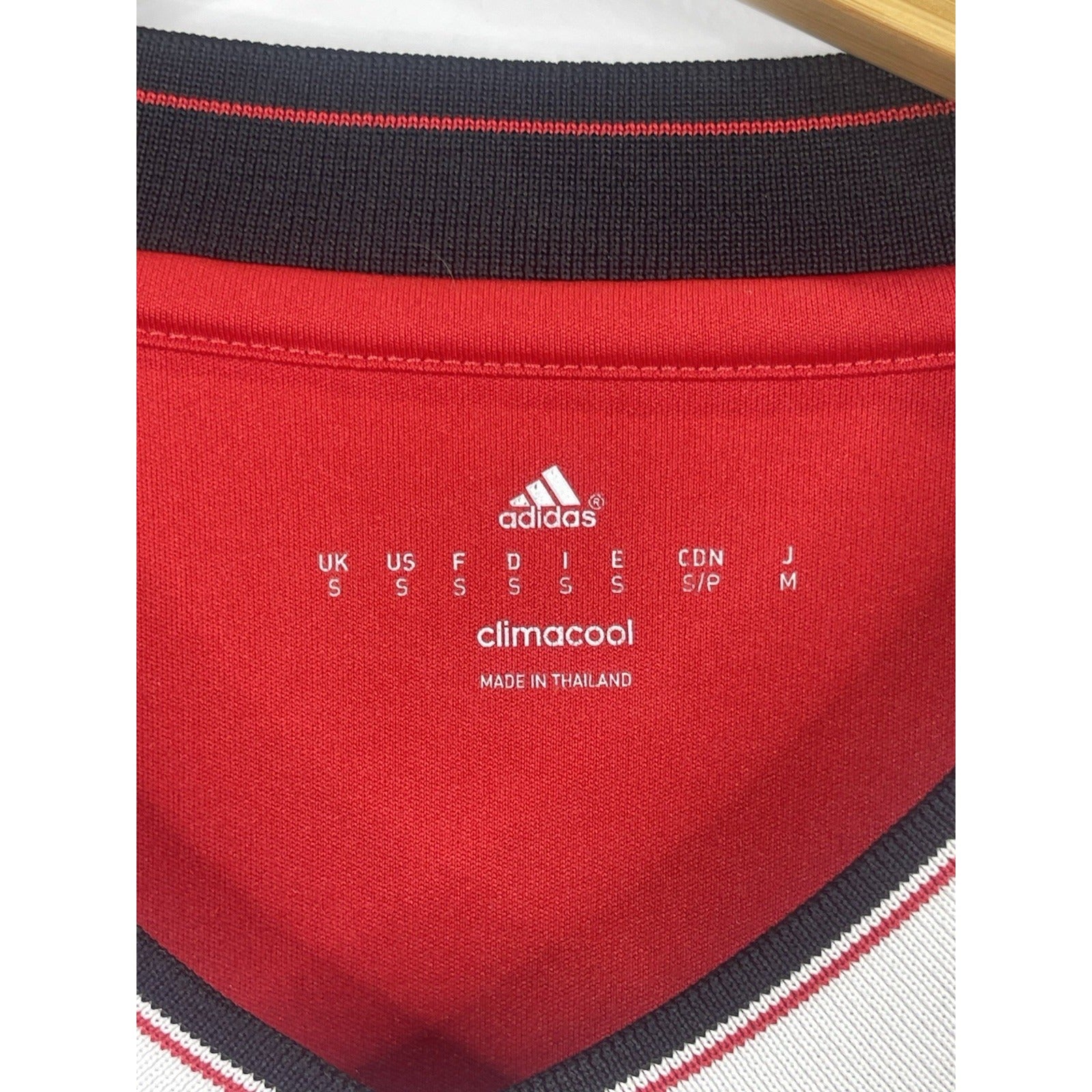 The Manchester United Home 2015/2016 Adidas Soccer Jersey in size S is an officially licensed product featuring the iconic red color of the team's jersey. Made by Adidas in Thailand, this jersey is designed for men and represents the Premier Liga team. With a capacity of less than 8 oz, this jersey is perfect for fans looking to show support for Manchester United during matches and events.