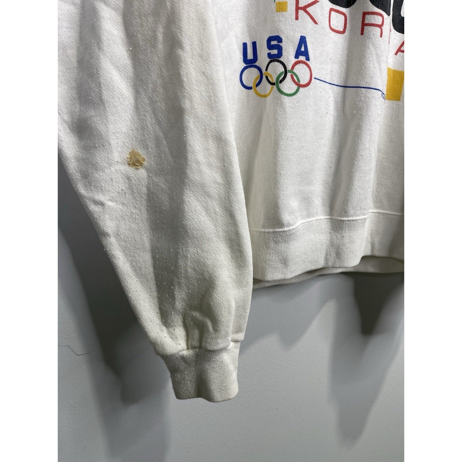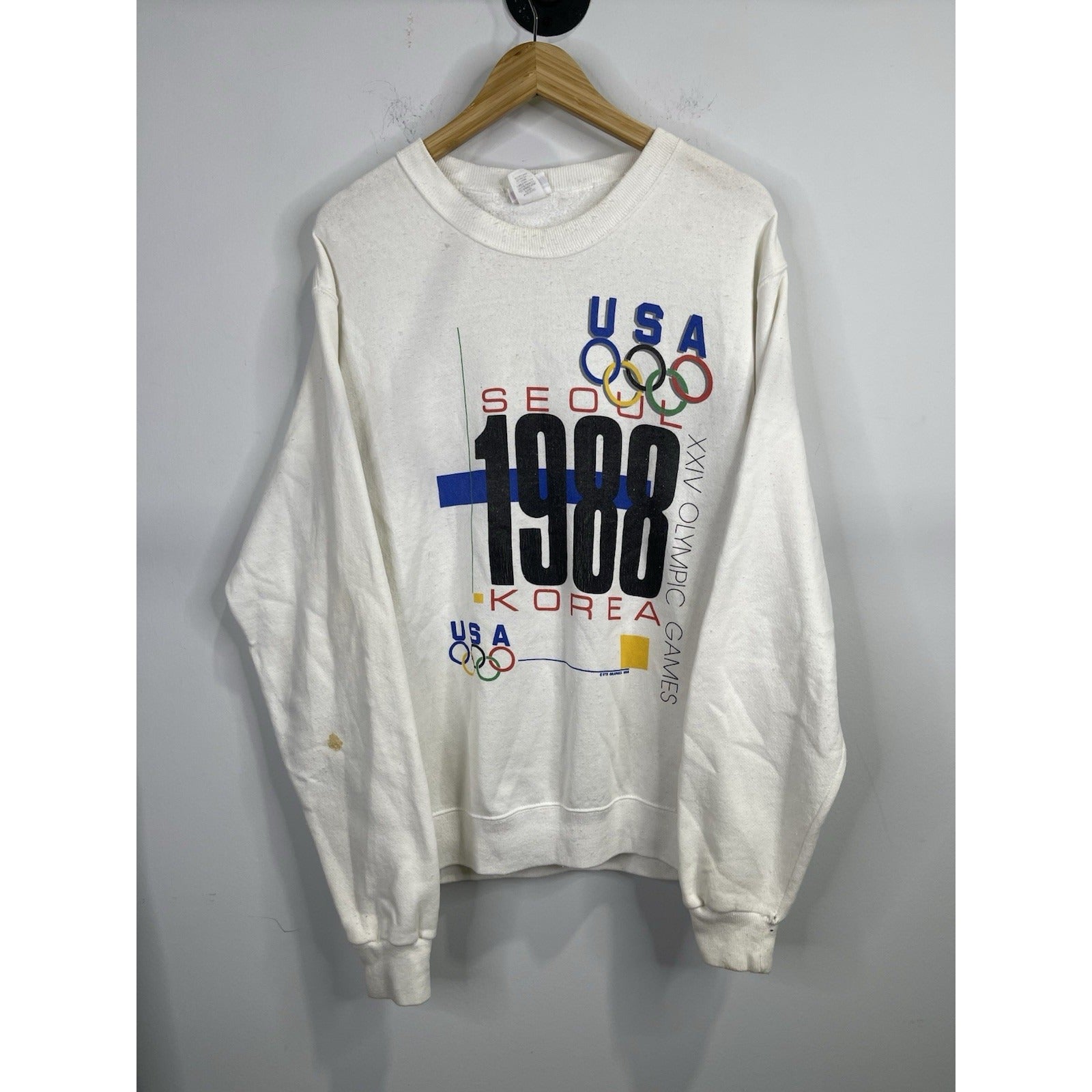 The Men's 1988 Seoul Olympics Sweatshirt in size XL is a vintage piece featuring the Team USA graphics, officially licensed by the Bassett-Walker brand. Made in the United States, this white sweatshirt represents a nostalgic tribute to the historic event. It is a stylish and comfortable way for fans of the Olympics and Team USA to show their support for the American team during the 1988 games. Perfect for collectors or enthusiasts looking to add a unique piece of sports memorabilia to their wardrobe.