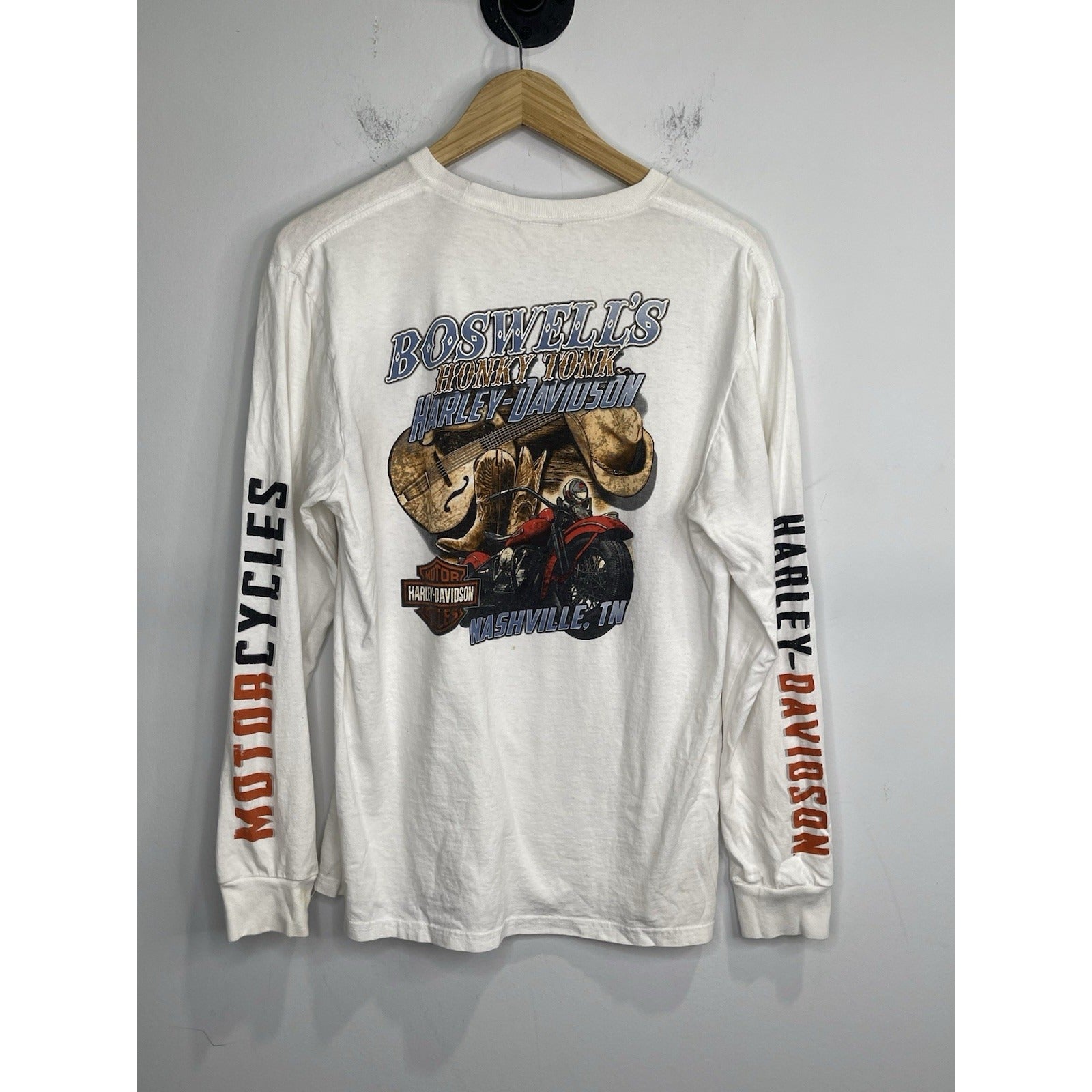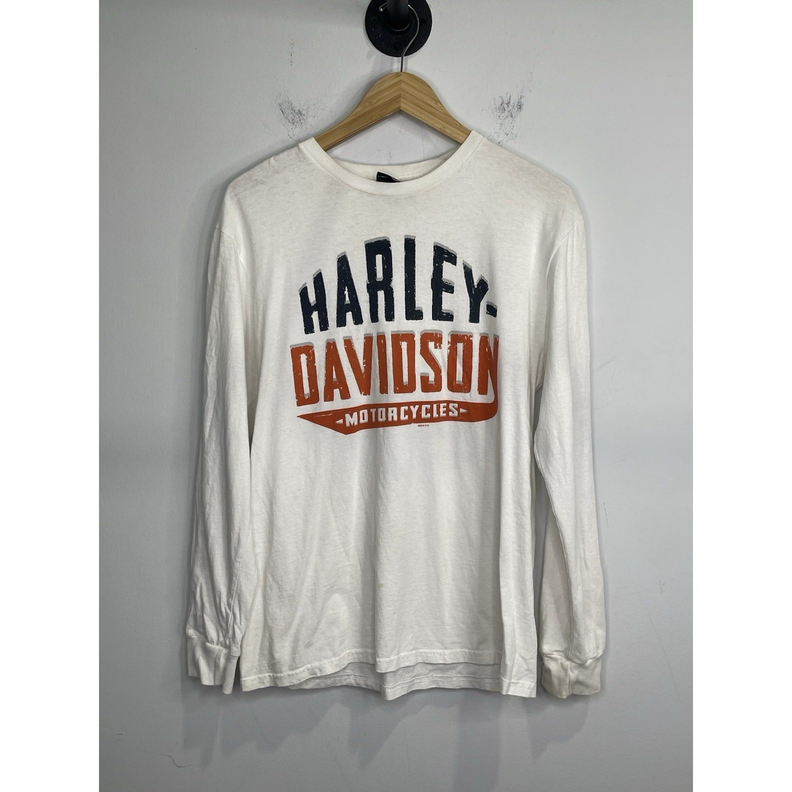 The product is a men's long sleeve graphic shirt featuring the iconic Harley Davidson brand. The shirt is in a classic white color with a size medium, making it a perfect addition to any Harley-Davidson enthusiast's collection. Made by Harley-Davidson, this shirt showcases the timeless American motorcycle brand with a stylish design that is sure to be a standout piece in any wardrobe.