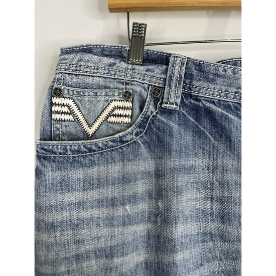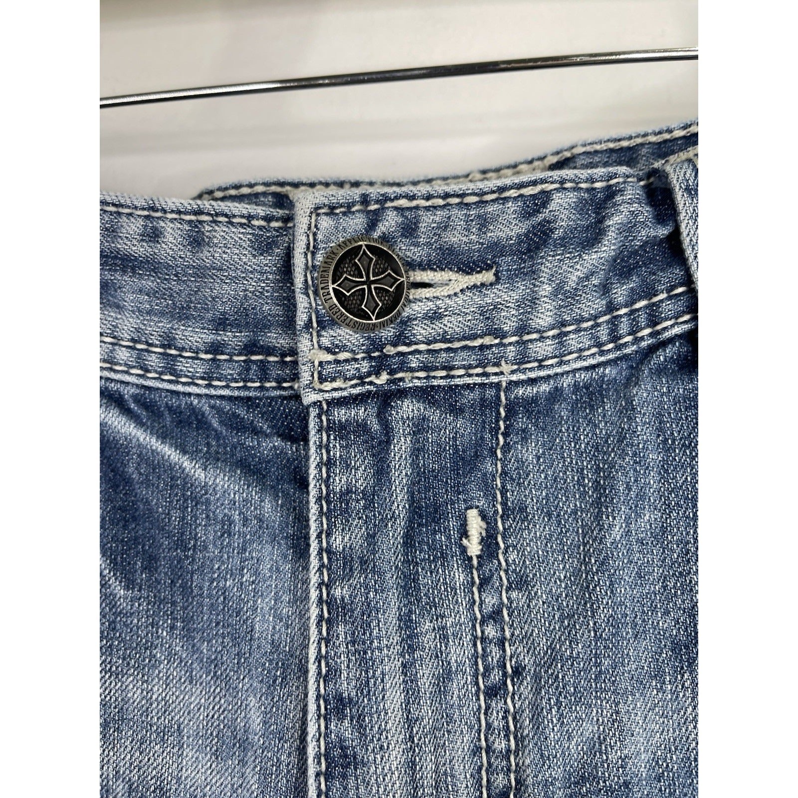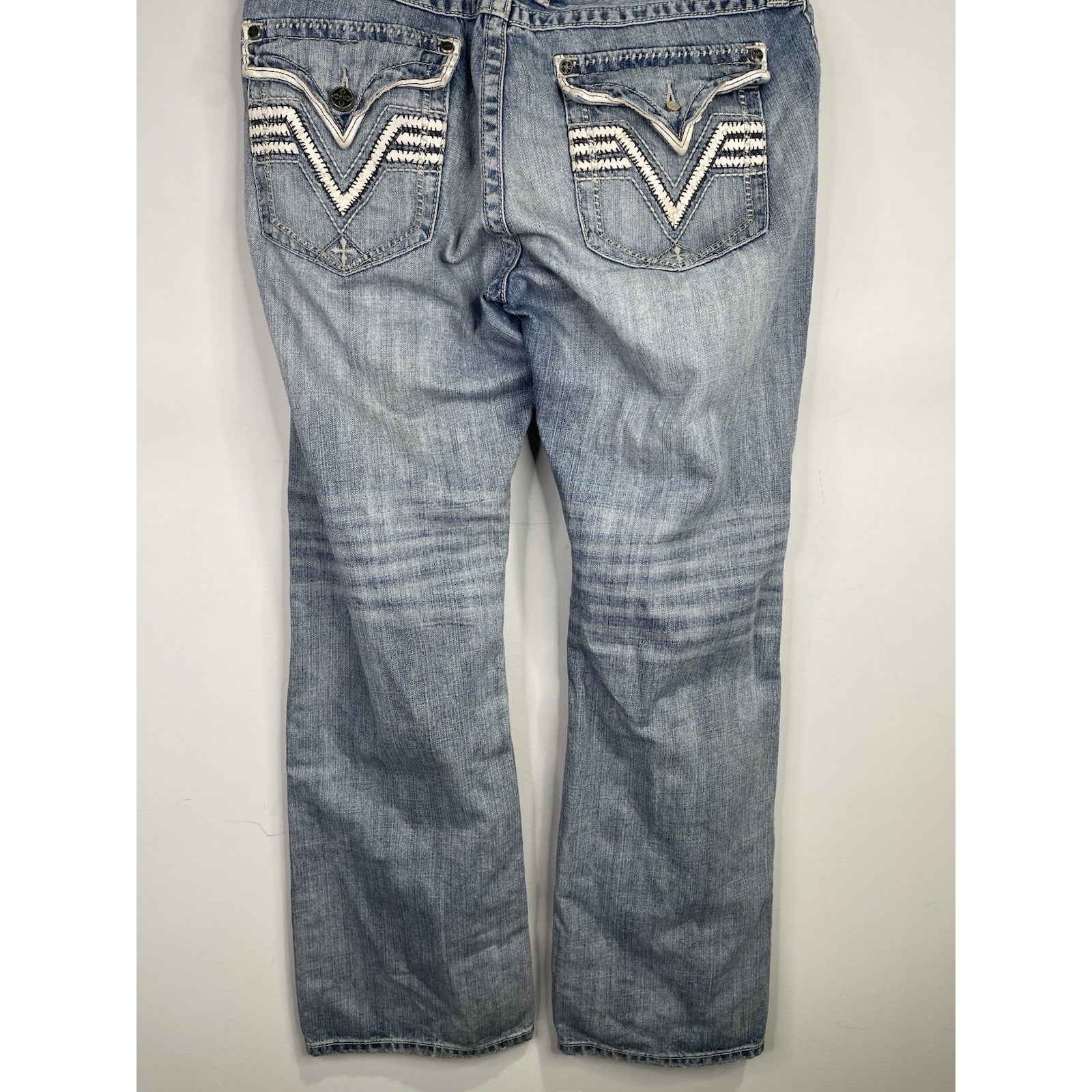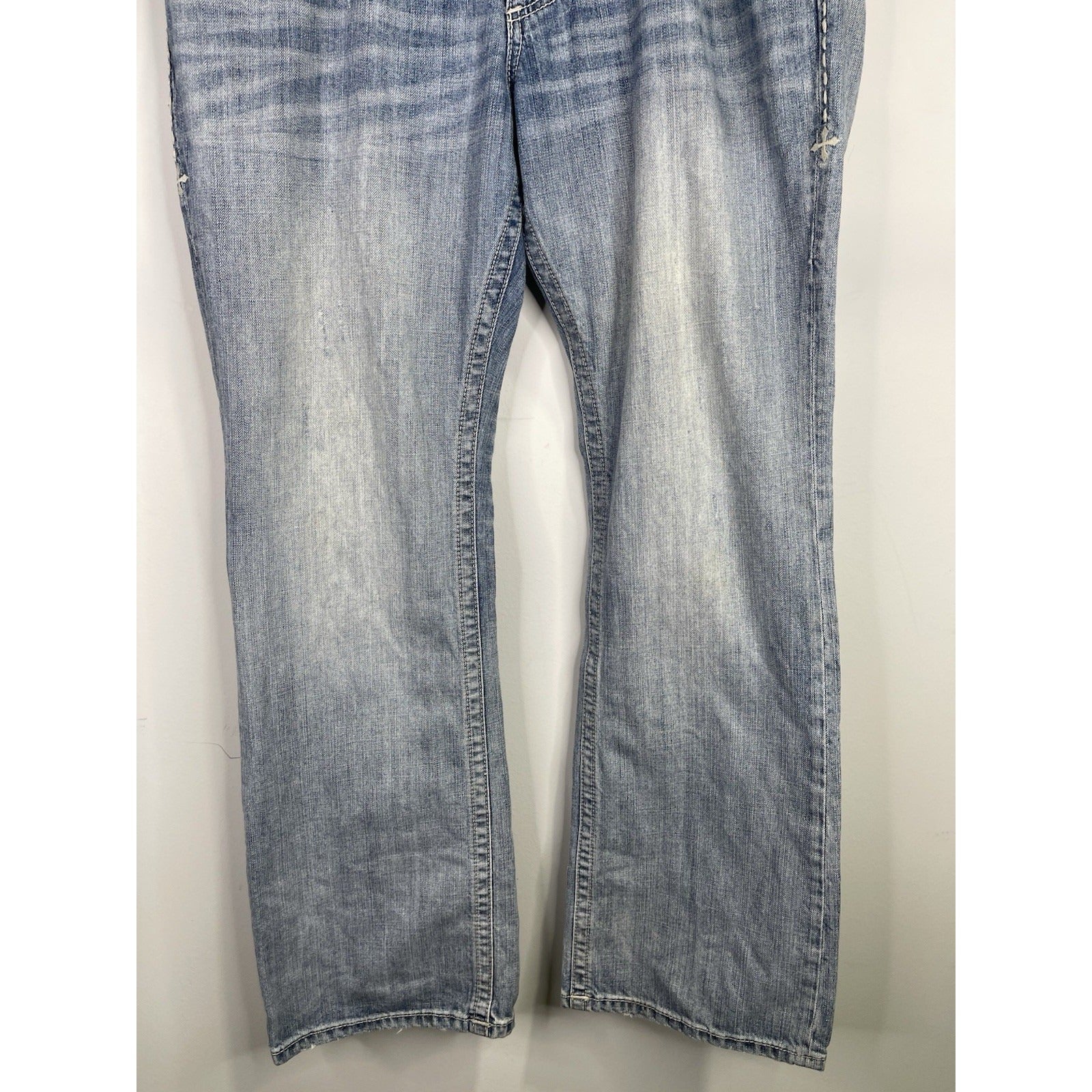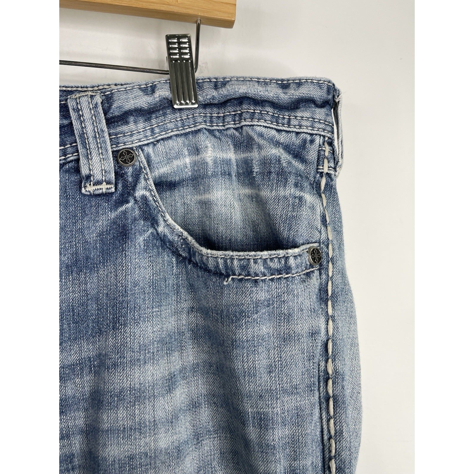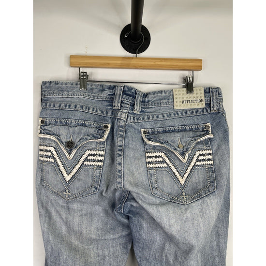The Men’s Affliction Cooper Long Blue Denim Jeans in size 38 are a stylish and durable pair of straight-cut jeans designed for men. Made from high-quality denim fabric, these jeans feature a regular fit with a 34-inch inseam and a 38-inch waist size. The classic blue color makes them versatile for everyday wear, while the Affliction brand adds a touch of edgy style to your wardrobe. With a comfortable and flattering fit, these jeans are a staple piece for any man's closet.