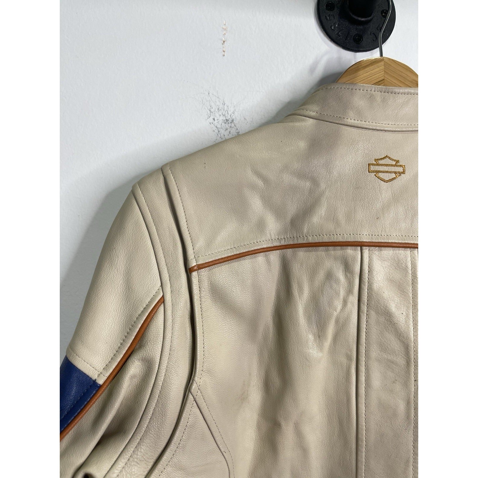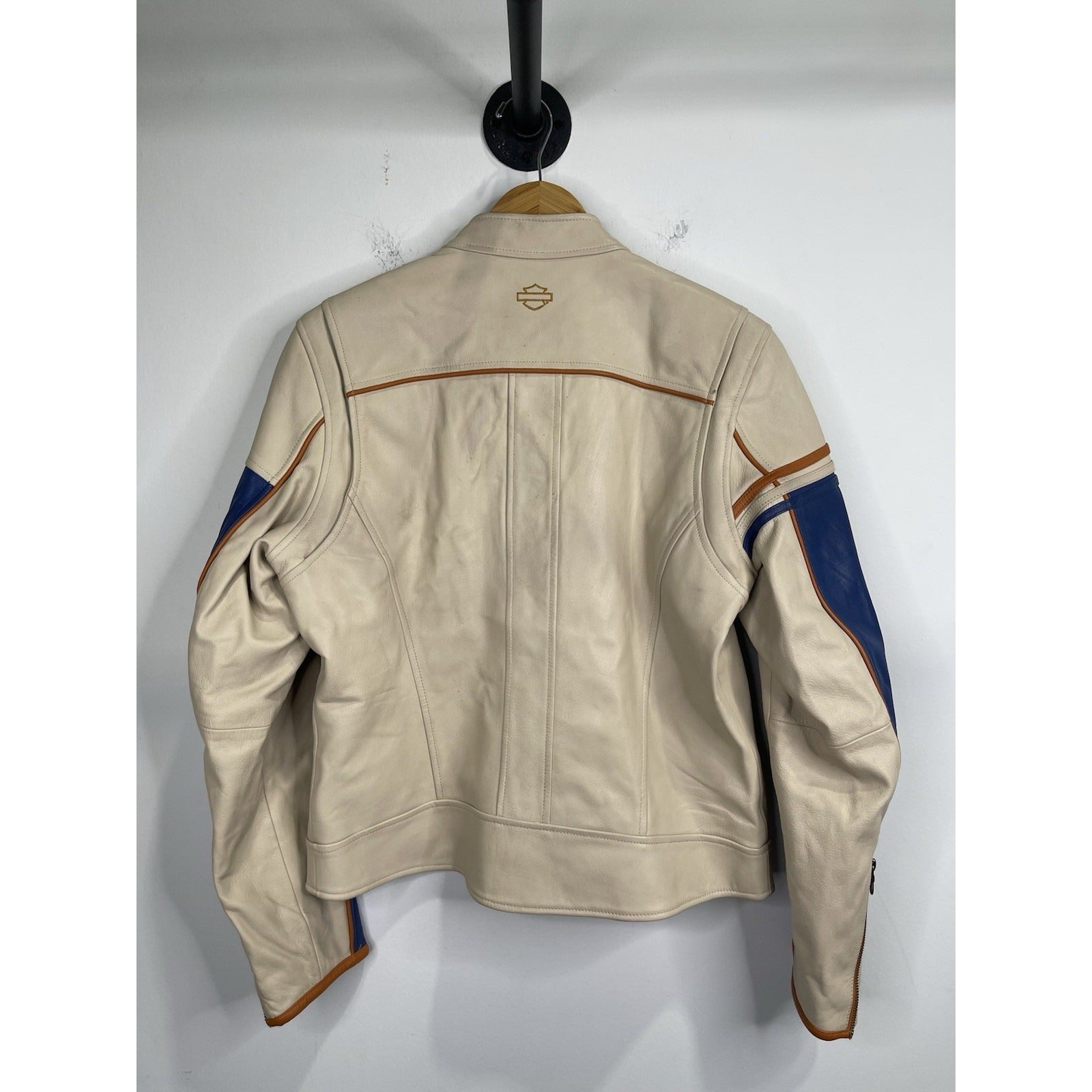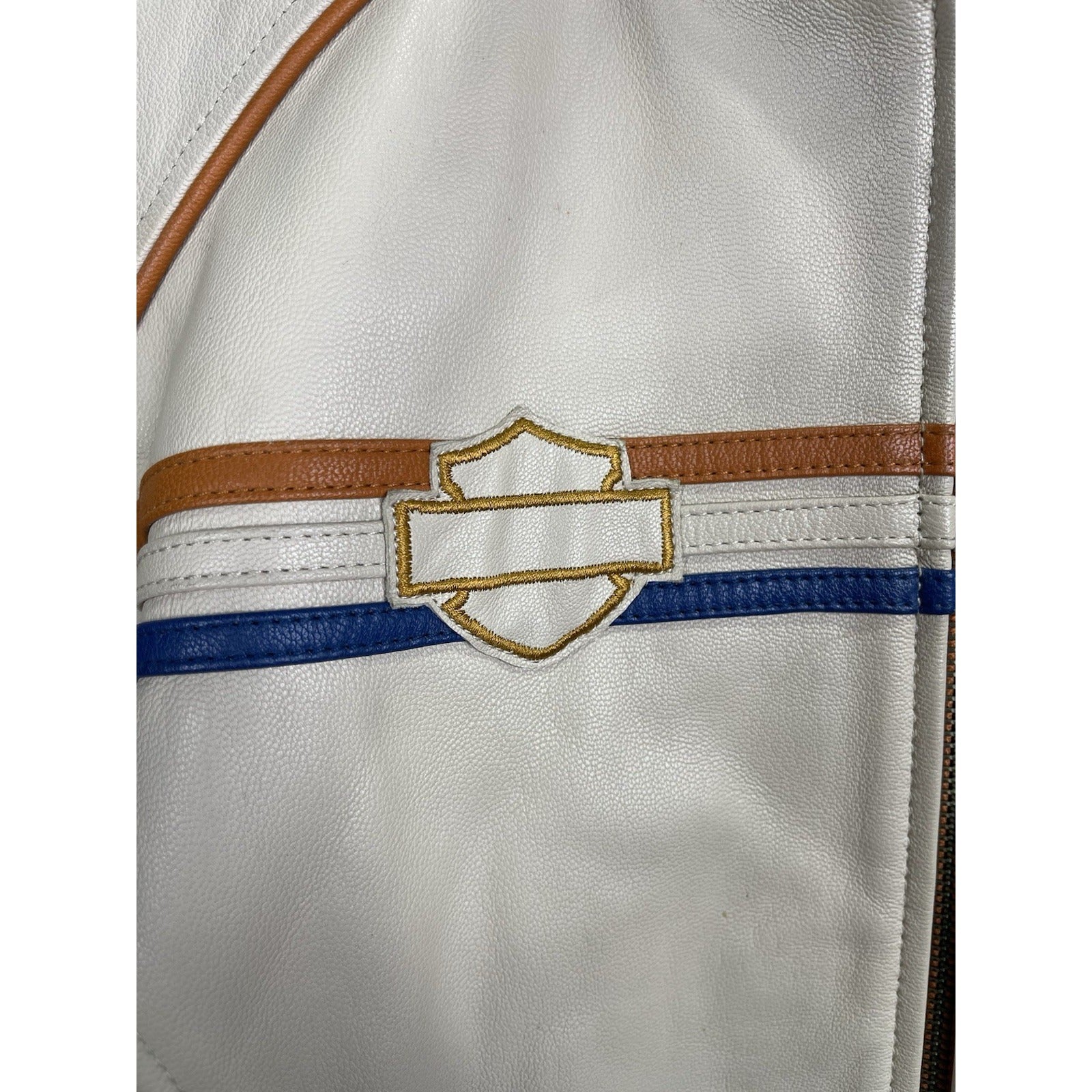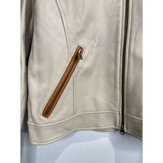 This Men's Beige Motor Harley Davidson Biker Full Zip Jacket in size L features a solid pattern with a short length and long sleeves. Made from leather with a nylon lining, this jacket is designed for casual occasions and has a regular fit. It includes accents like zipper, embroidered logos, and a Harley-Davidson brand logo, embodying a biker theme. The full zip closure adds functionality to this stylish motorcycle jacket, perfect for unisex adults looking to add a touch of biker flair to their wardrobe.