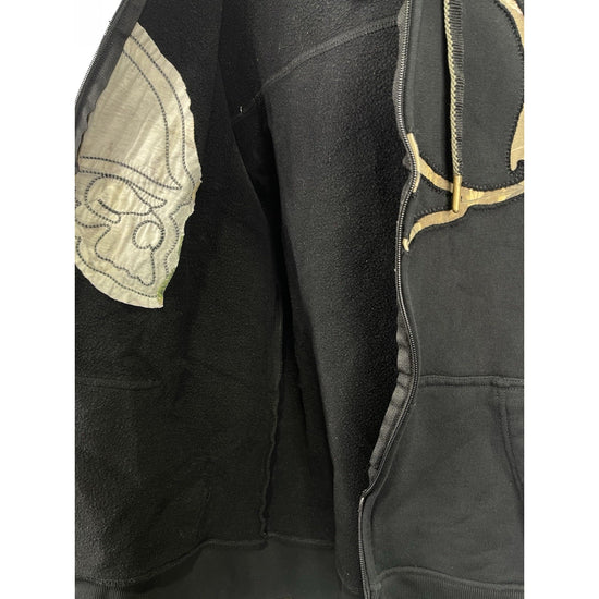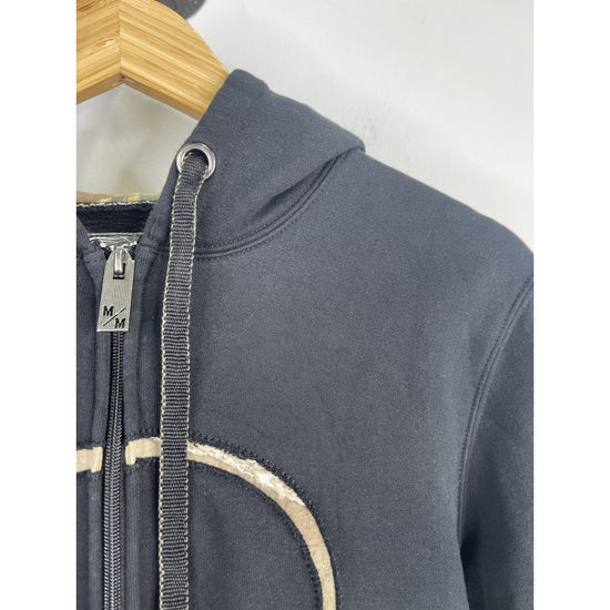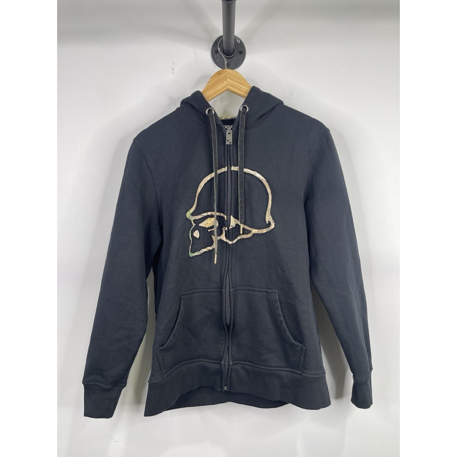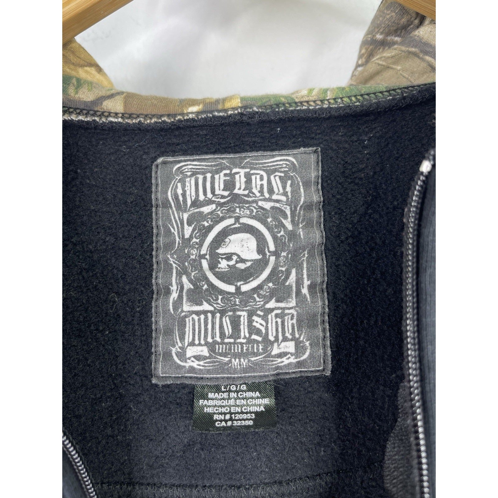 This Men’s Black & Real Tree Camo Vintage Metal Mulisha Zip Up Hoodie in size L is a classic piece perfect for the winter and fall seasons. Made of a blend of polyester and cotton, this hoodie features a solid black color with a crew neck and long sleeves. The vintage design, featuring the Metal Mulisha brand and logo accents, adds a unique touch to the full zip style. Ideal for activities like walking and hunting, this lined hoodie offers a comfortable fit for everyday wear.