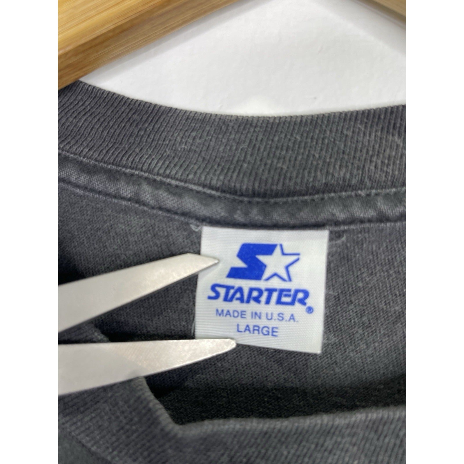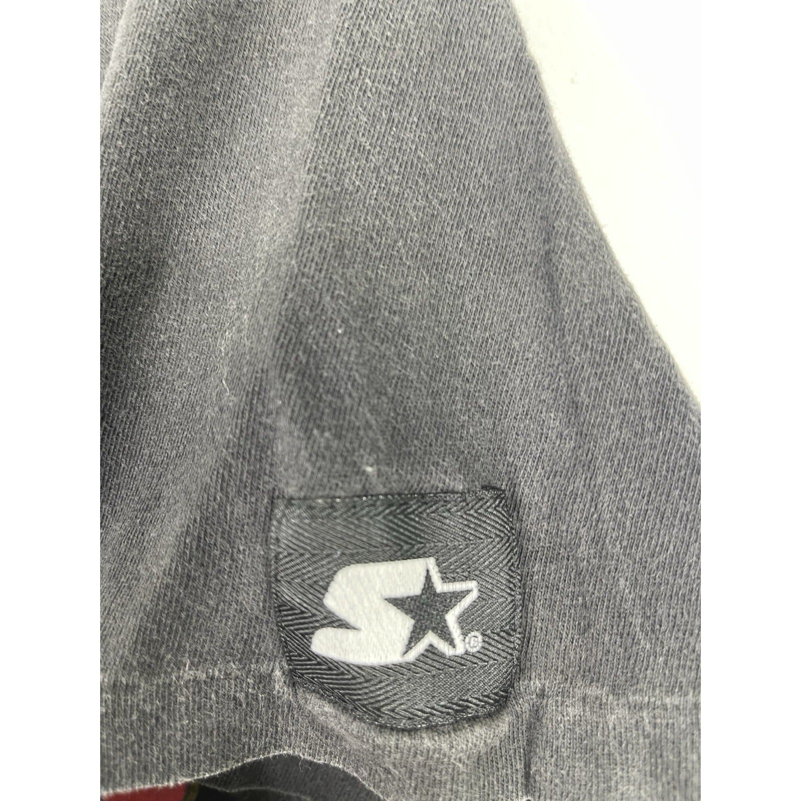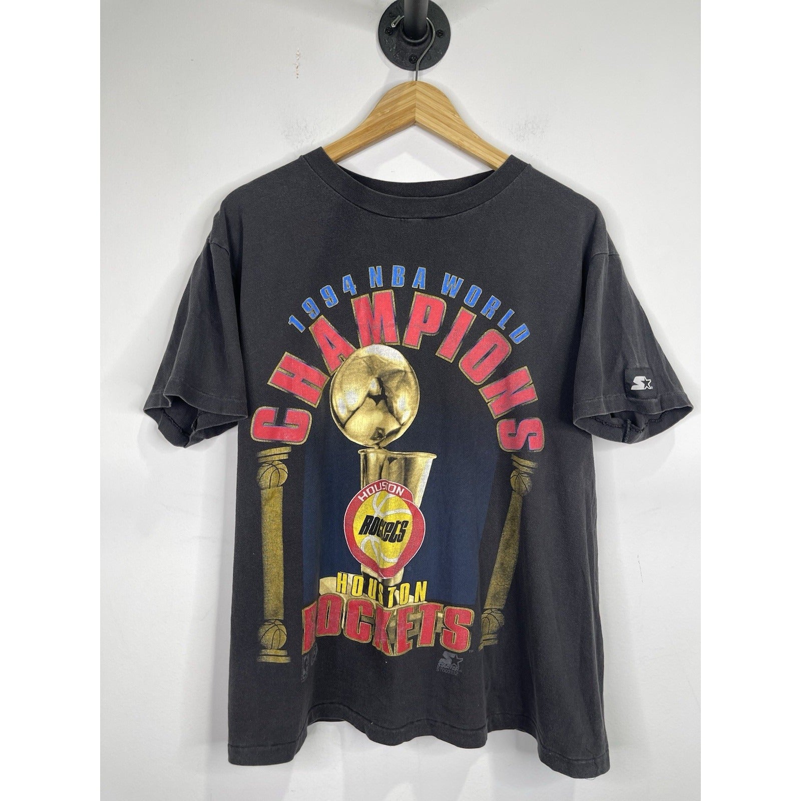 This Men’s Black Vintage Houston Rockets Championship Starter 1994 NBA T-Shirt in size L is a classic piece from the 90s featuring a Crew Neck and short sleeves. Made from cotton knit fabric, this shirt is easy to care for and suitable for all seasons. The shirt showcases the iconic Houston Rockets logo as an accent, making it a must-have for fans of the team and basketball enthusiasts alike. This vintage shirt by Starter is a timeless piece that pays homage to the Rockets' championship win in 1994.