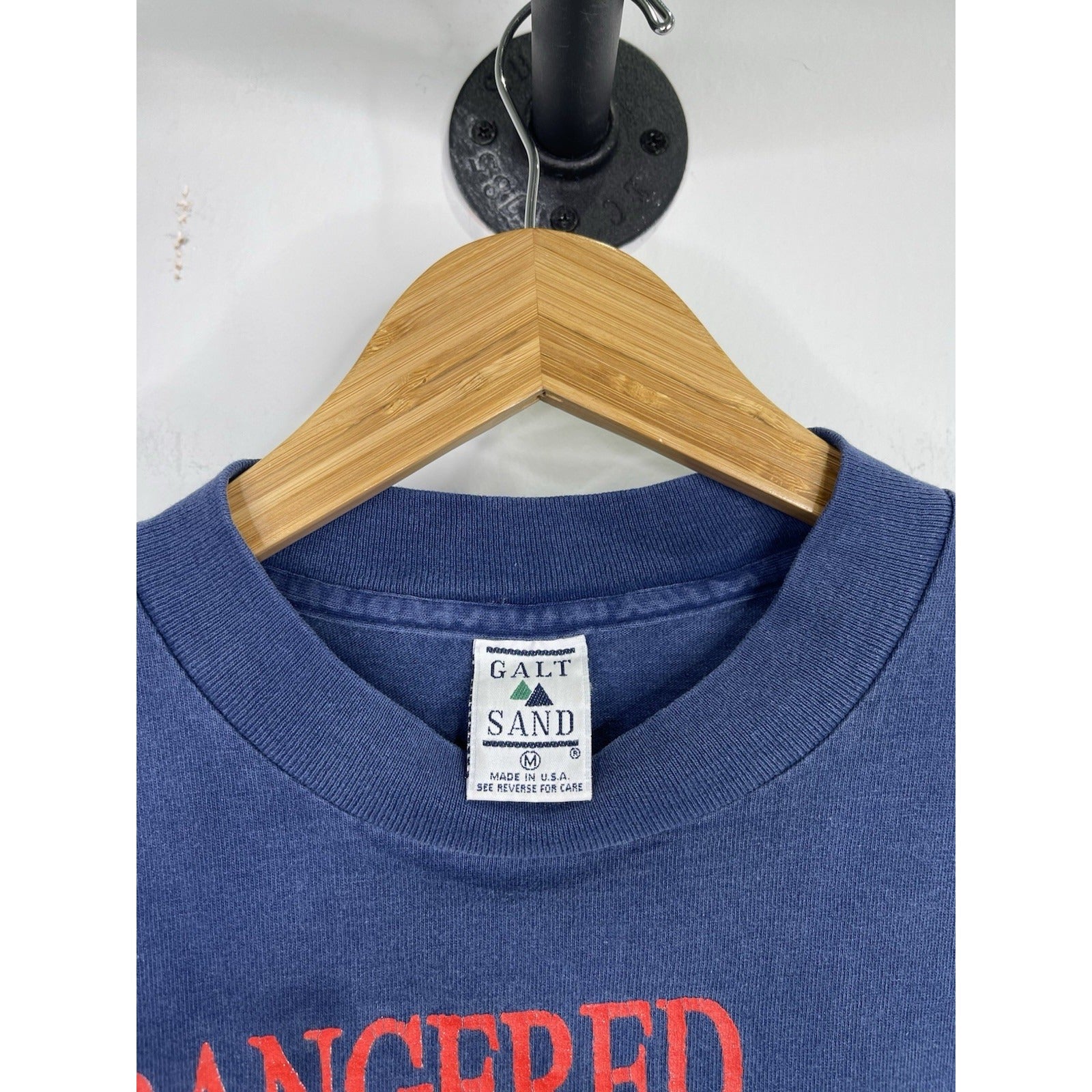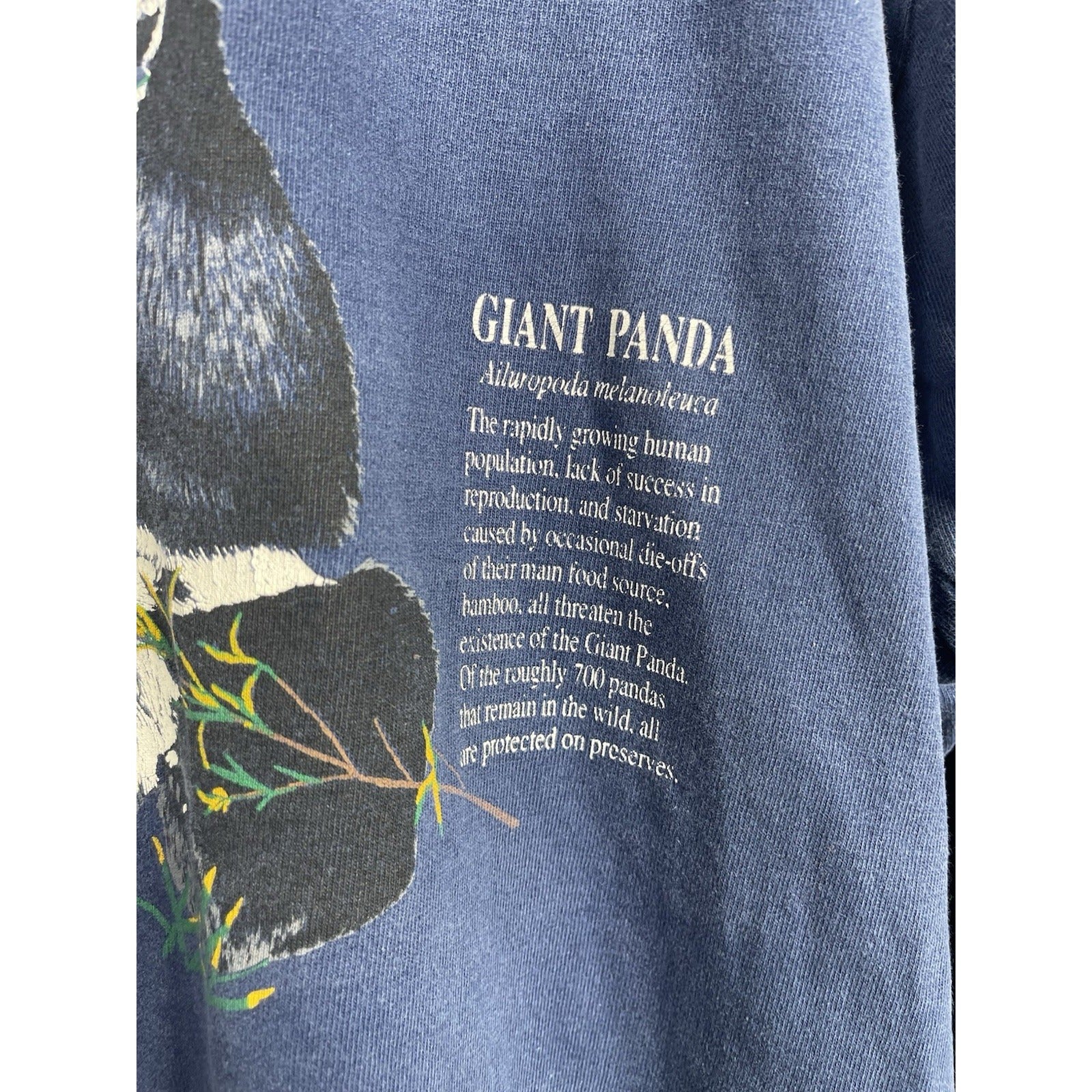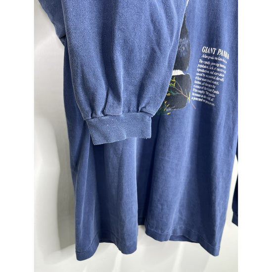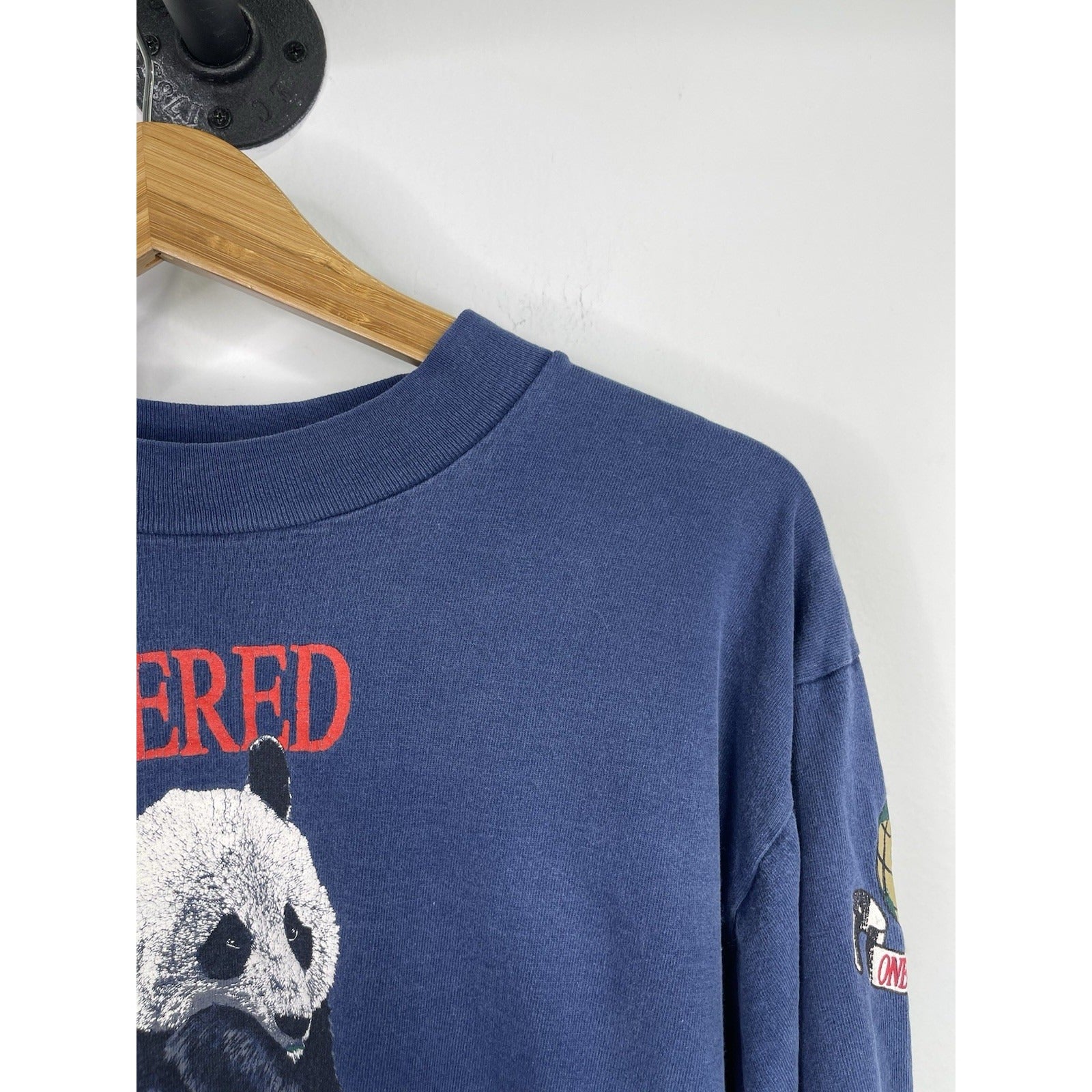This Men's Blue Vintage Endangered Giant Panda Graphic Long Sleeve Shirt in size Medium is a unique and stylish addition to any wardrobe. Made from breathable cotton material, this shirt features a crew neck and a regular fit, perfect for all seasons. The graphic print of a giant panda adds a nature and animal theme, making it a fun and fashionable choice for those who love wildlife and a 90s style. The blue color and vintage design from the brand Galt Sand make this shirt a standout piece that is sure to turn heads.