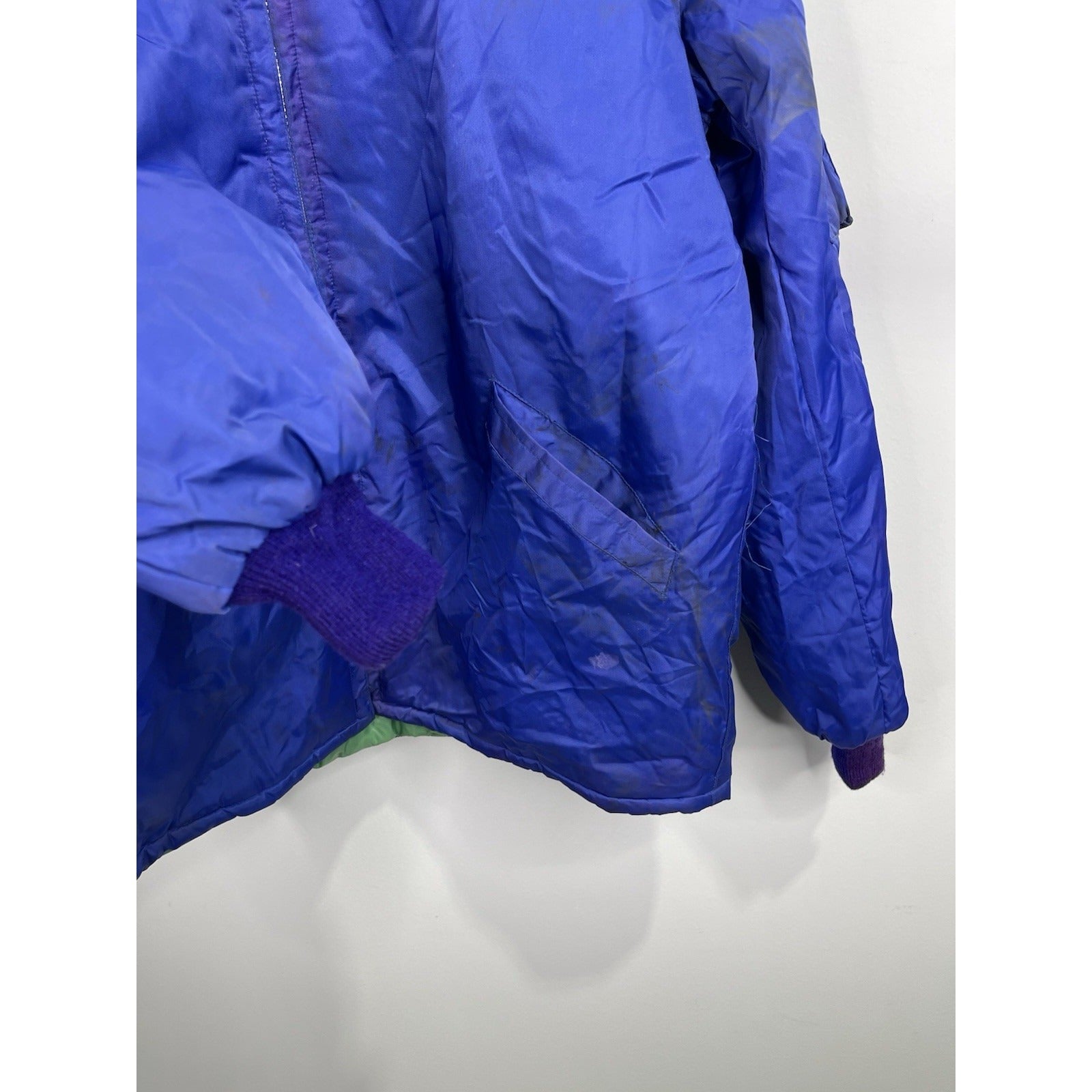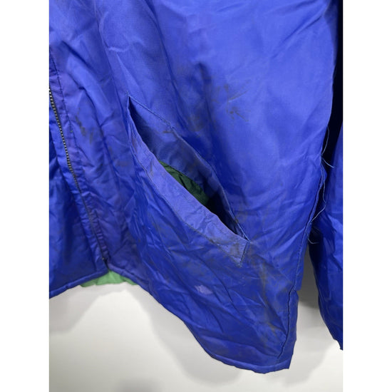 This Men's Blue VTG Guam Island Map Souvenir Embroidered Full Zip Jacket in size L is a vintage military-style jacket featuring an embroidered design of the Guam Island map. Made from nylon with a polyester lining and insulation, this mid-length jacket is perfect for those interested in military history and the 70s and 80s era. The full zip closure and solid blue color make it a stylish and unique addition to any man's wardrobe.