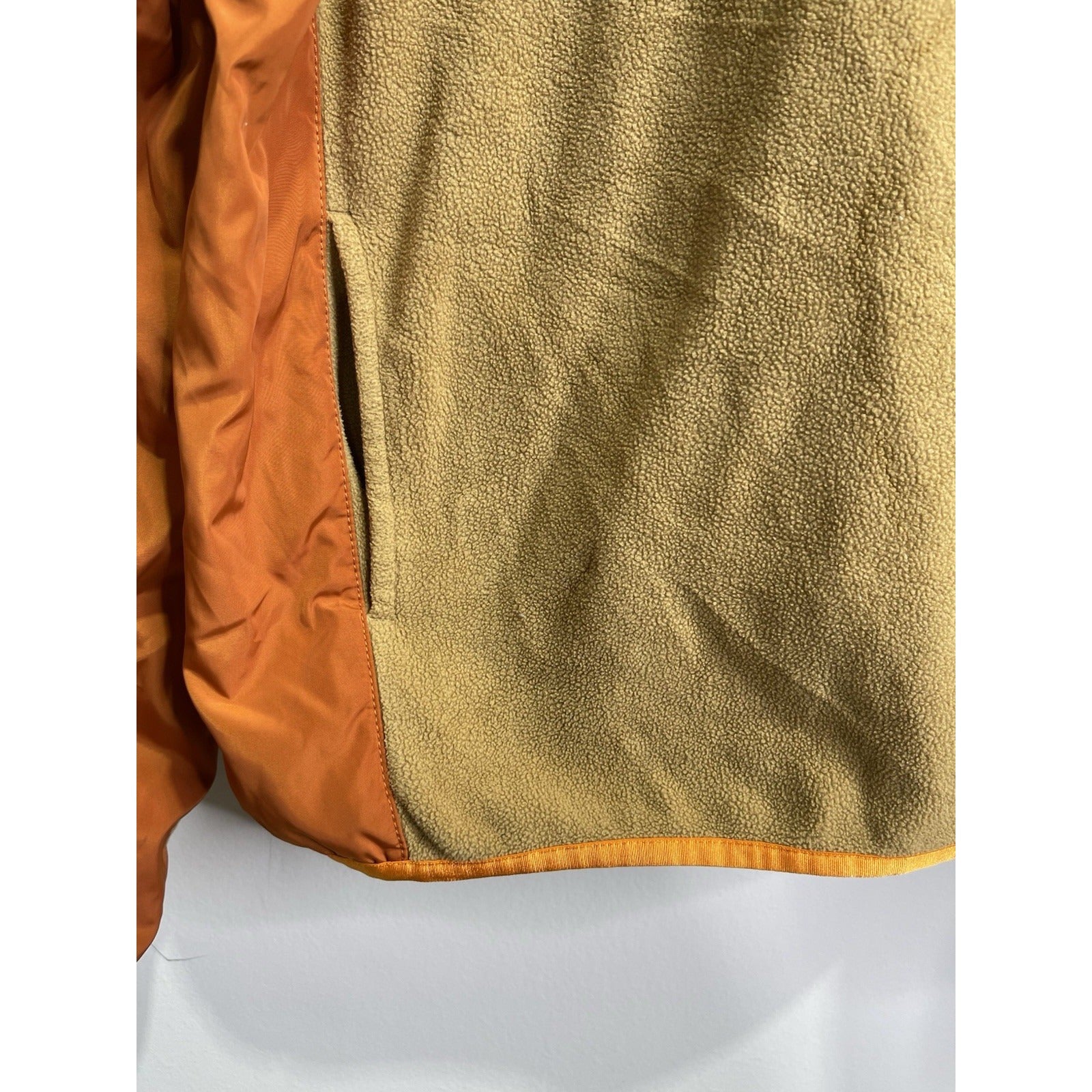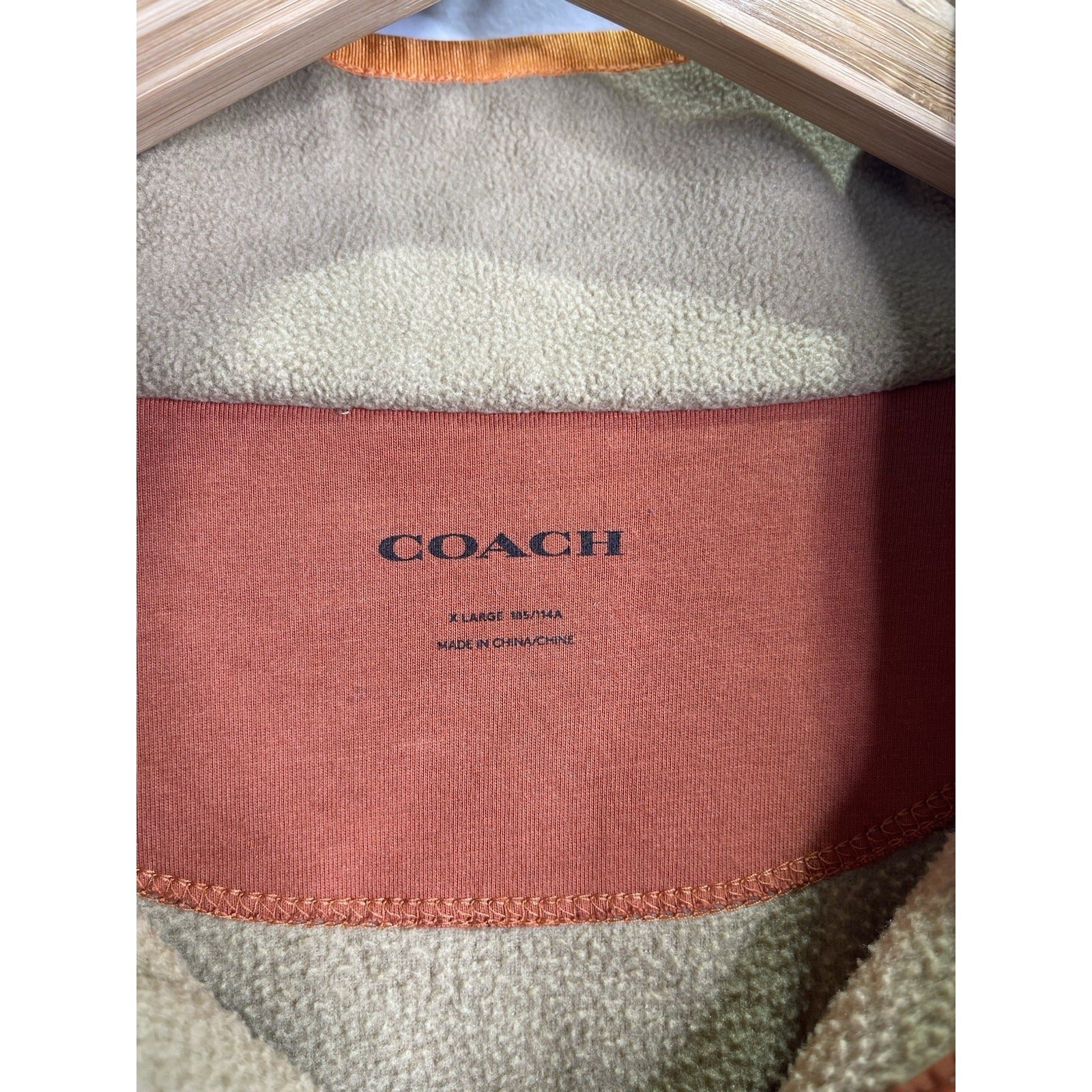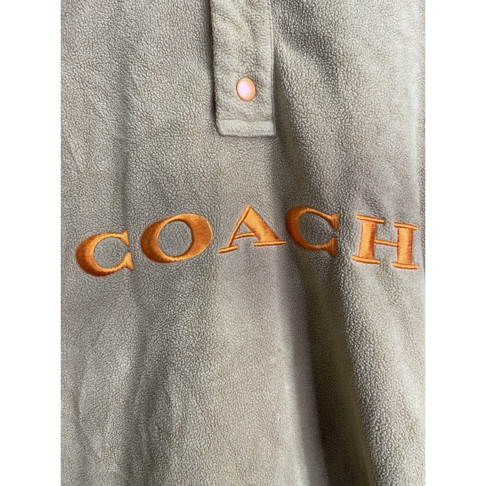 This Men's Brown & Orange COACH 1/4 Snaps Fleece Popover Sweatshirt in size XL is a stylish and versatile addition to any wardrobe. The turtleneck neckline and snap closures add a unique touch, while the polyester and cotton blend material ensures comfort and durability. The embroidered logo accents give it a signature Coach look, perfect for everyday wear or outdoor activities like walking and hiking. The regular fit and pullover style make it a convenient choice for all seasons, and the pockets add practicality to the design. Made in China, this sweatshirt from the Coach product line is a must-have for men looking for a quality and fashionable activewear piece.