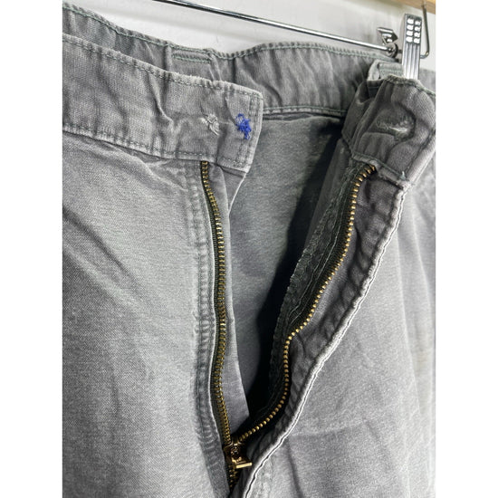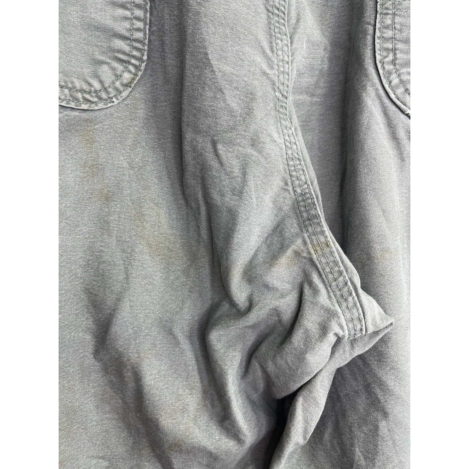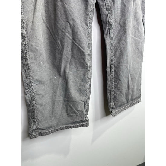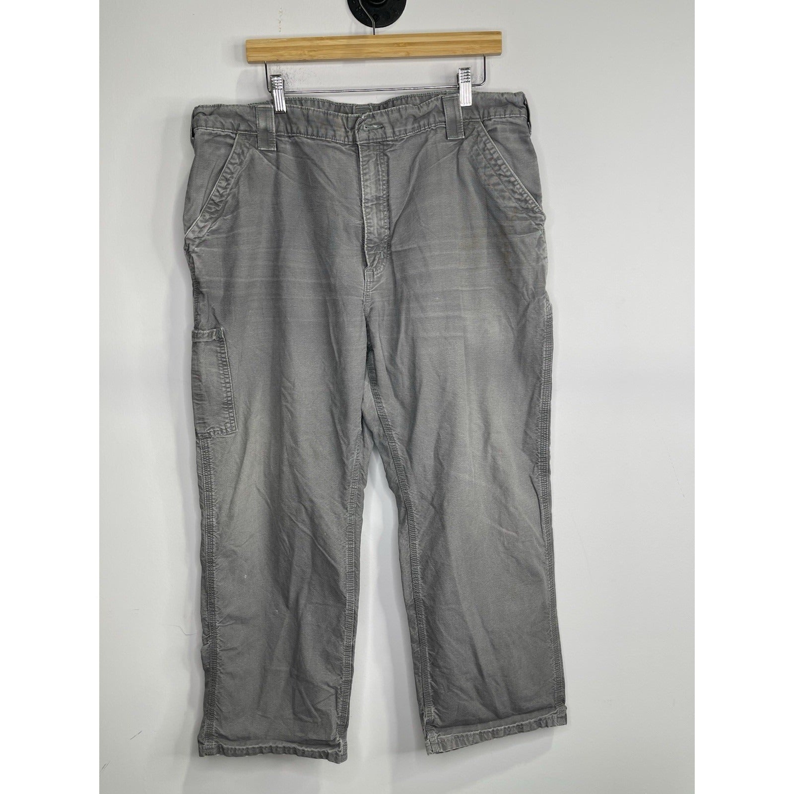 The Men's Carhartt Carpenter Pants in Gray Gravel are designed for rugged workwear with a relaxed fit. Made from a durable cotton blend canvas material, these pants feature a flat front design with straight legs and multiple pockets for convenience. The Carhartt brand logo adds a touch of style, making them suitable for men working in various trades or outdoor professions. With a waist size of 40 inches and inseam of 30 inches, these pants offer a comfortable and functional option for everyday wear.