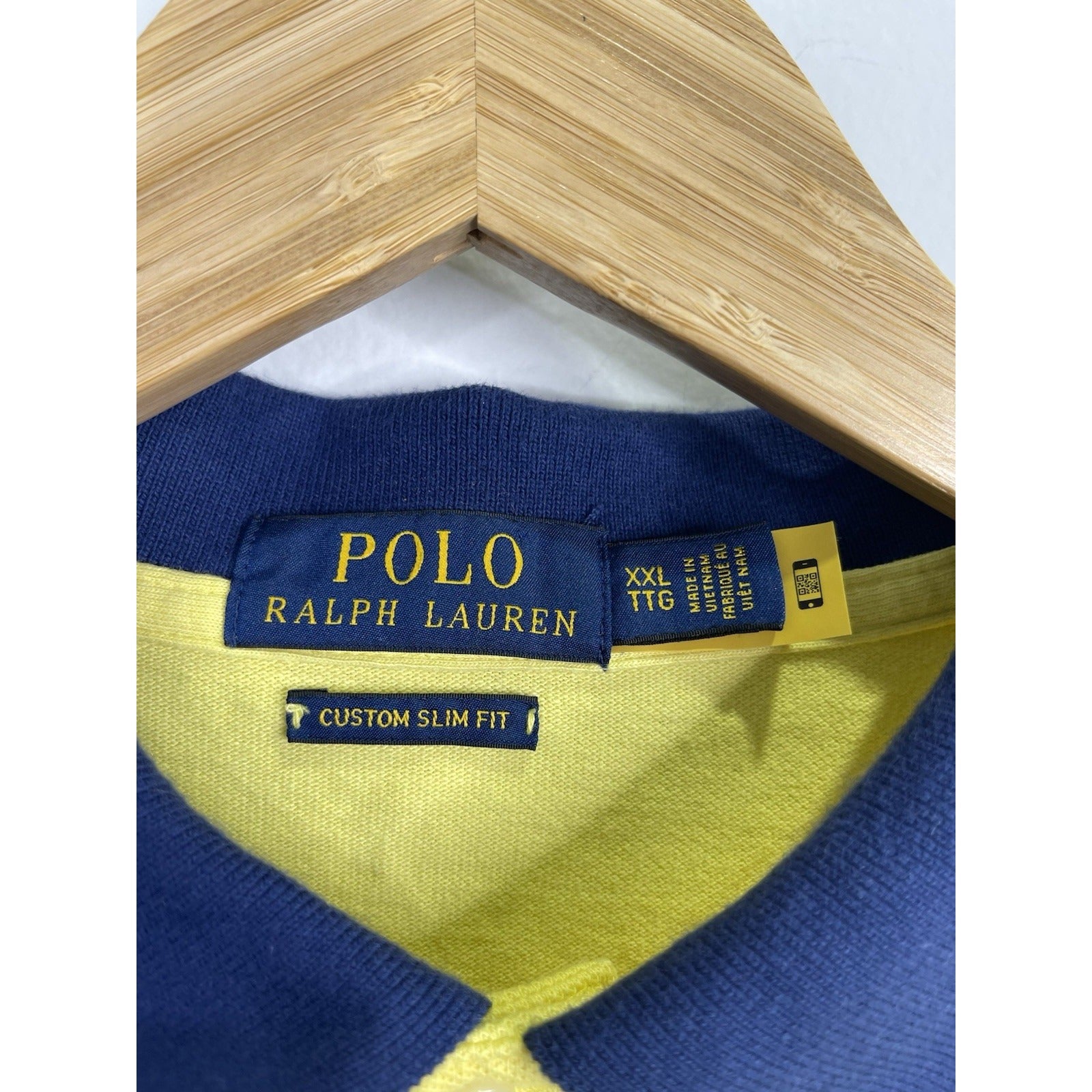 This Men's Collared Polo Ralph Lauren Big & Tall #2 Yellow/Navy Polo Shirt in size XXL is a classic and stylish addition to any man's wardrobe. Featuring a striped pattern and a collared neckline, this short sleeve polo is perfect for activities like walking, rugby, and golf. The combination of yellow and navy colors adds a pop of color to any outfit while the Polo Ralph Lauren logo on the shirt adds a touch of sophistication. Ideal for the modern man looking for both comfort and style in their clothing choices.