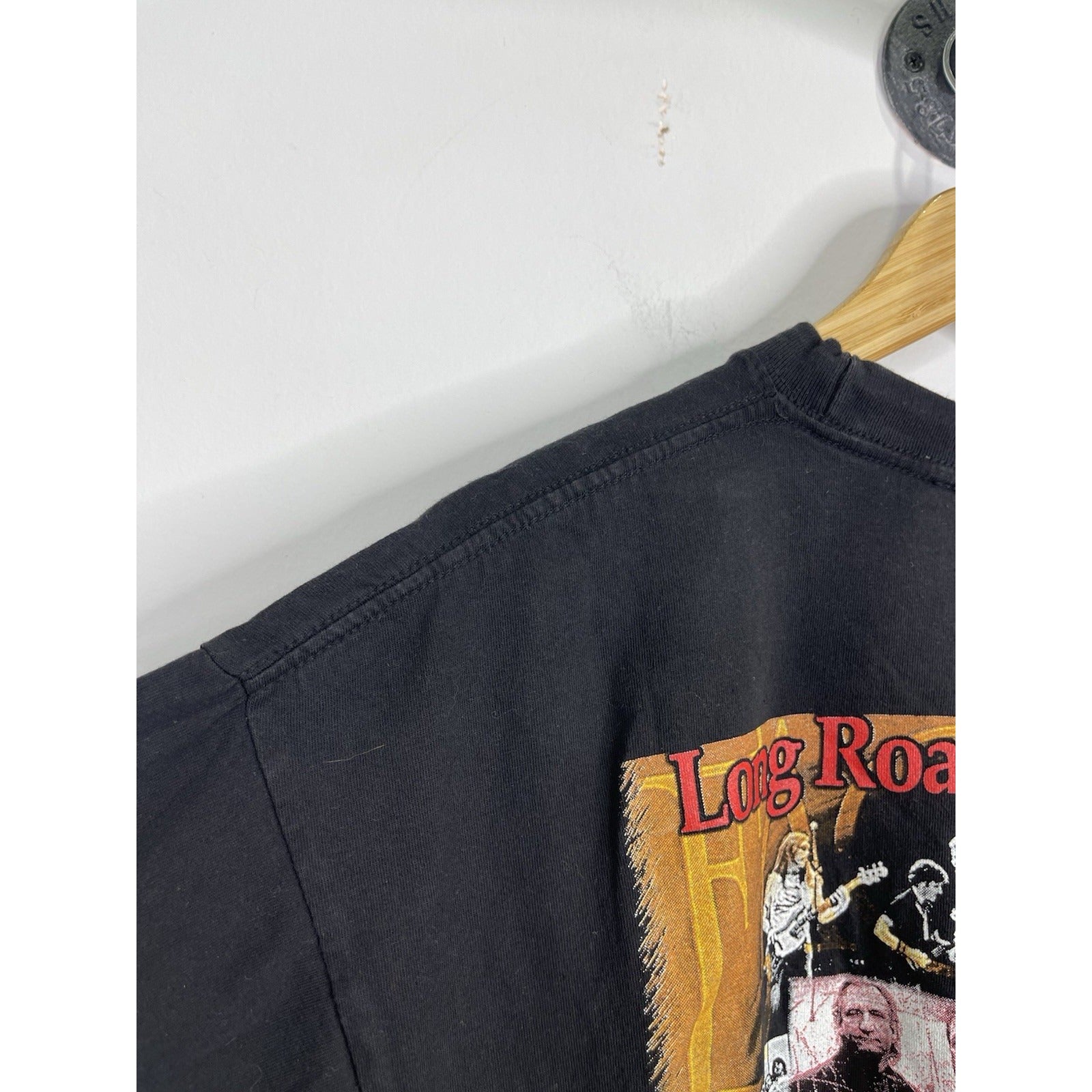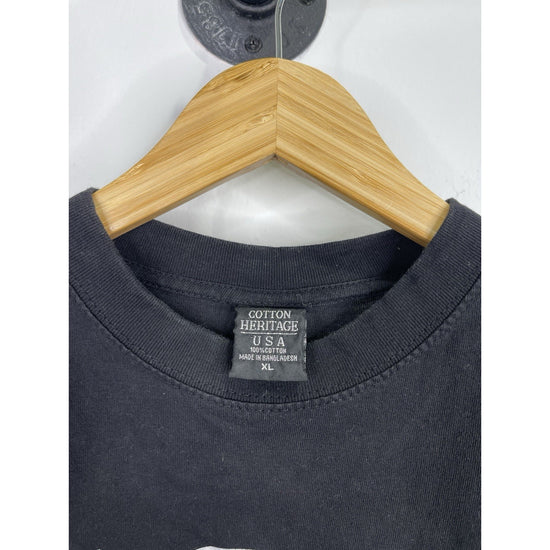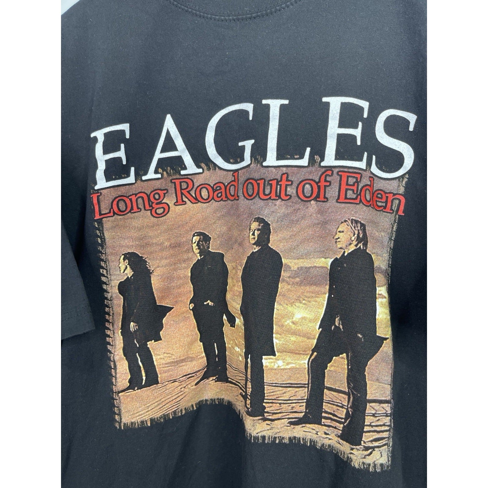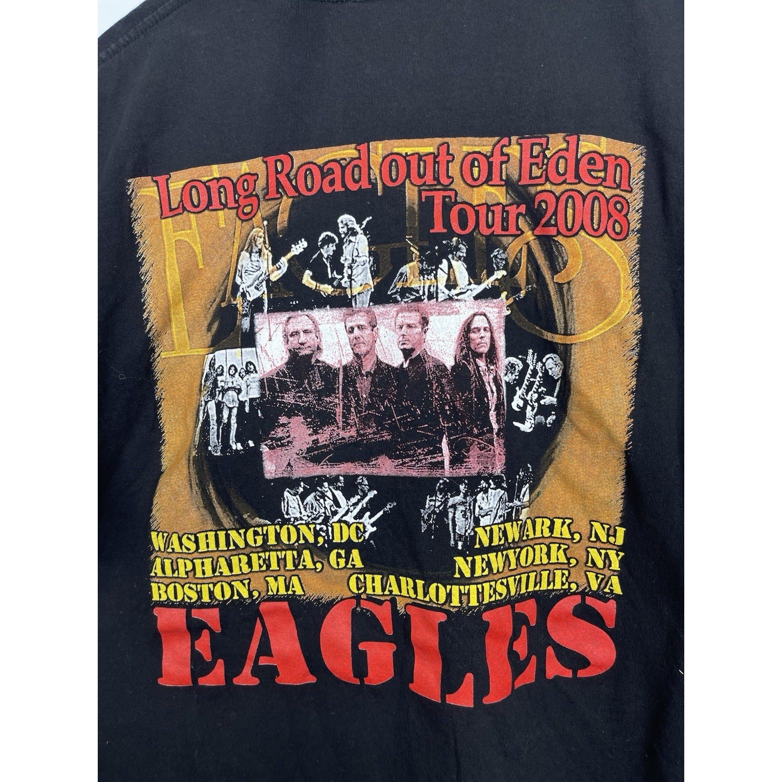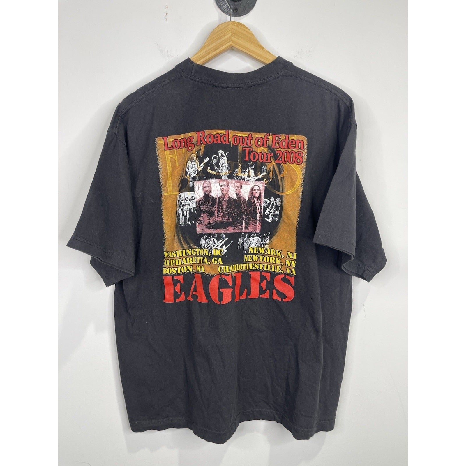 This Men's Eagles Graphic Concert T-Shirt from the Long Road Out Of Eden Tour 2008 in size XL features the iconic Eagles band logo and is a must-have for any rock and pop music fan. Made in Bangladesh, this original piece of music memorabilia celebrates the Eagles' legendary presence in the entertainment industry. Perfect for fans of the Eagles and collectors of music memorabilia, this T-shirt captures a moment in time from the Eagles' unforgettable tour in 2008.