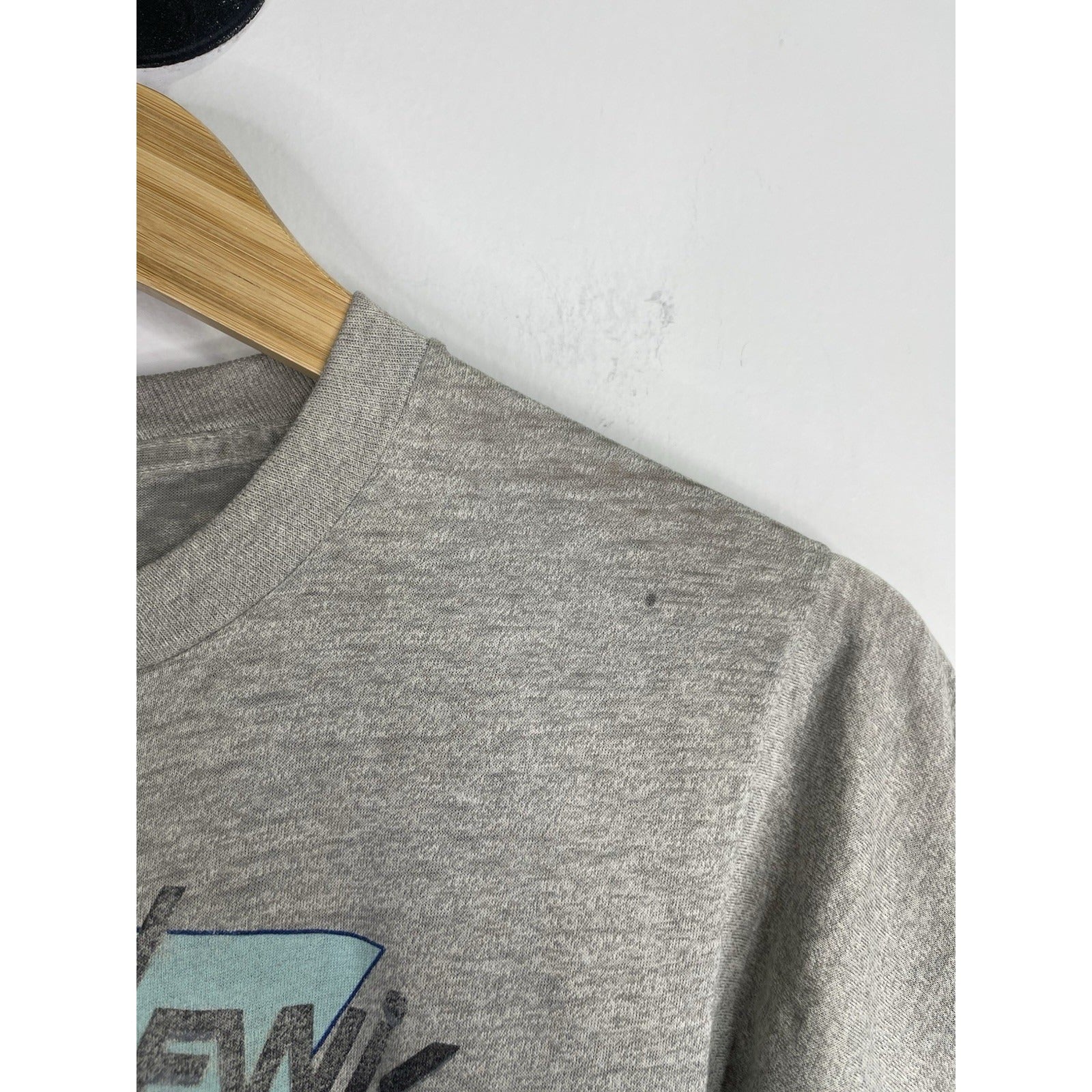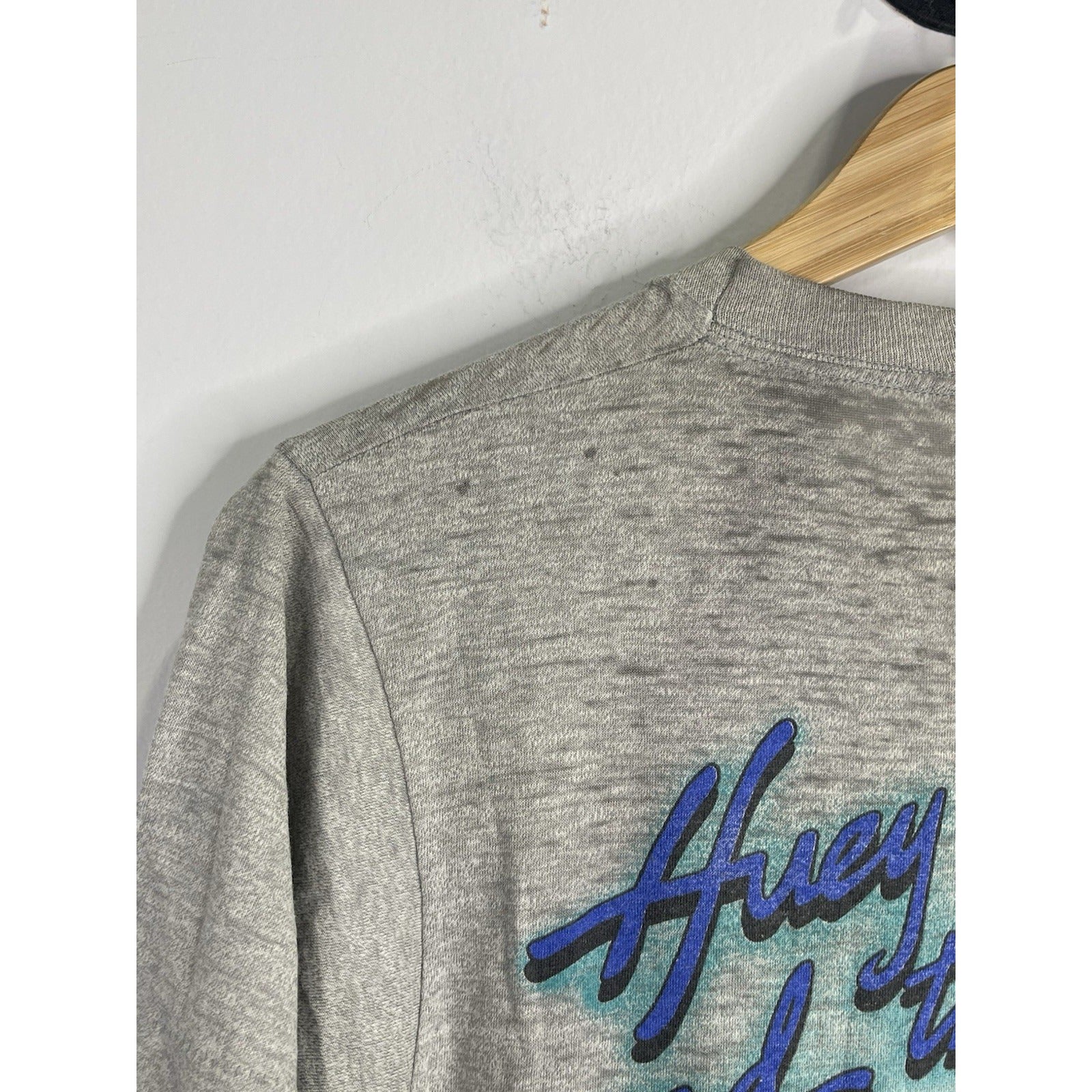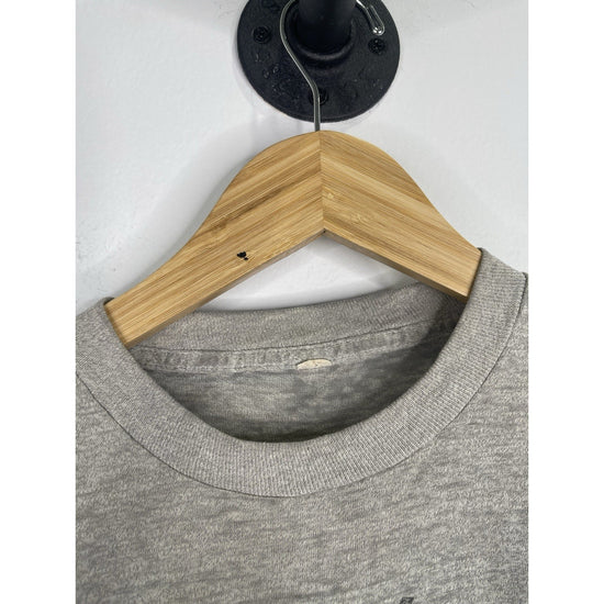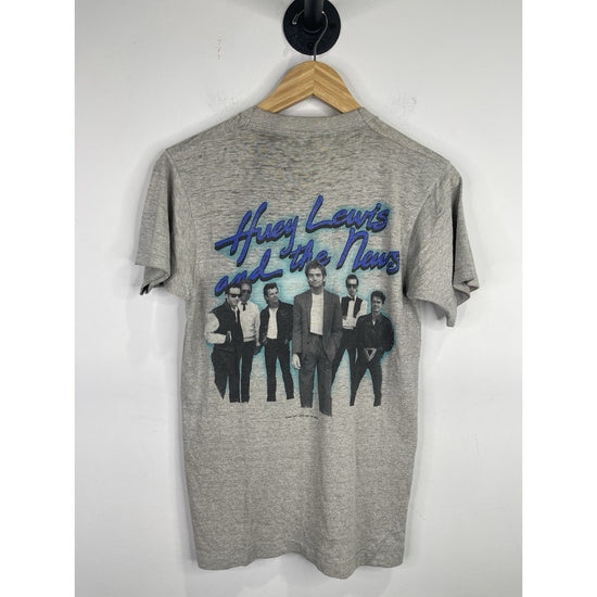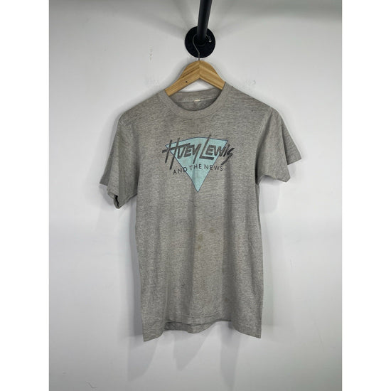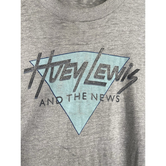 This Men's Gray Vintage 1980's Huey Lewis and the News T-Shirt in size medium is a classic piece with a glam rock look. Made of cotton material, this short sleeve graphic tee features the iconic brand Huey Lewis, embodying the style of the 1980s era. The shirt is an original reproduction, perfect for any fan of the legendary band or vintage clothing enthusiasts looking to add a unique and stylish piece to their collection.