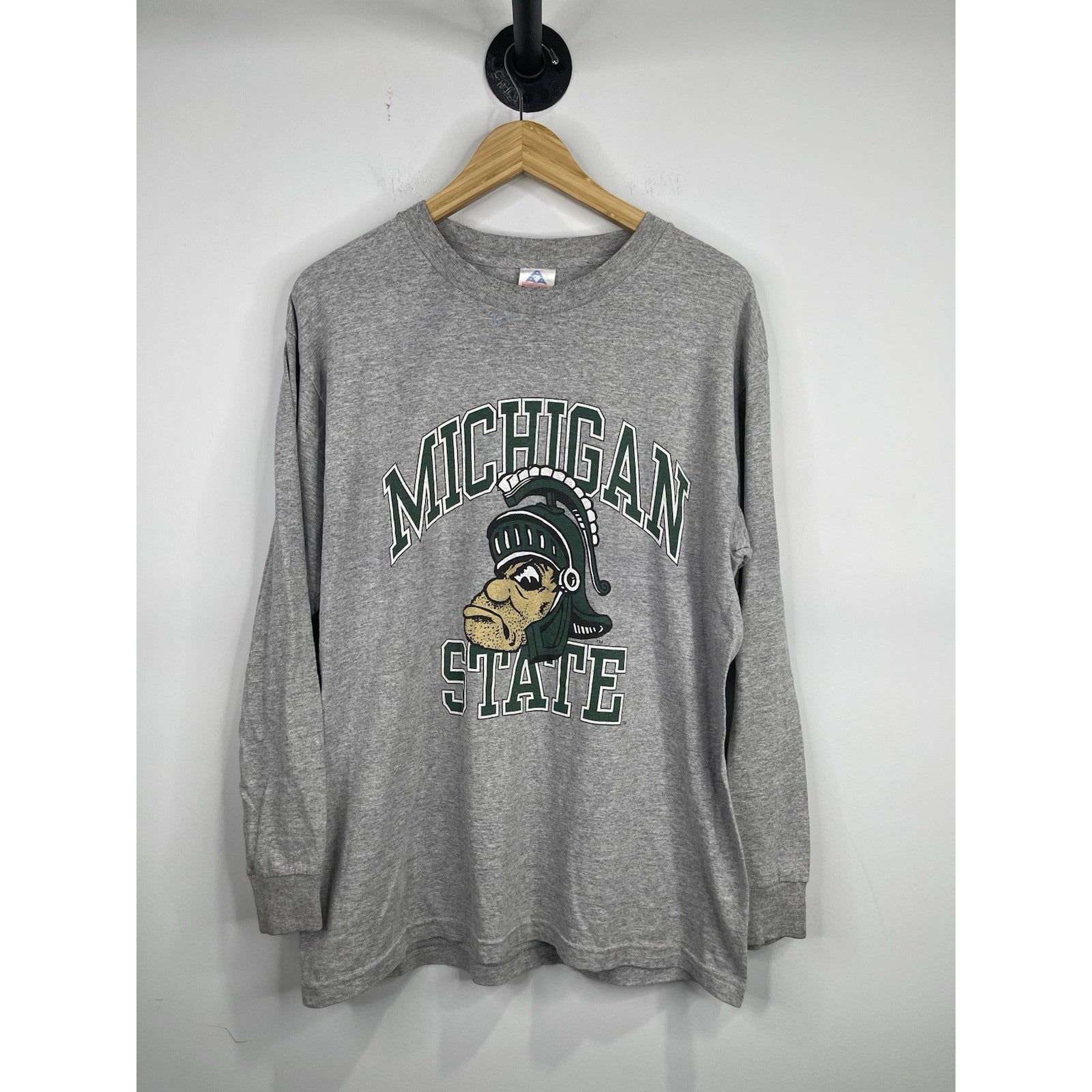 This Men's Gray Vintage Michigan State Long Sleeve Shirt in size Large is perfect for any football fan looking to show their support for the Michigan State Spartans. Made by Alstyle Apparel Activewear, this shirt is designed for the regular season and features the team's logo on the front. The classic gray color adds a timeless touch to this stylish fan apparel, making it a must-have for any college sports enthusiast.