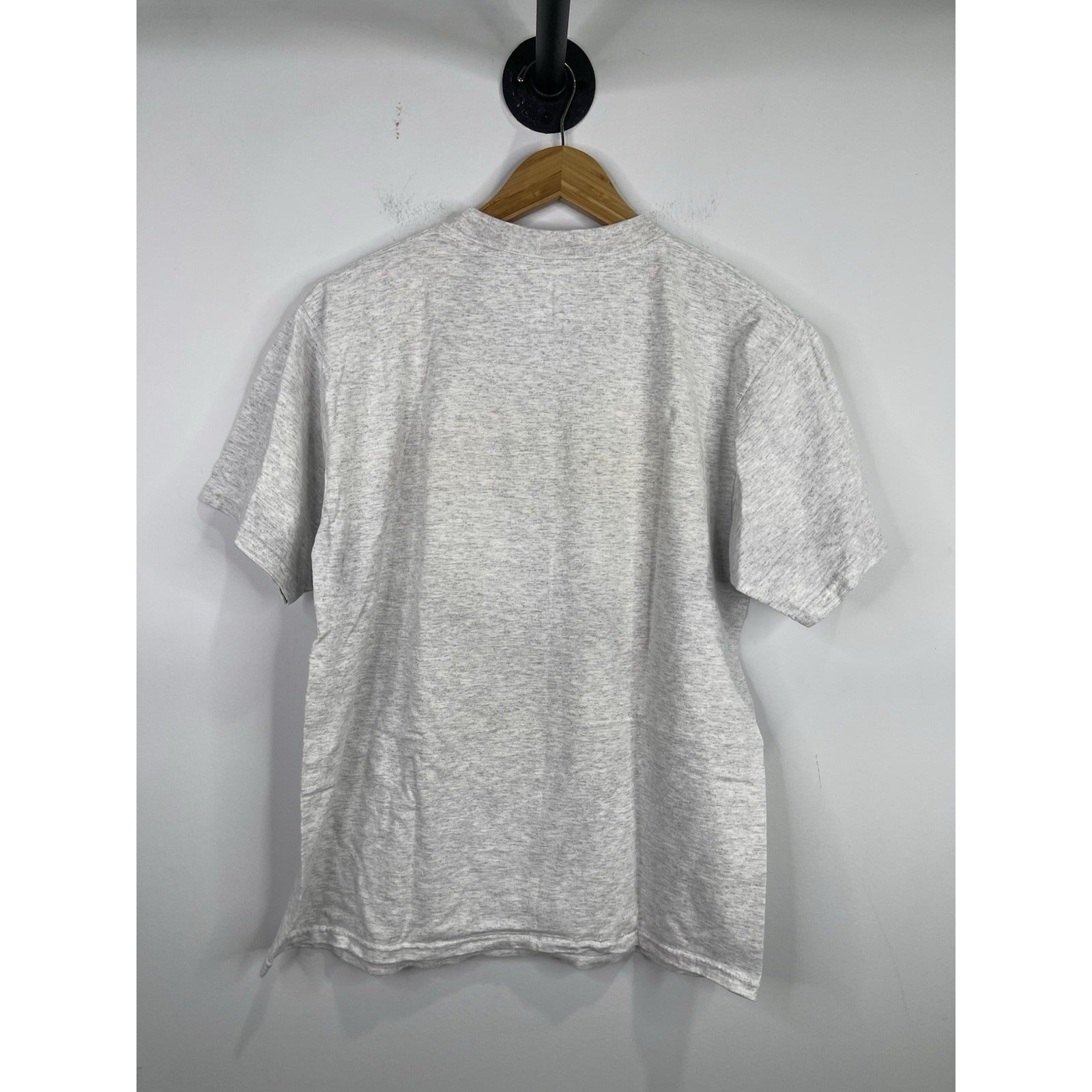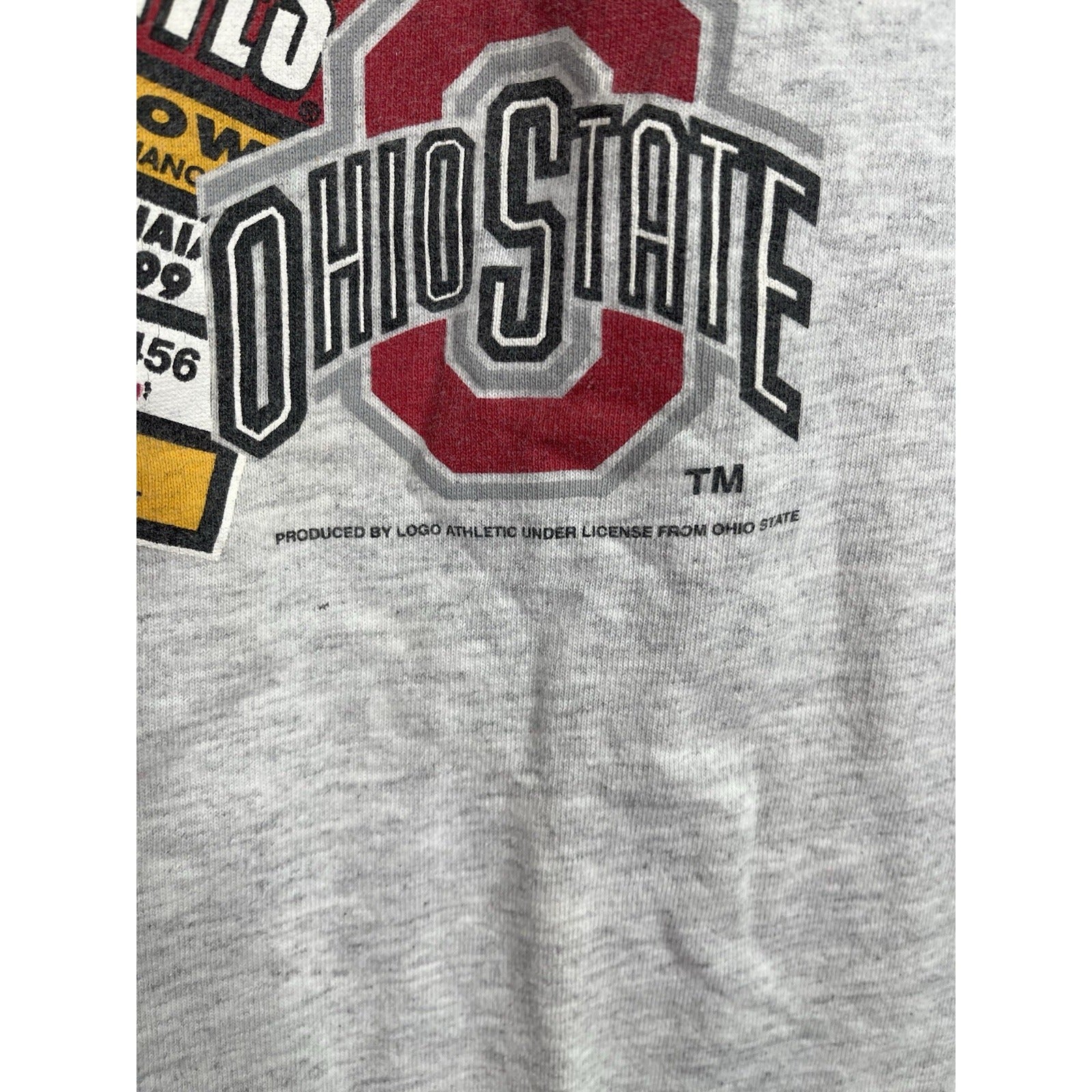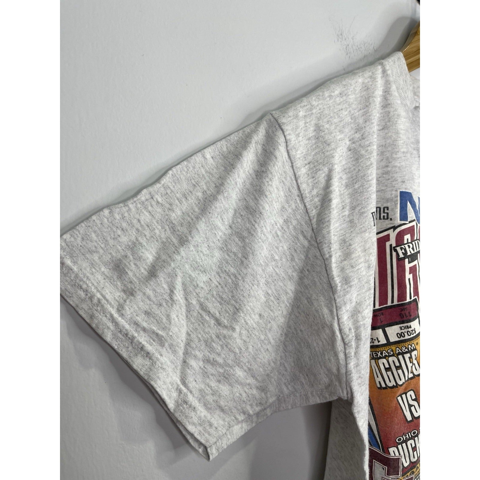 This Men's Grey Nokia Sugar Bowl 1999 A&M Vs Ohio State Graphic T Shirt in size Large is a vintage piece from Logo 7 featuring a crew neck and short sleeves. Made of breathable cotton, the t-shirt has a regular fit and is suitable for all seasons. The graphic print showcases a nostalgic theme from the 90s sports era, making it a stylish and comfortable addition to any wardrobe.