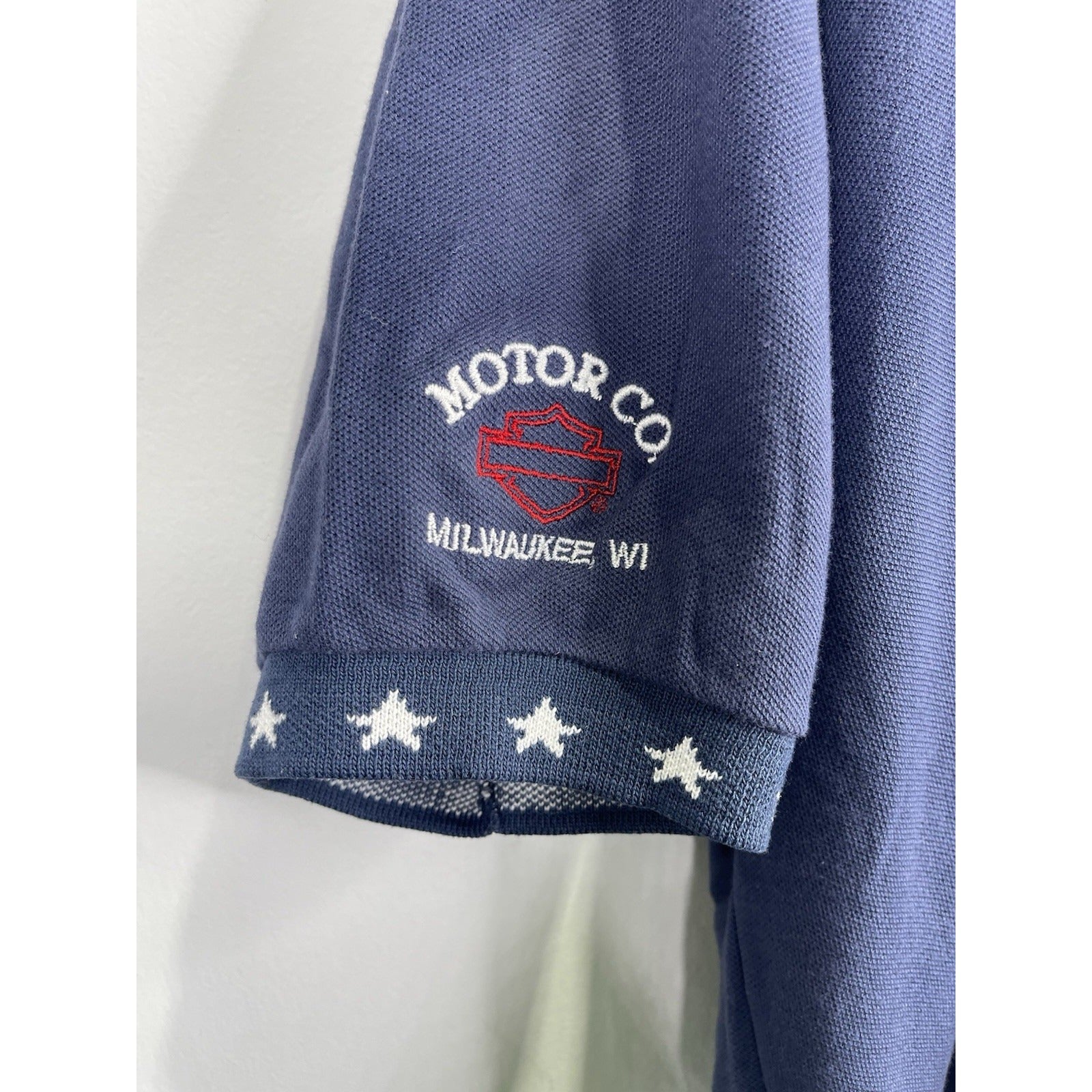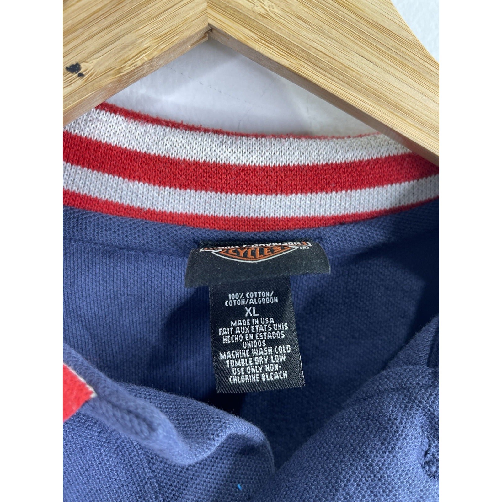 The Men’s Harley Davidson Polo Shirt in size XL is a classic and comfortable piece of clothing perfect for casual occasions. Made in the USA with a blend of polyester fabric, this polo shirt features a striped pattern, collared neckline, and button closure. Ideal for the summer, fall, and spring seasons, this shirt also has a golf theme, making it a versatile and stylish addition to any man's wardrobe.