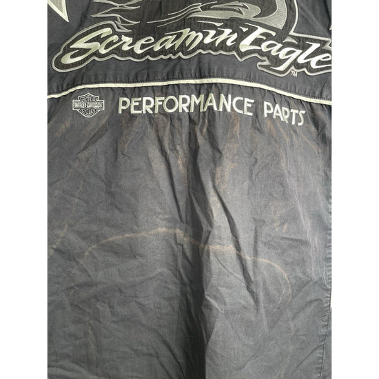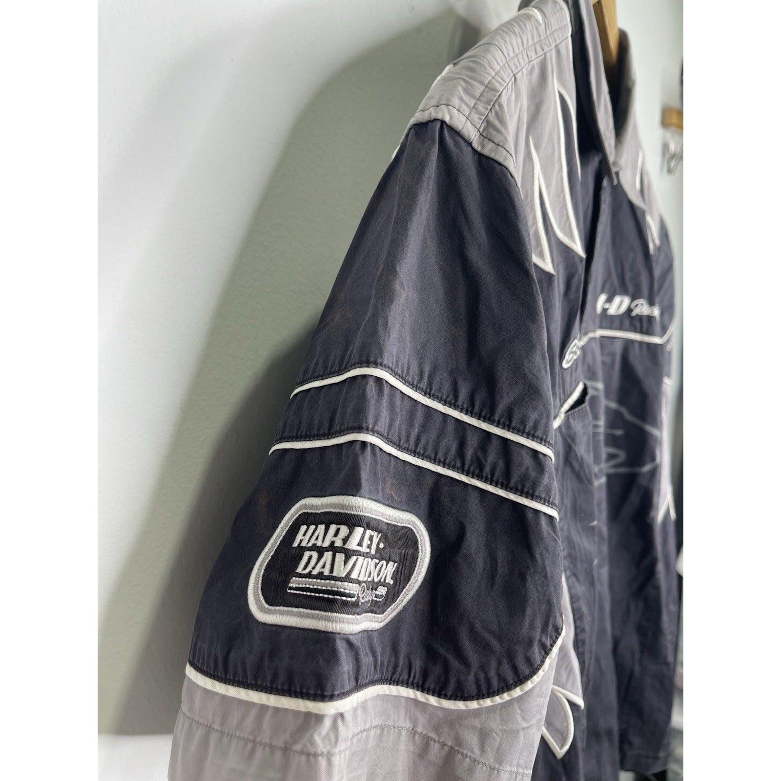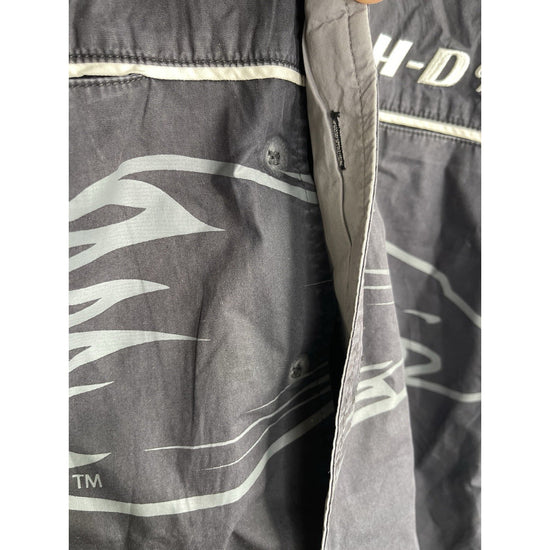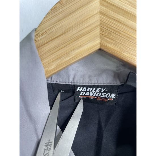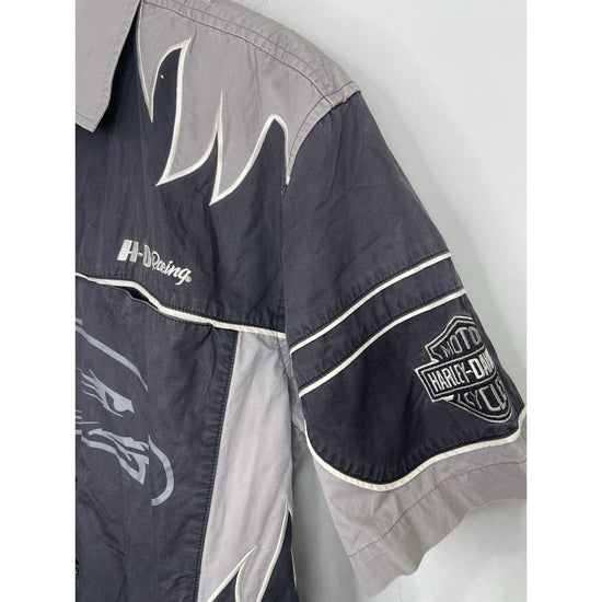 This men's Harley Davidson Racing black and gray button-up shirt is perfect for biker enthusiasts. Made of cotton with a solid pattern, short sleeves, and a collared neckline, it features an embroidered eagle and button accents. The classic fit and size L make it a comfortable and stylish choice for casual wear. With its biker, motorcycle, and garage theme, this shirt is sure to make a statement. Additionally, the presence of pockets adds functionality to this versatile and quality piece from the iconic Harley-Davidson brand.