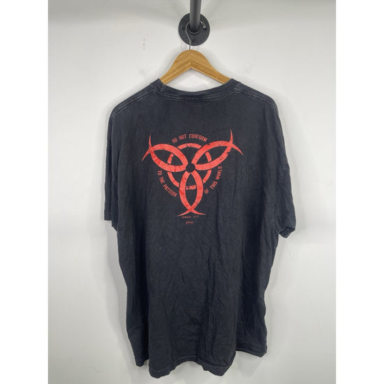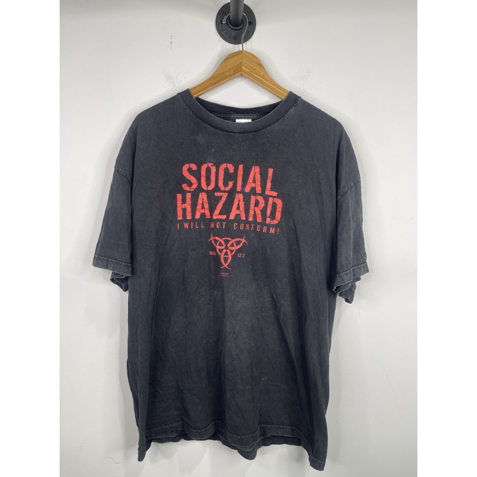 This Vintage 2003 Men’s Kerusso Social Hazard I Will Not Conform Christian Black T-Shirt in size XXL features a solid black design with a Crew Neck and short sleeves, made from comfortable cotton material. The regular fit and easy care instructions make it a versatile option for all seasons. The shirt is double-sided and proudly made in Mexico by the Tennessee River brand. Perfect for men looking to express their faith with style and comfort.