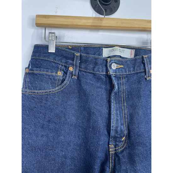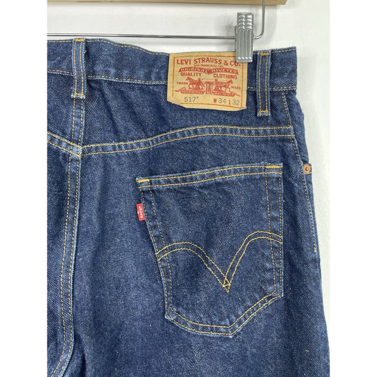 The Men's Levi's 517 Jeans in Blue Dark Denim Wash offer a stylish and versatile option for any wardrobe. Featuring a bootcut style with contrast stitching, these heavyweight jeans are perfect for all seasons. Made of durable cotton denim, they have a mid rise fit with a regular size 34 waist and 32 inseam. Easy to care for, these jeans are machine washable and feature a classic 5-pocket design for added functionality. Whether you're looking for a winter staple or a summer adventure essential, these Levi's jeans are sure to be a reliable and fashionable choice.