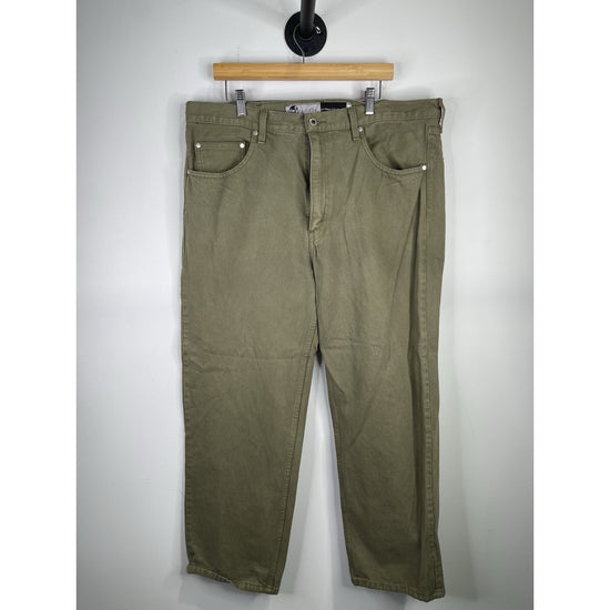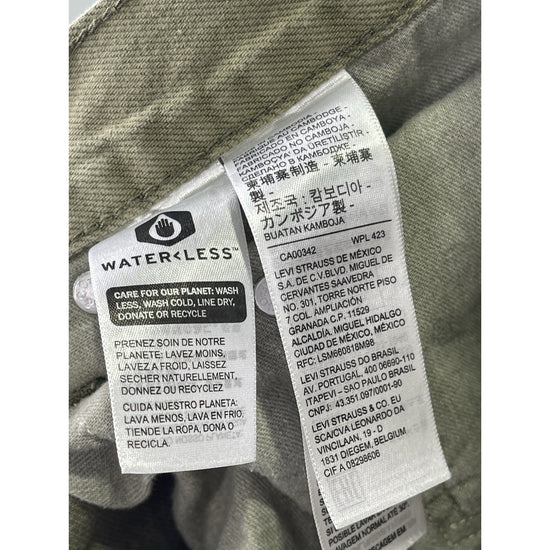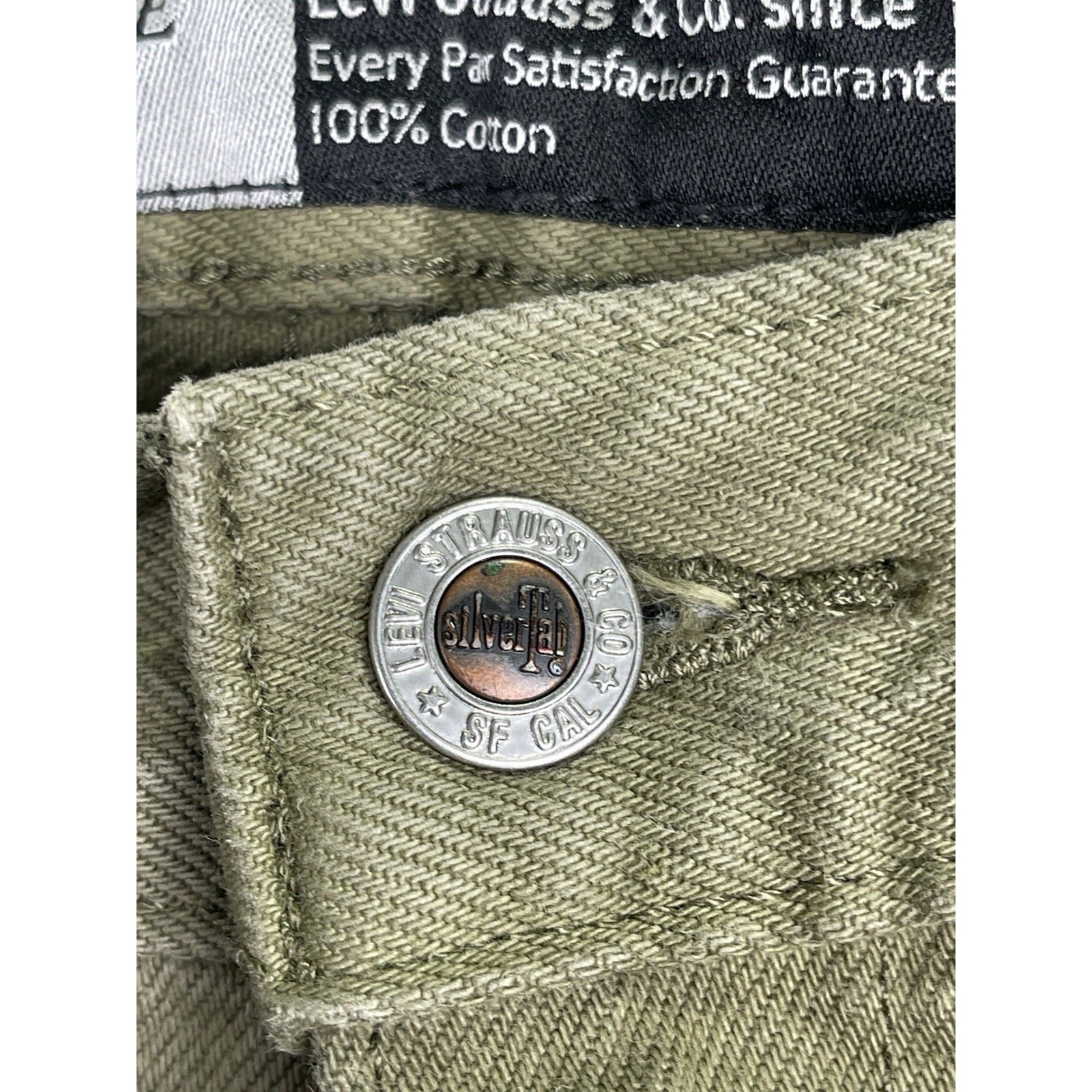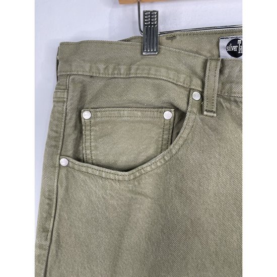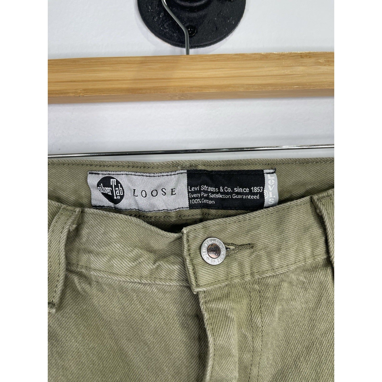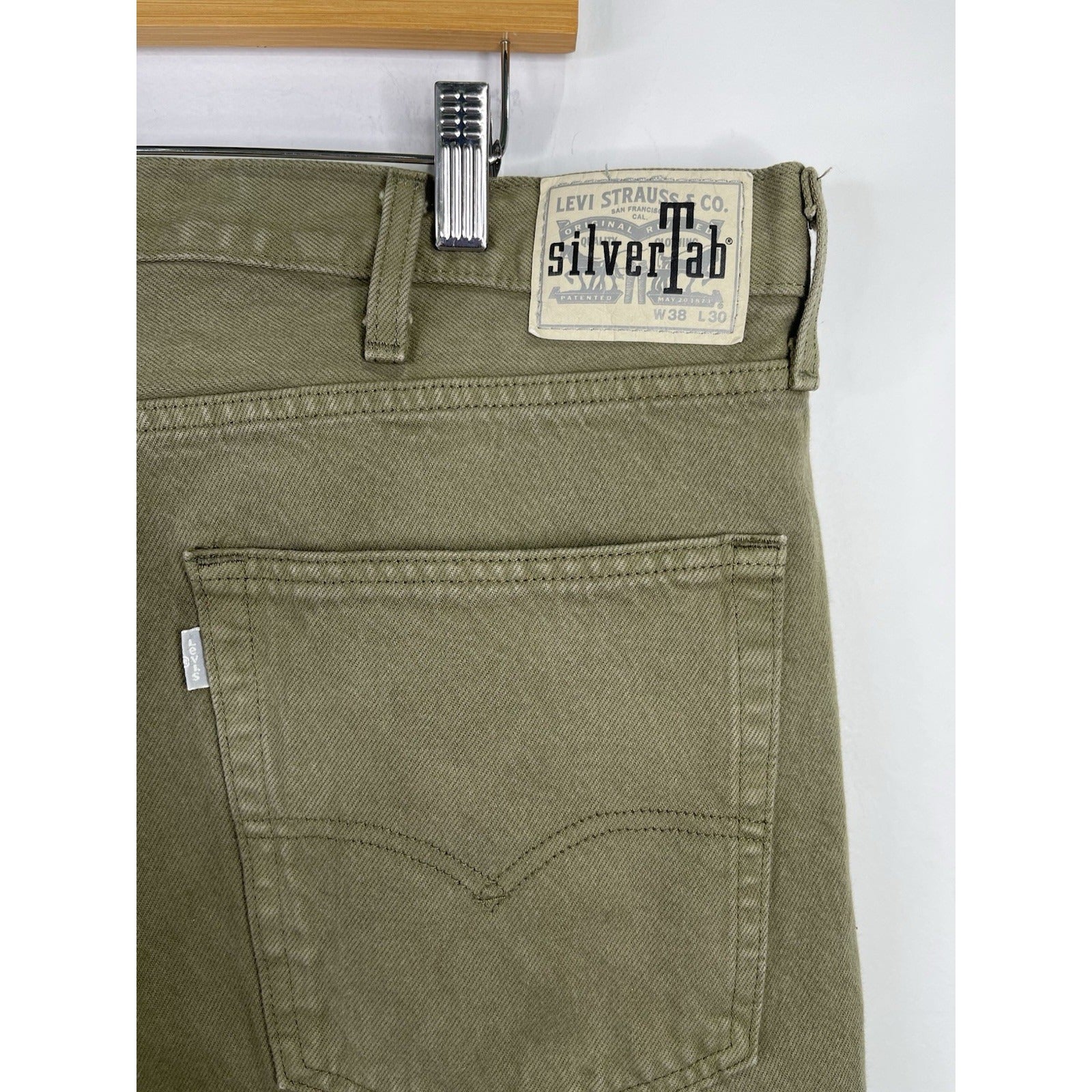 This product is a pair of Men's Levi's Silvertab Loose Fit Green Denim Jeans in size 38x30. The jeans feature a zip closure, 100% cotton fabric wash in a green machine/olive green color. With a loose fit, these Levi's SilverTab jeans offer a stylish and comfortable option for men looking for a casual yet on-trend denim staple.