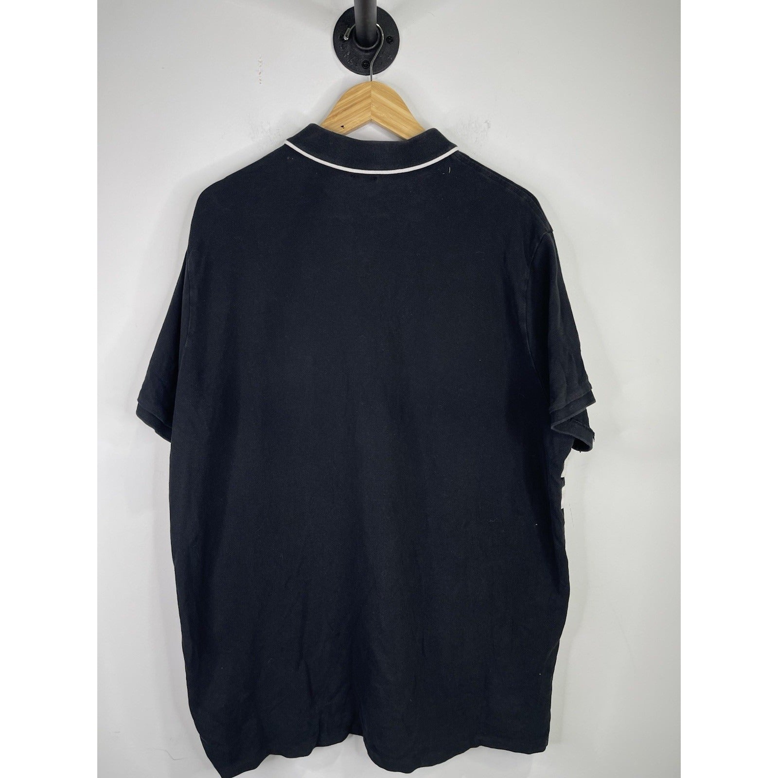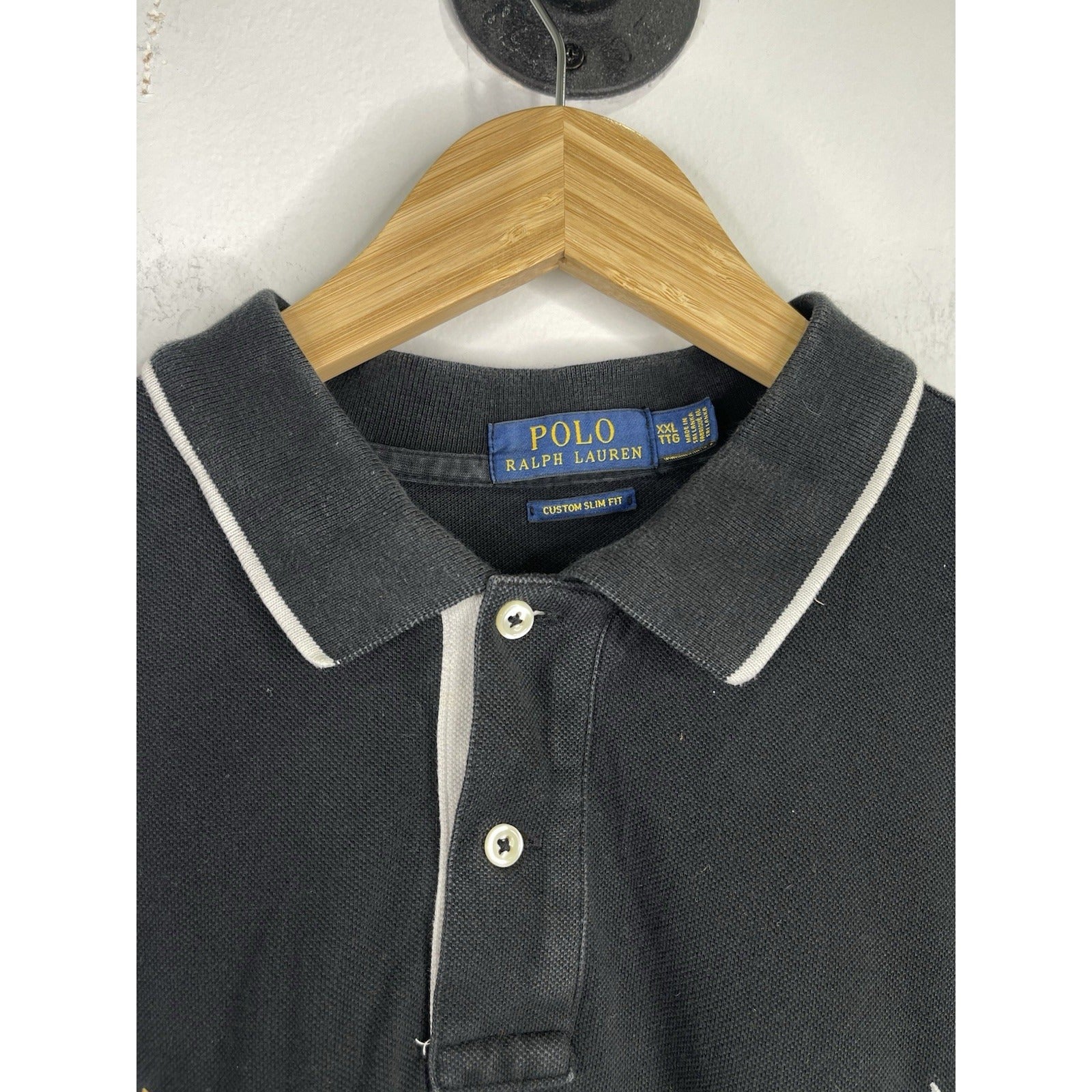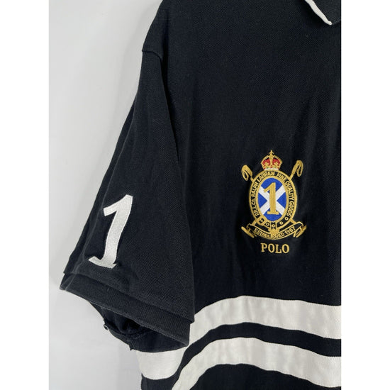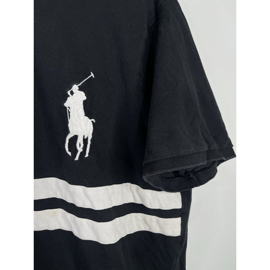 This Men’s Polo Ralph Lauren Big Pony Polo Shirt in Black features a classic collared design with a button closure, perfect for a casual travel look. Made from comfortable cotton material, the shirt showcases a striped logo with a USA theme, reflective of a designer and preppy style. With a regular fit and easy care instructions, this XXL polo is a versatile addition to any man's wardrobe.