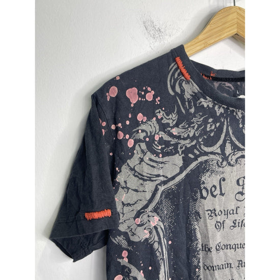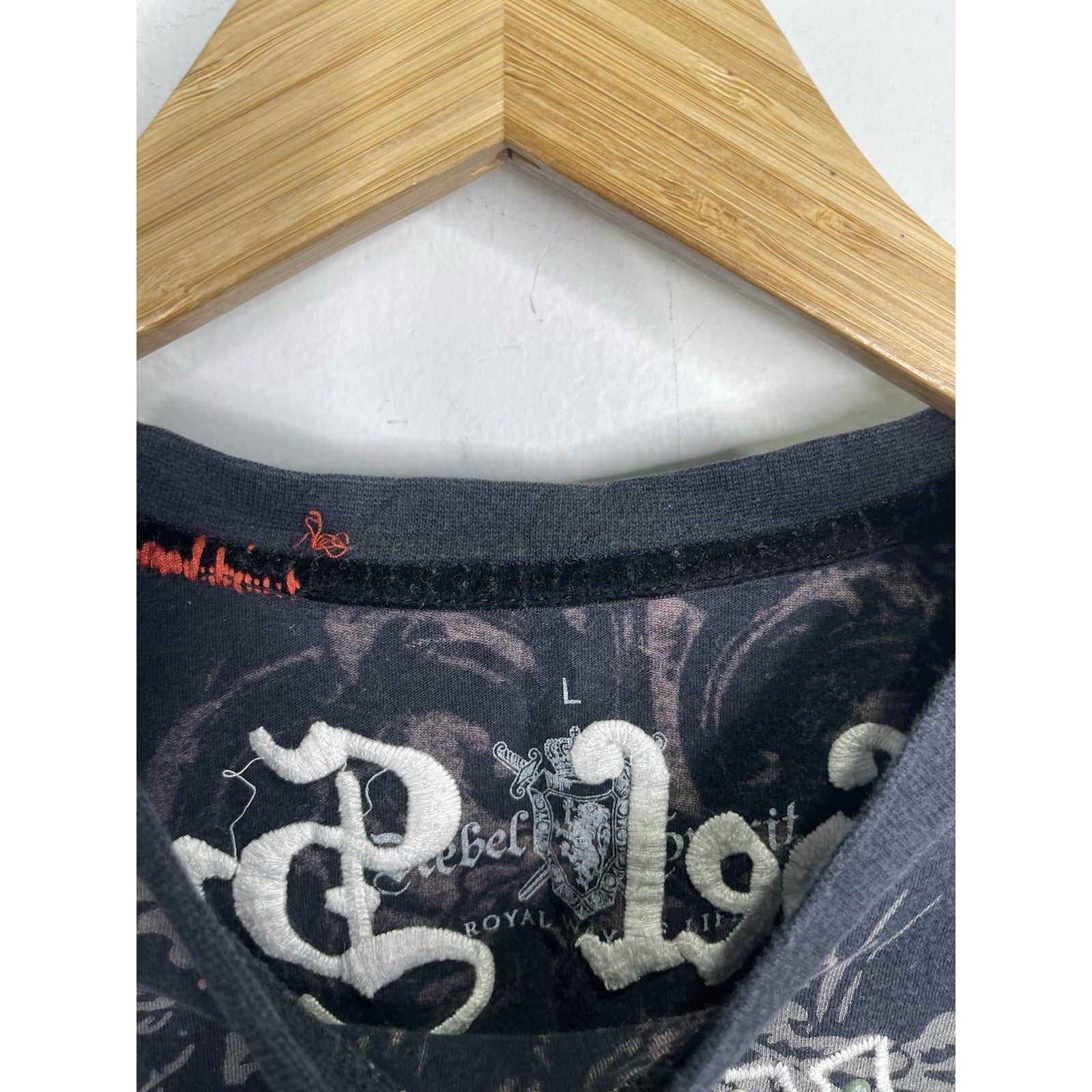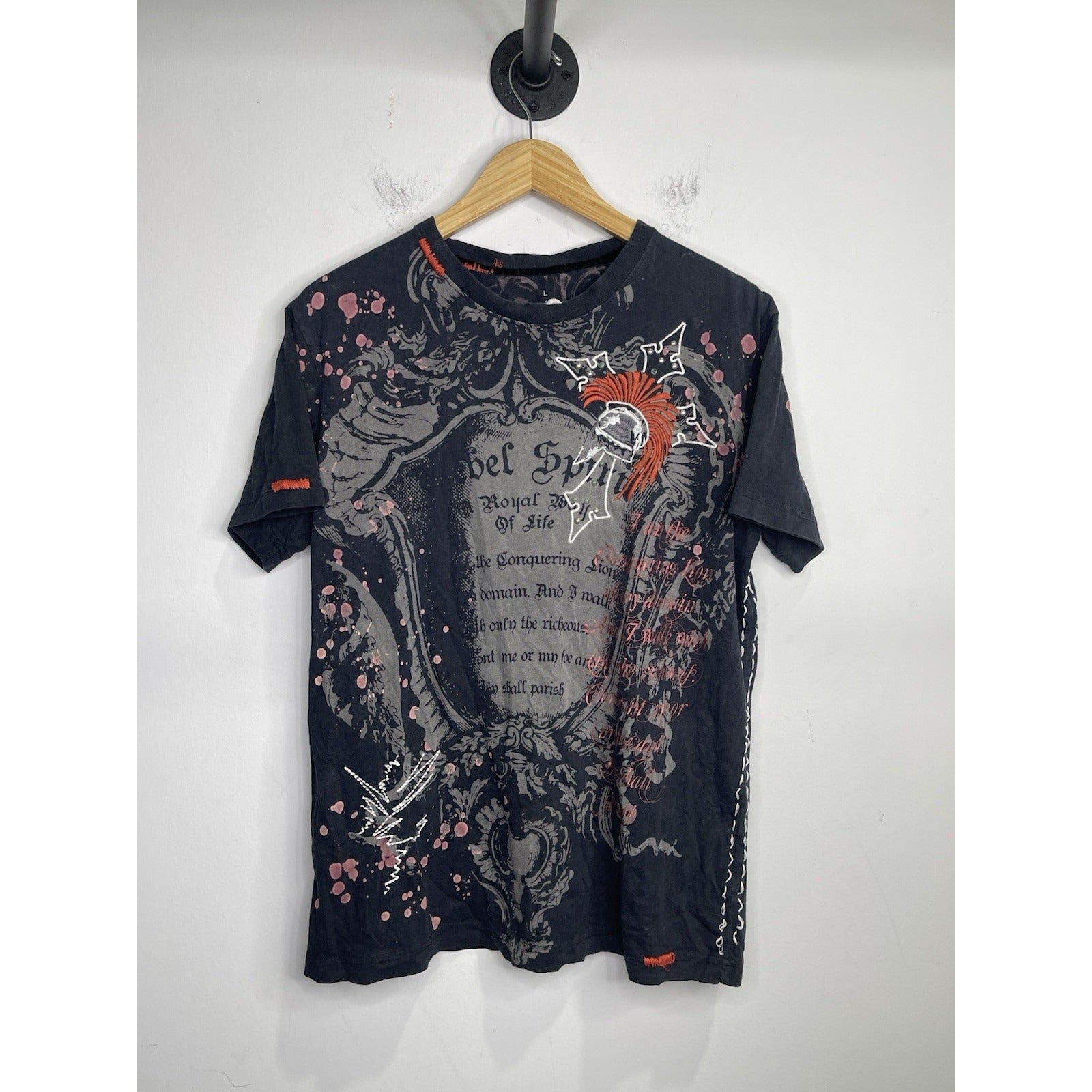 The Men’s Rebel Spirit Y2K Royal Helmet Shield Embroidered Studded T-shirt in size L is a black cotton t-shirt featuring short sleeves and a crew neckline. The shirt is accented with studded details and has a regular fit, making it lightweight and breathable. With a theme of 00s and 90s, this t-shirt from the brand Rebel Spirit is perfect for men looking to add a touch of vintage flair to their wardrobe.