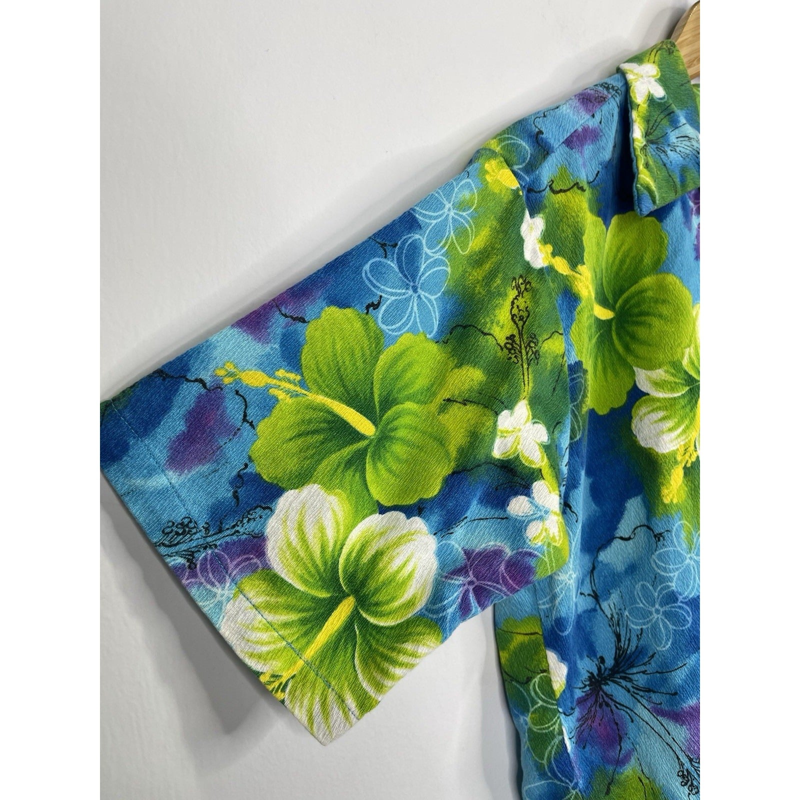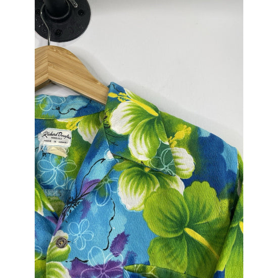 The Men’s Richard Douglas Honolulu Hawaii Button Up Floral Shirt in size L features a collared neckline, short sleeves, and a spread collar style. The shirt is adorned with a multicolor floral pattern, making it a casual yet stylish addition to any man's wardrobe. With its button-up style and quality brand, this shirt is perfect for a day out in the sun or a casual evening event. The accent of the button detail adds a touch of sophistication to this flower-themed shirt.
