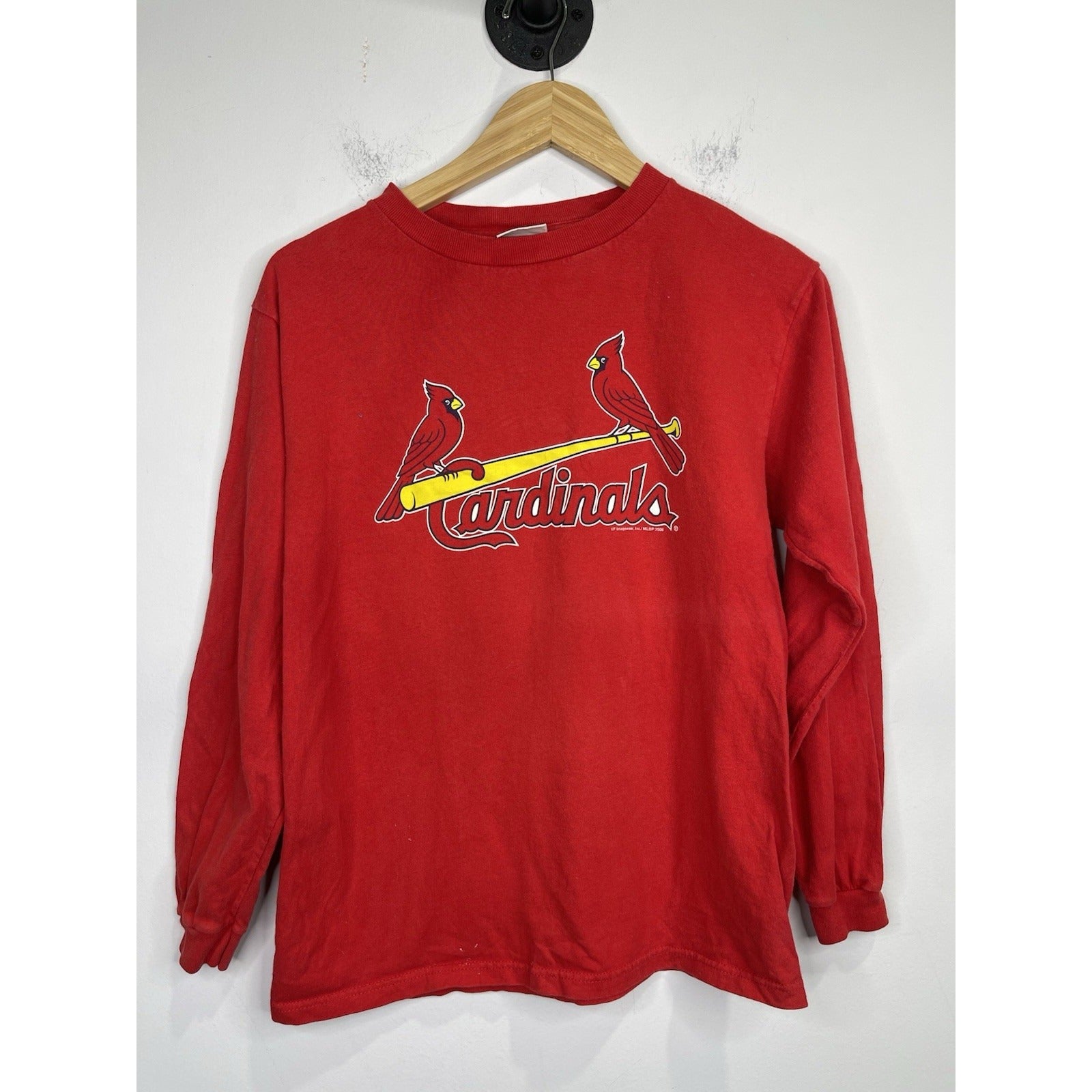 This product is a men's St. Louis Cardinals Larry Walker long sleeve red t-shirt in size small. The shirt is officially licensed by Major League Baseball and features the player's name and team logo. It is made by Majestic, a reputable brand for fan apparel, and is perfect for any baseball fan looking to show support for the St. Louis Cardinals and Larry Walker. The shirt is in a vibrant red color and is a must-have for collectors and fans of the sport.