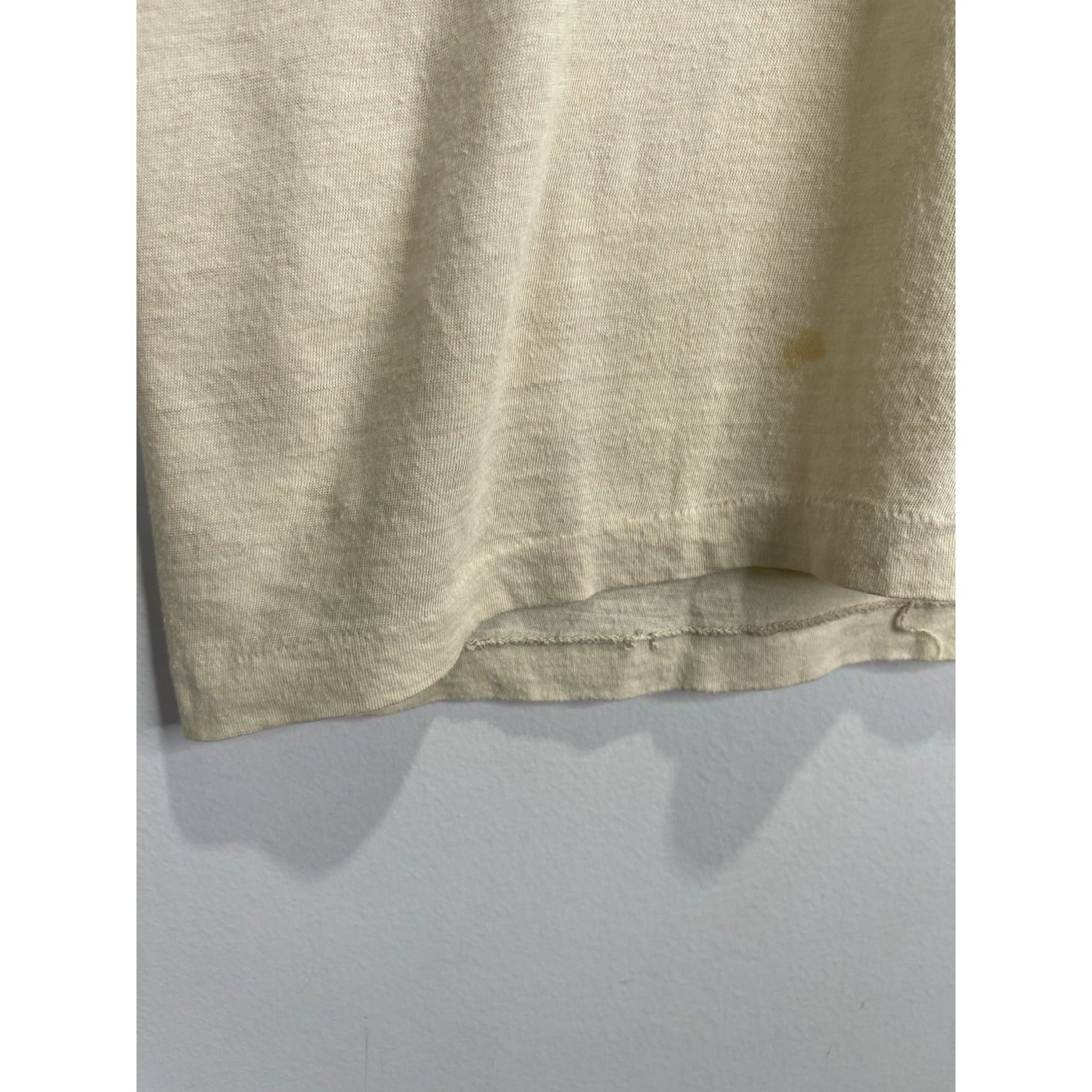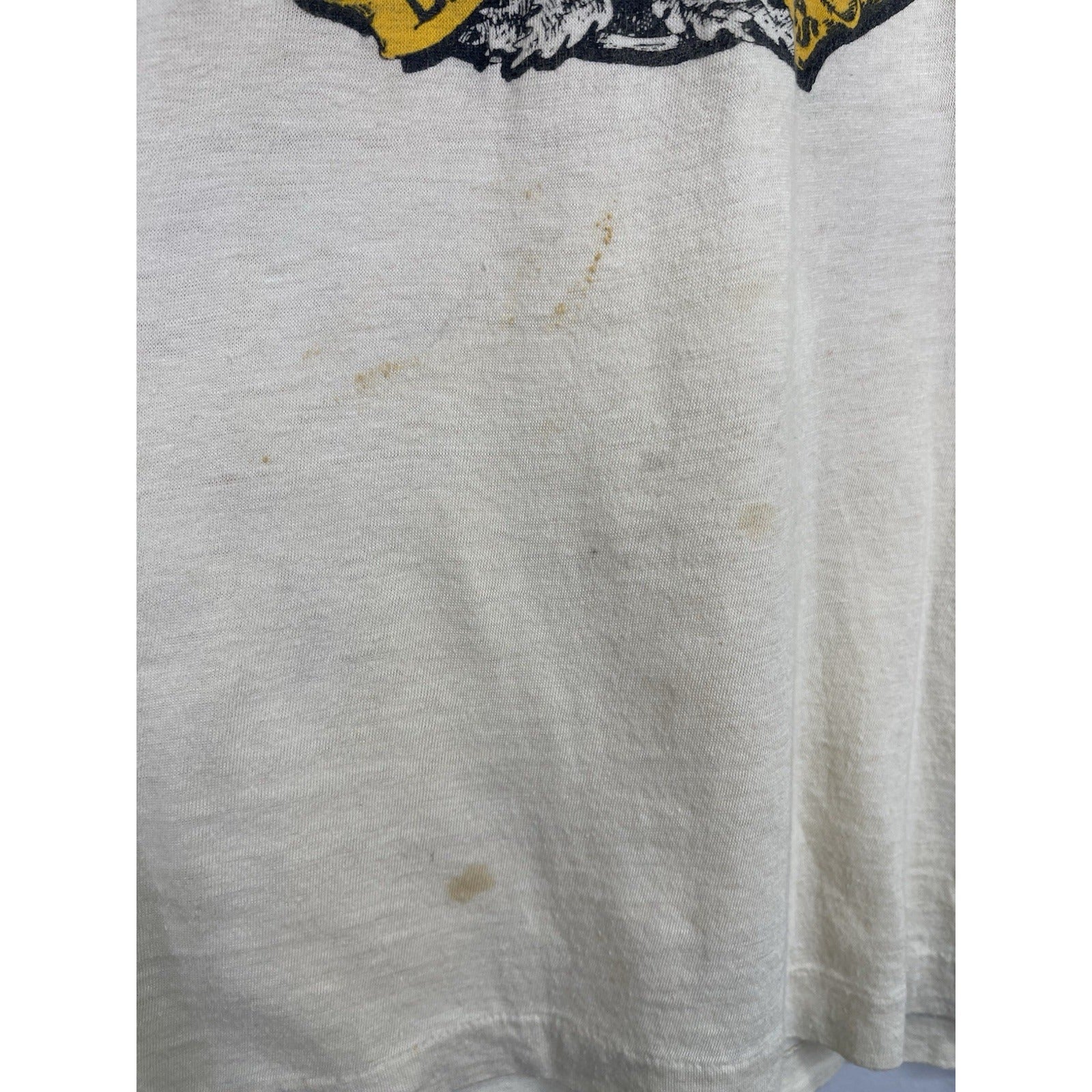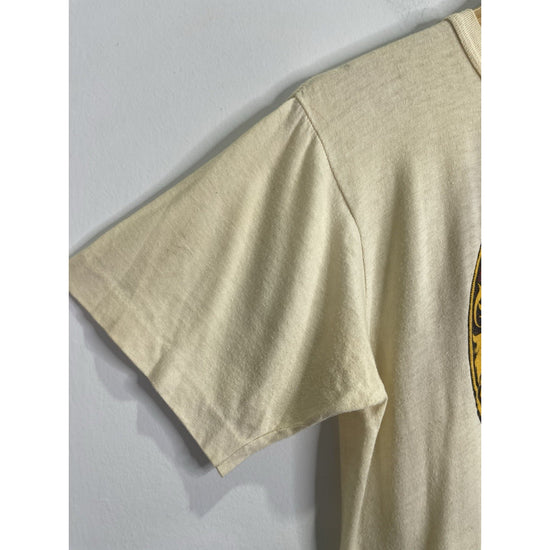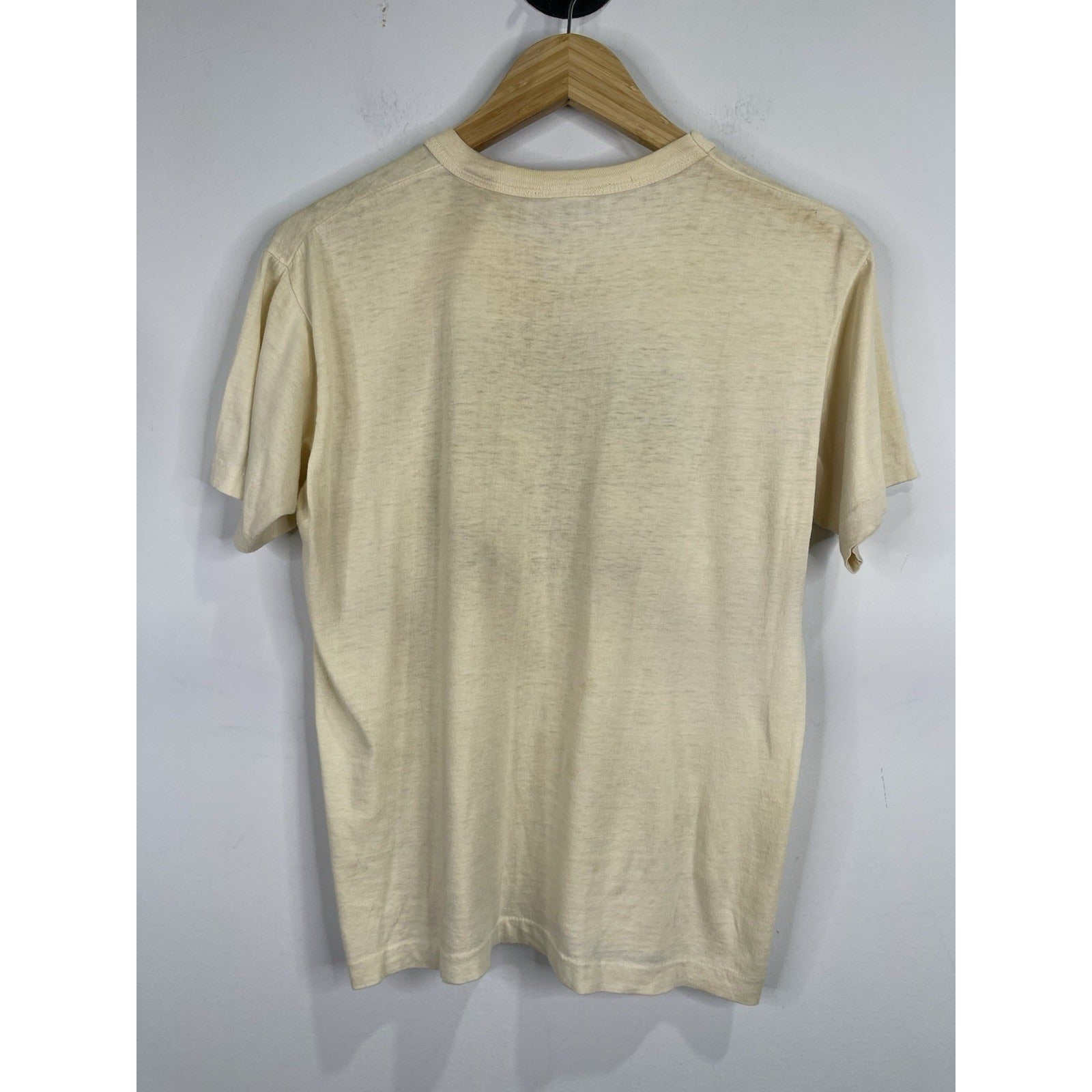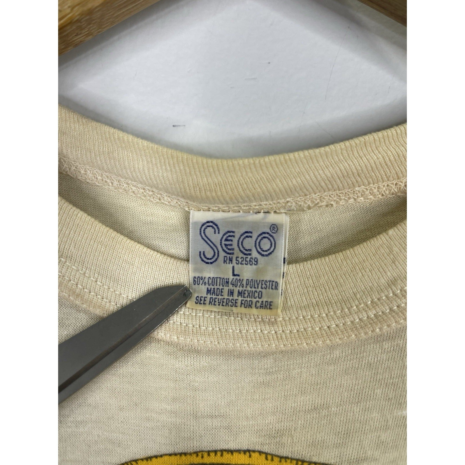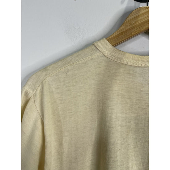 This vintage 1970's Texas Renaissance Festival T-Shirt in size Large features a graphic print of King Arthur, perfect for fans of the Renaissance and 70s era. Made of lightweight cotton knit fabric in a vibrant yellow color, this short sleeve t-shirt has a regular fit with a classic crew neck. Machine washable and suitable for all seasons, it is a unique piece of clothing that embodies the spirit of the era with its hipster and holiday-themed design. A true gem for collectors and those looking to add a touch of nostalgia to their wardrobe.