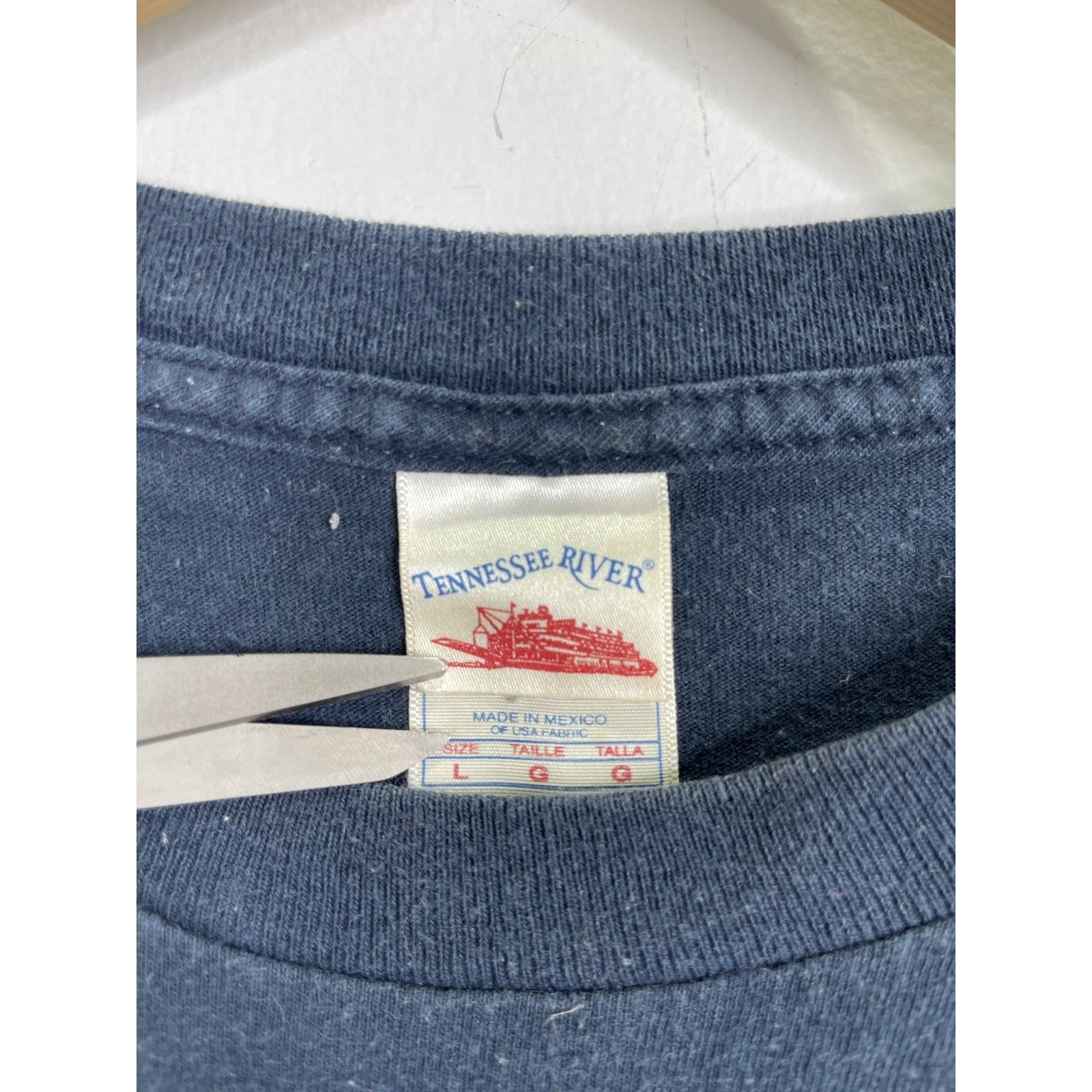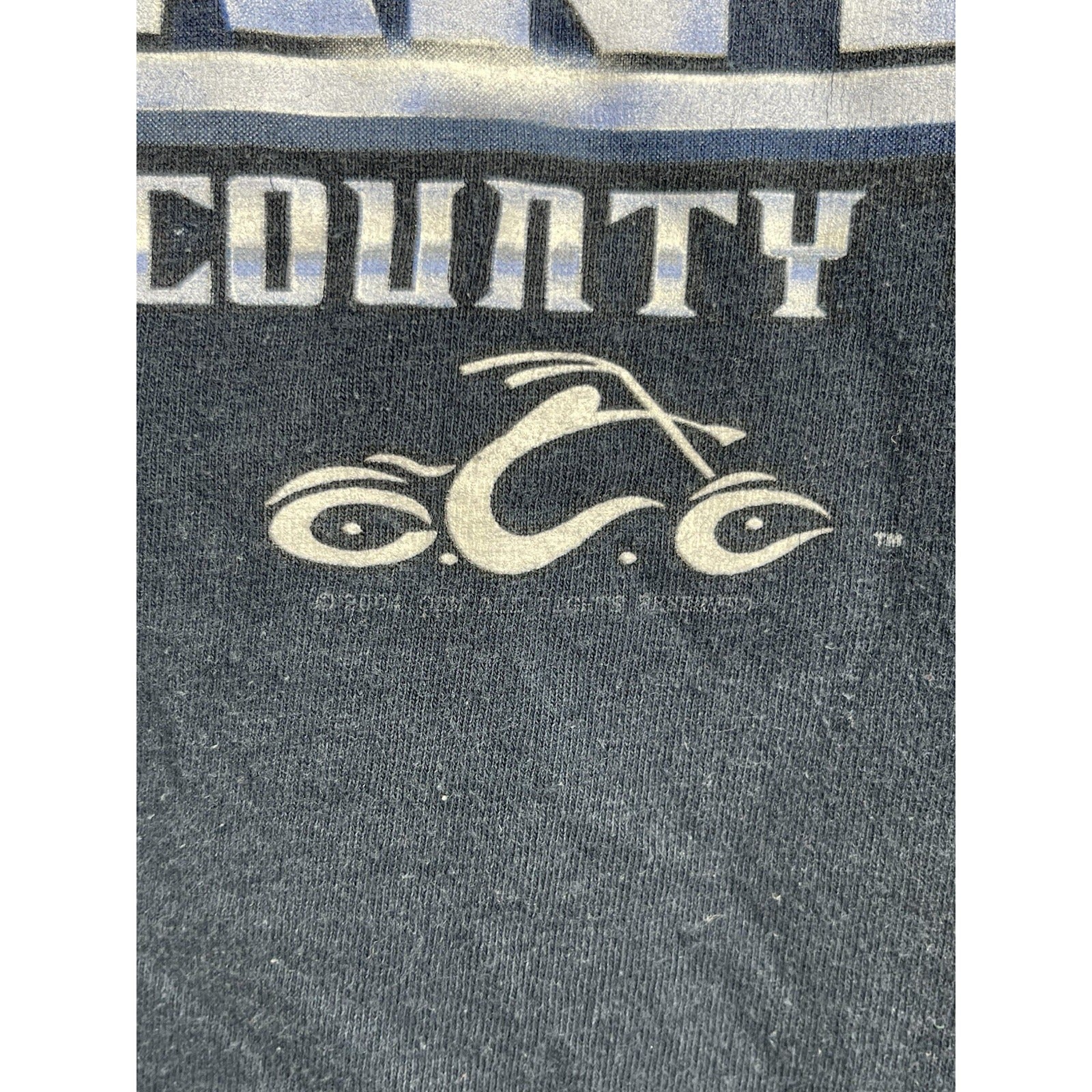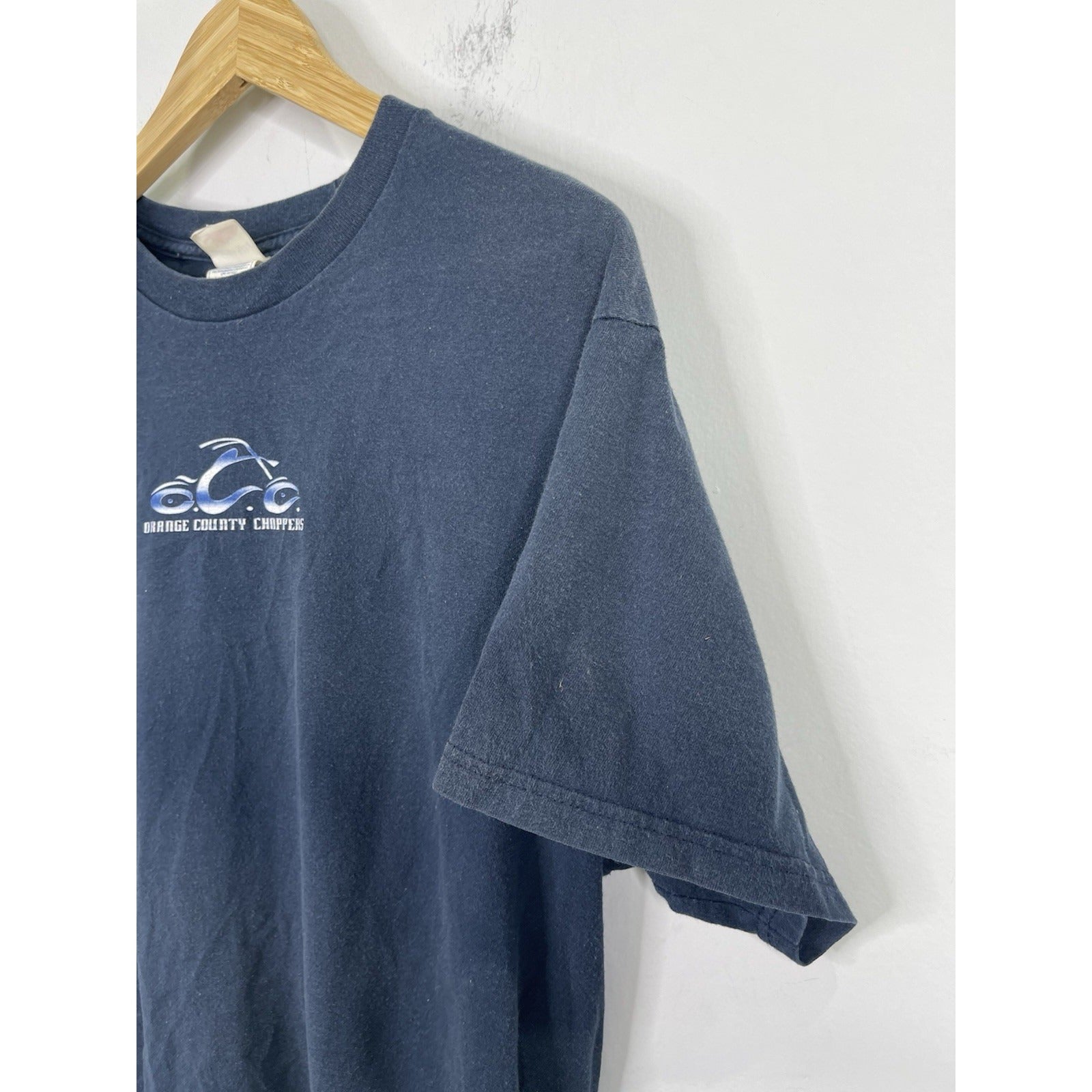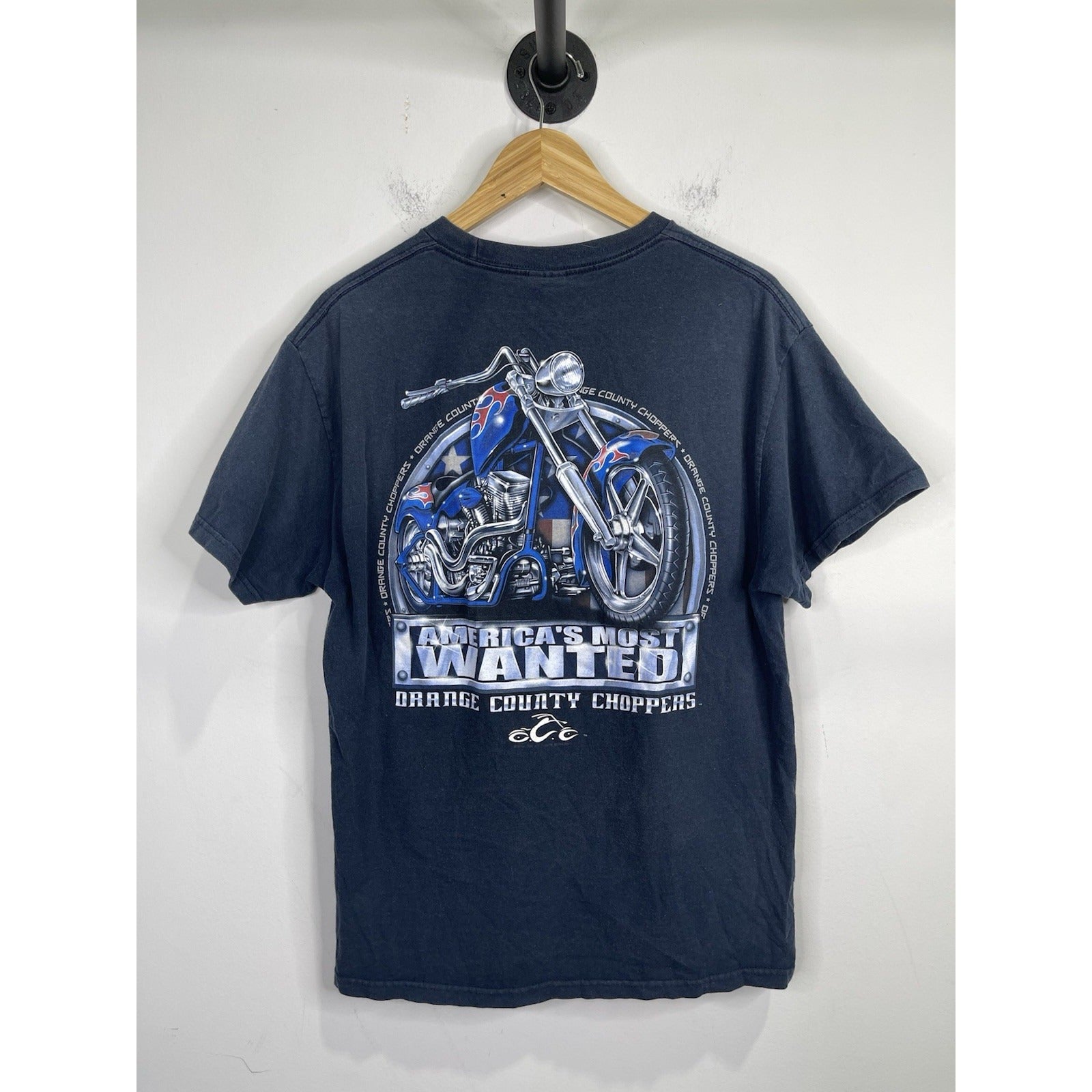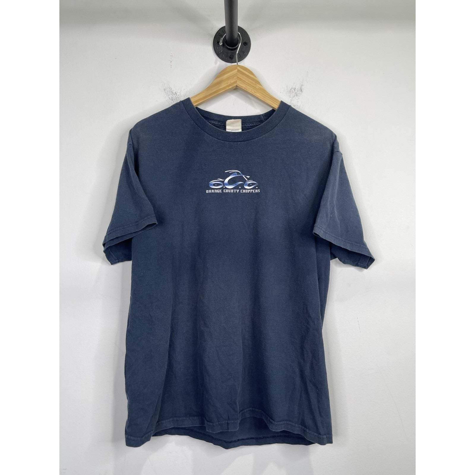 This Men's Vintage 2004 Orange County Choppers Graphic Navy Blue T-Shirt in size L is a nostalgic piece with a classic crew neck and short sleeves, perfect for those who appreciate motorcycle and biker themes. Made of comfortable cotton material, this regular fit shirt features a double-sided graphic print from the Tennessee River brand, making it a unique addition to any wardrobe. Ideal for all seasons, this easy-care tee is a versatile and stylish choice for any fan of vintage fashion.