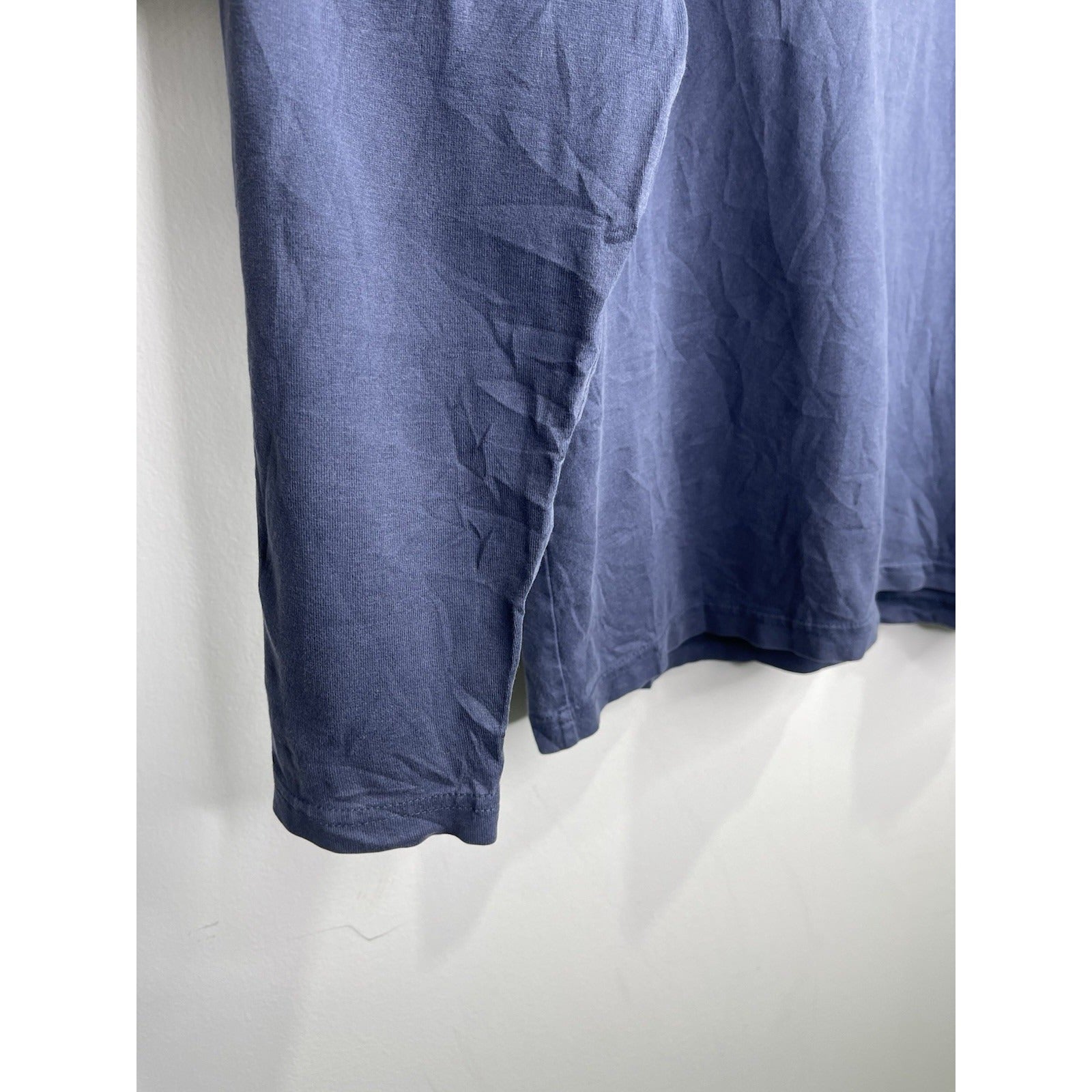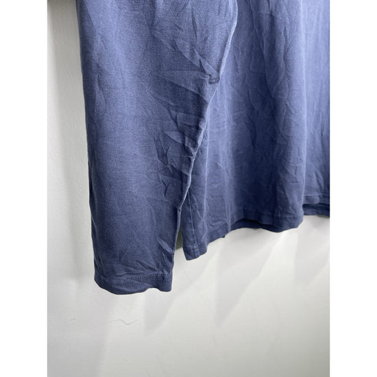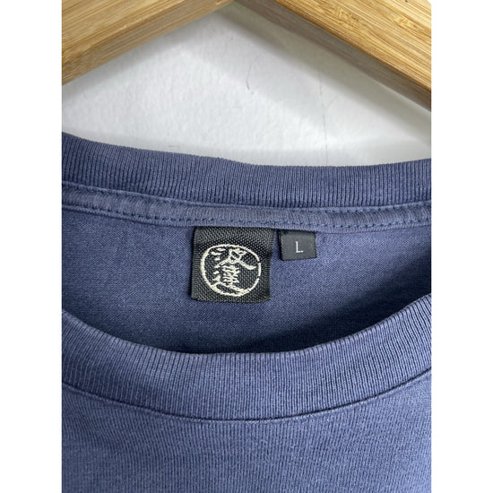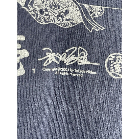 The product is a men's vintage 2004 Takeda Hideo surfing graphic navy blue T-shirt in size L. This classic, sports-themed t-shirt features a crew neck and long sleeves, made of breathable cotton material. The graphic print on both sides of the shirt showcases the iconic design of Takeda Hideo, adding a touch of Japanese culture to the overall look. Perfect for all seasons, this t-shirt offers a regular fit for comfortable wear.