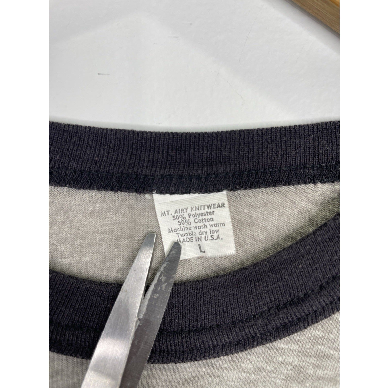 This product is a Men's Vintage 80s Gray and Black Long-sleeve T-Shirt in size XL. It features a Crew Neck and Raglan Sleeve with a vintage design from the Eliminator Tour by ZZ Top. Made of 100% cotton material, this single-stitched shirt is perfect for fans of 80s music and fashion. The brand, Mt. Airy Knitwear, adds to the authenticity and charm of this retro piece. In excellent condition, this T-shirt is a must-have for any vintage enthusiast looking to add a unique item to their wardrobe.