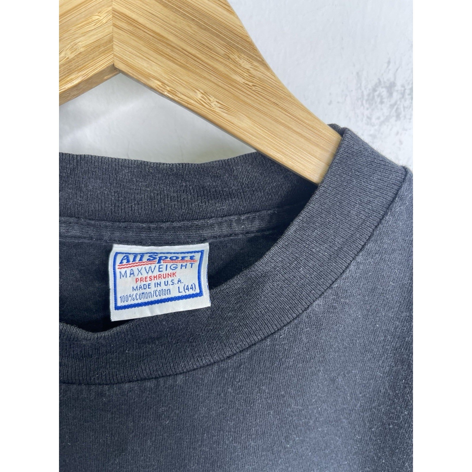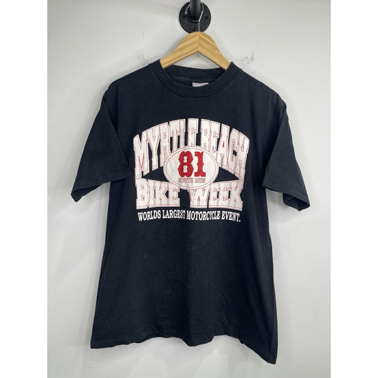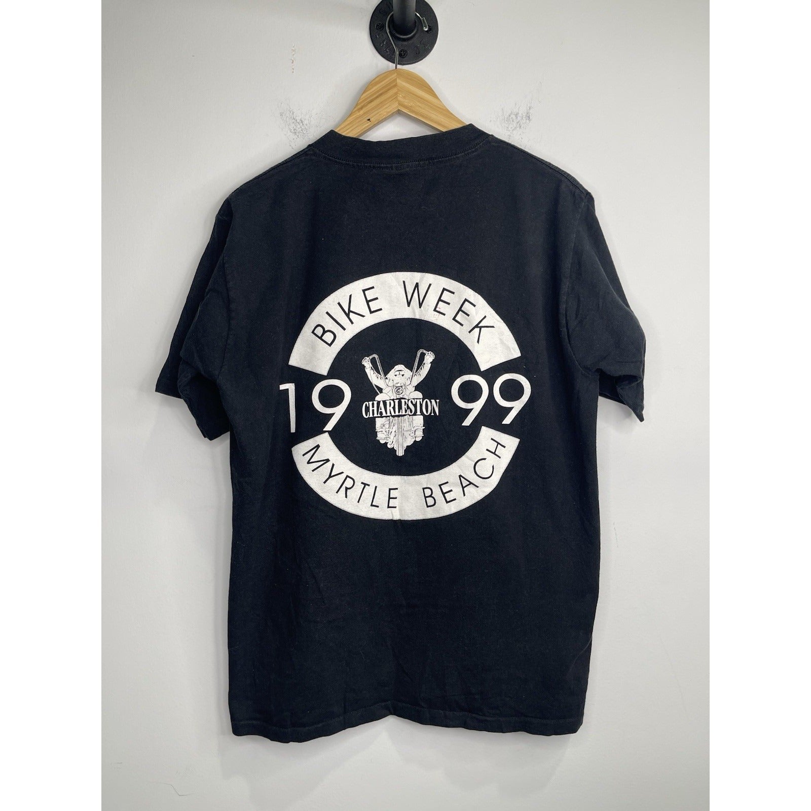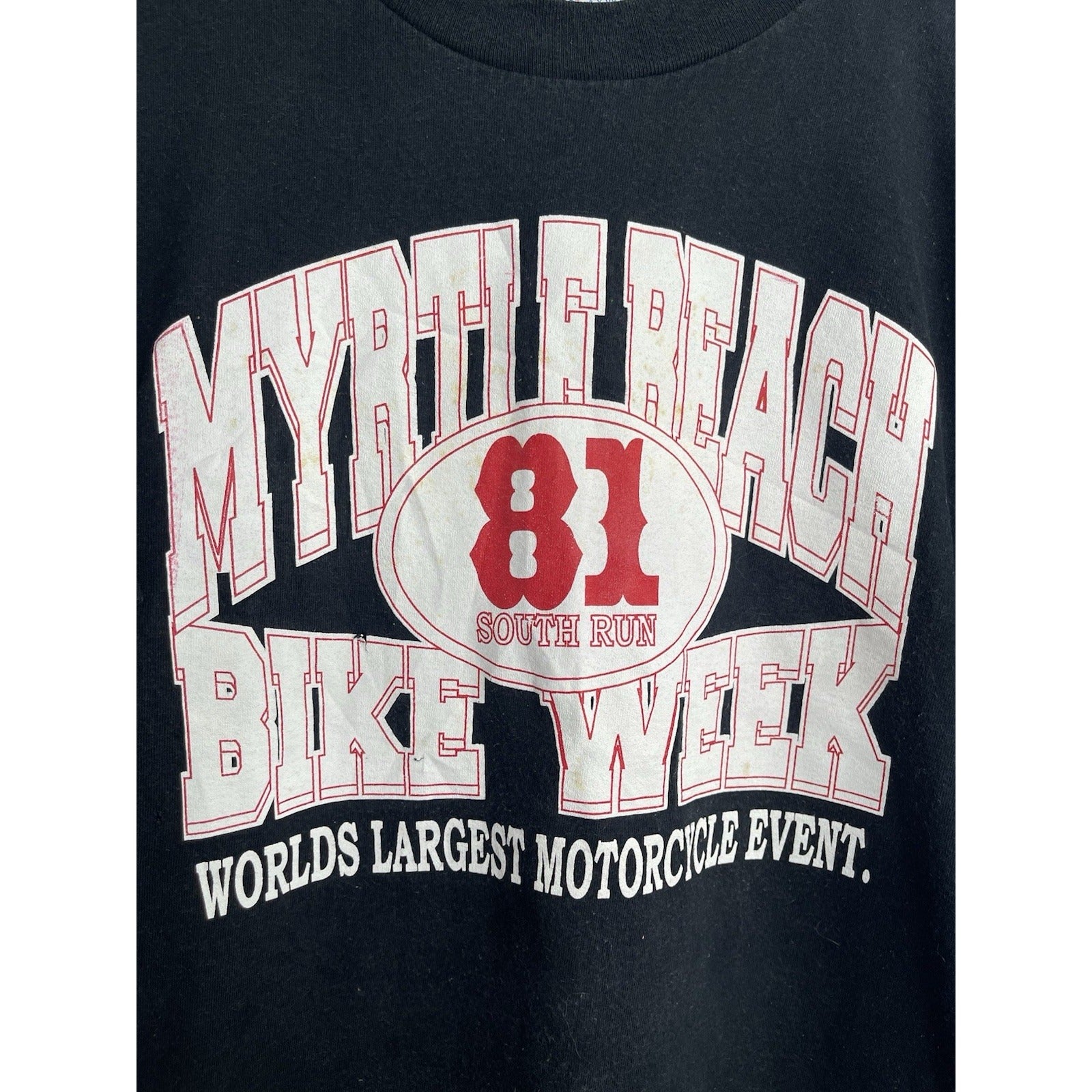 This Men's Vintage 81 South Run Myrtle Beach Bike Week Graphic T-Shirt in size L features a classic black color with a graphic print design that showcases a biker theme. Made from cotton material, this short sleeve shirt with a crew neck offers a regular fit for comfortable wear. The double-sided print adds a unique touch to this vintage piece from the All Sport brand, making it a stylish addition to any biker's wardrobe. Perfect for all seasons and easy to care for, this t-shirt embodies the spirit of the iconic Bike Week event.