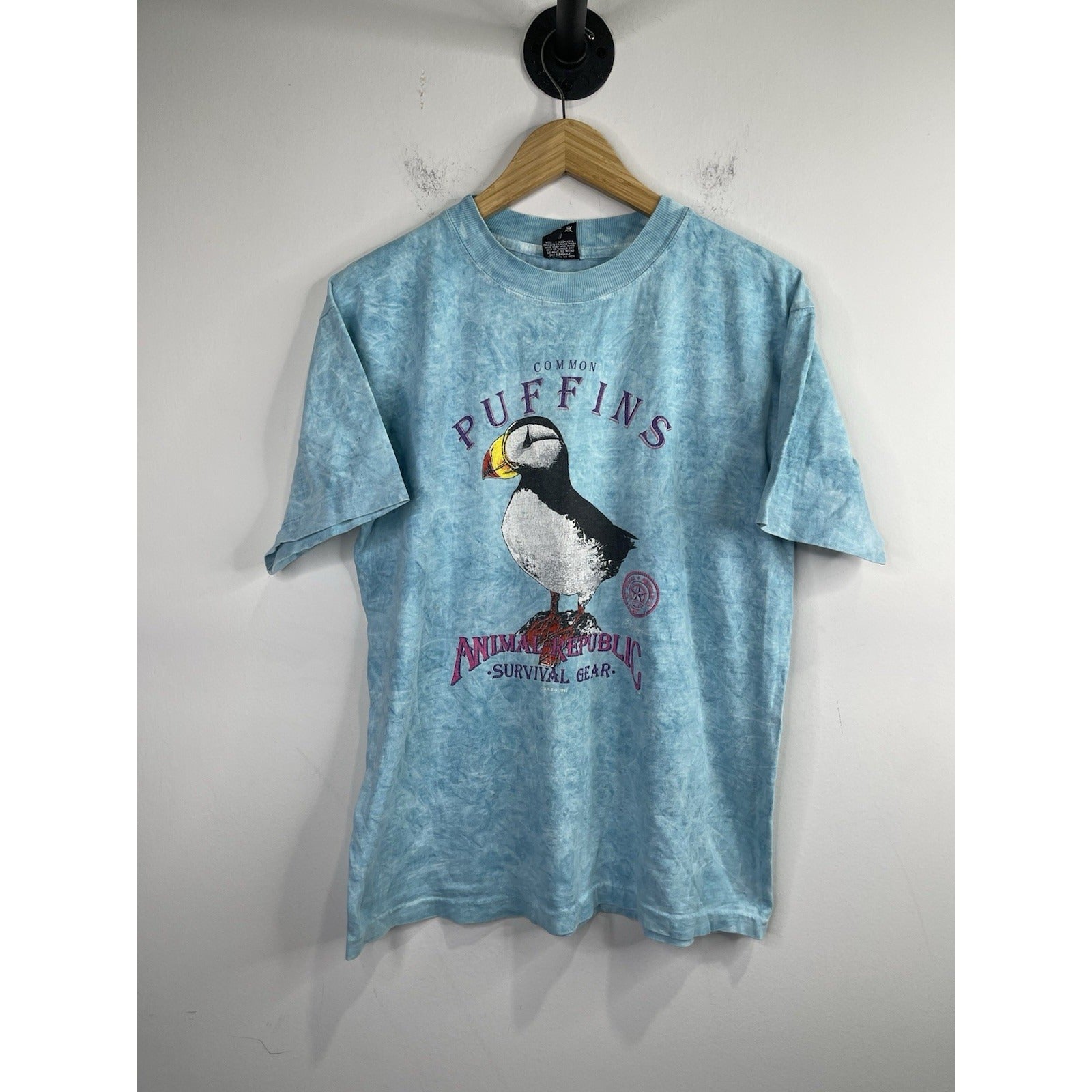 This Men's Vintage 90s Blue Tie-Dye Common Puffins Animal Republic Graphic Tee in size L is a classic and nostalgic piece perfect for any retro enthusiast. Made from comfortable cotton material, this short sleeve shirt features a crew neck and a regular fit, making it suitable for all seasons. The graphic print design with a 90s theme adds a fun and unique touch to the wardrobe, while the breathable fabric ensures comfort and style. Ideal for casual wear, this tee is a must-have for anyone looking to add a touch of vintage flair to their outfit.