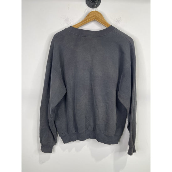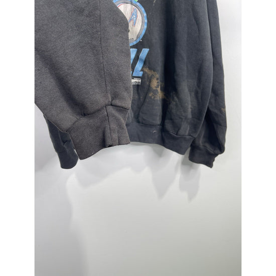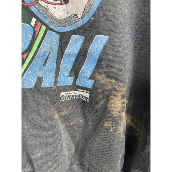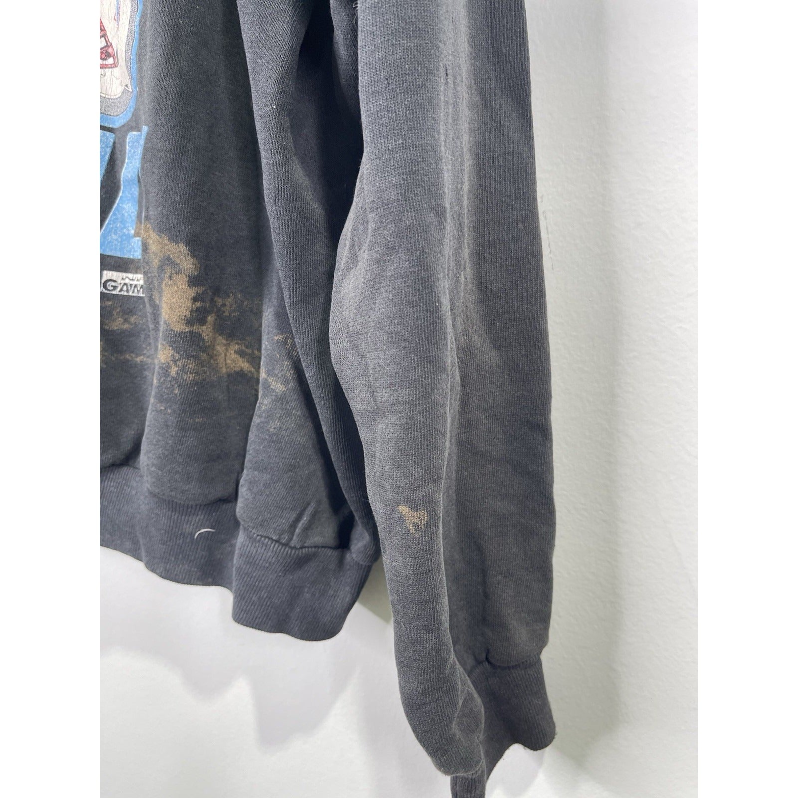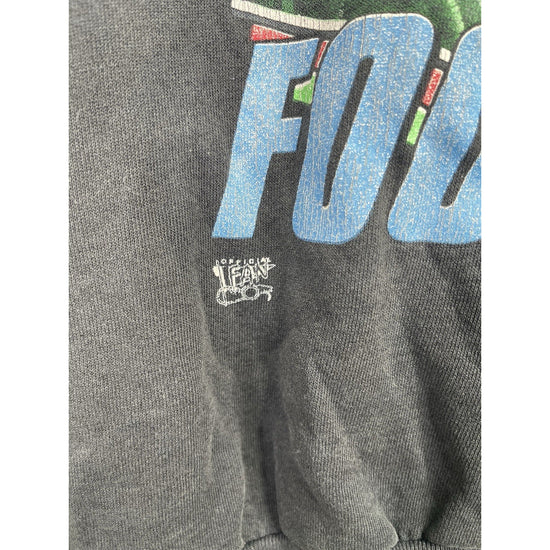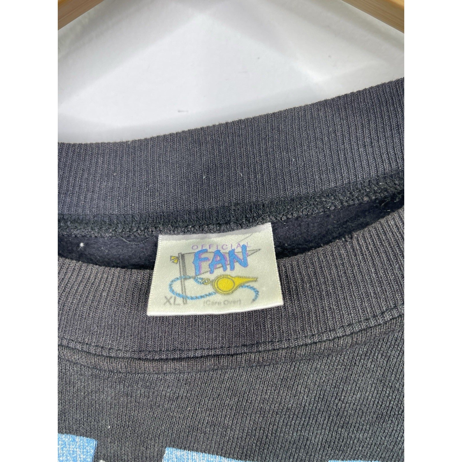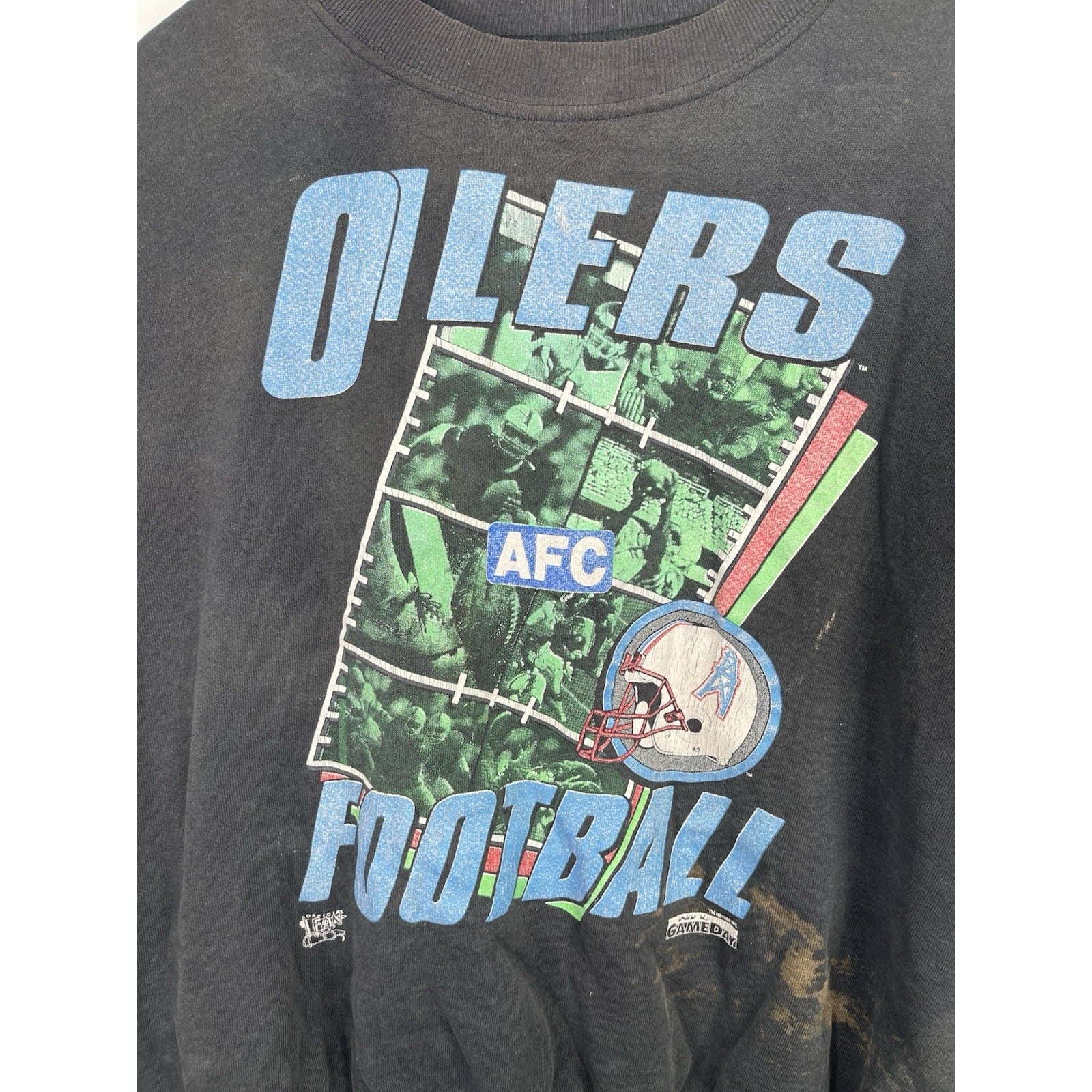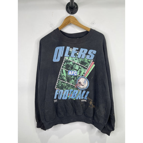 This Men's Vintage 90s Offical Fan Tag Oilers Football Black Sweatshirt in size XL features a classic crew neck and long sleeves, made from soft cotton knit fabric. The graphic print design, with a 90s theme, pays homage to vintage style and football nostalgia. Perfect for all seasons, this pullover sweatshirt is a timeless piece that combines comfort with a touch of retro flair. Made in the United States, this authentic vintage sweatshirt is a must-have for any fan of the Oilers football team or 90s fashion.