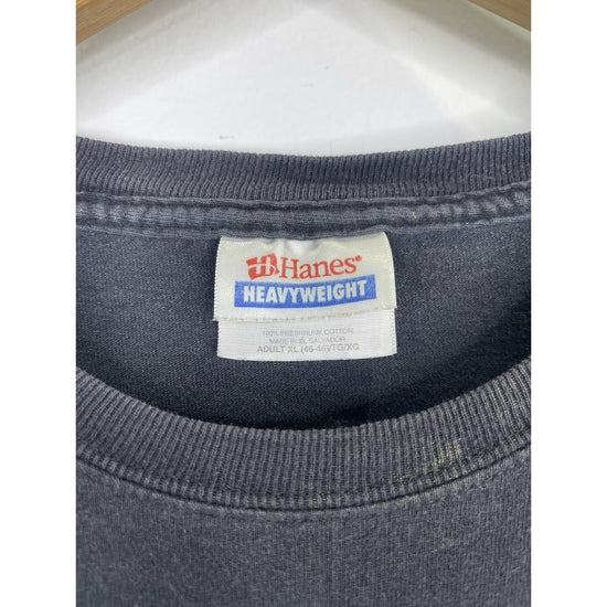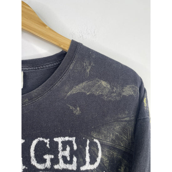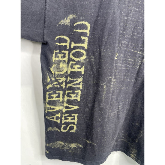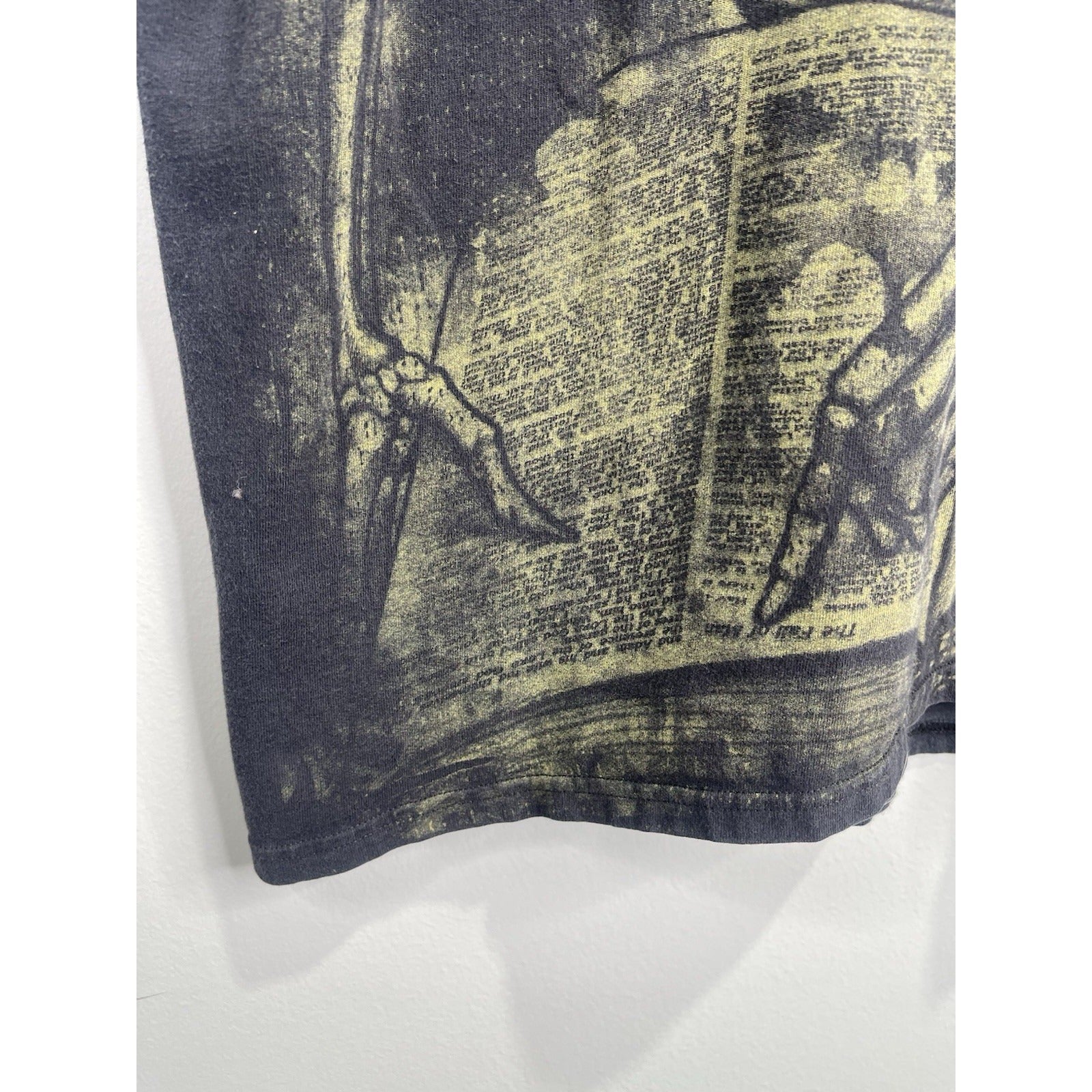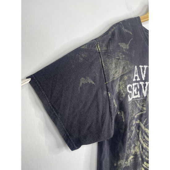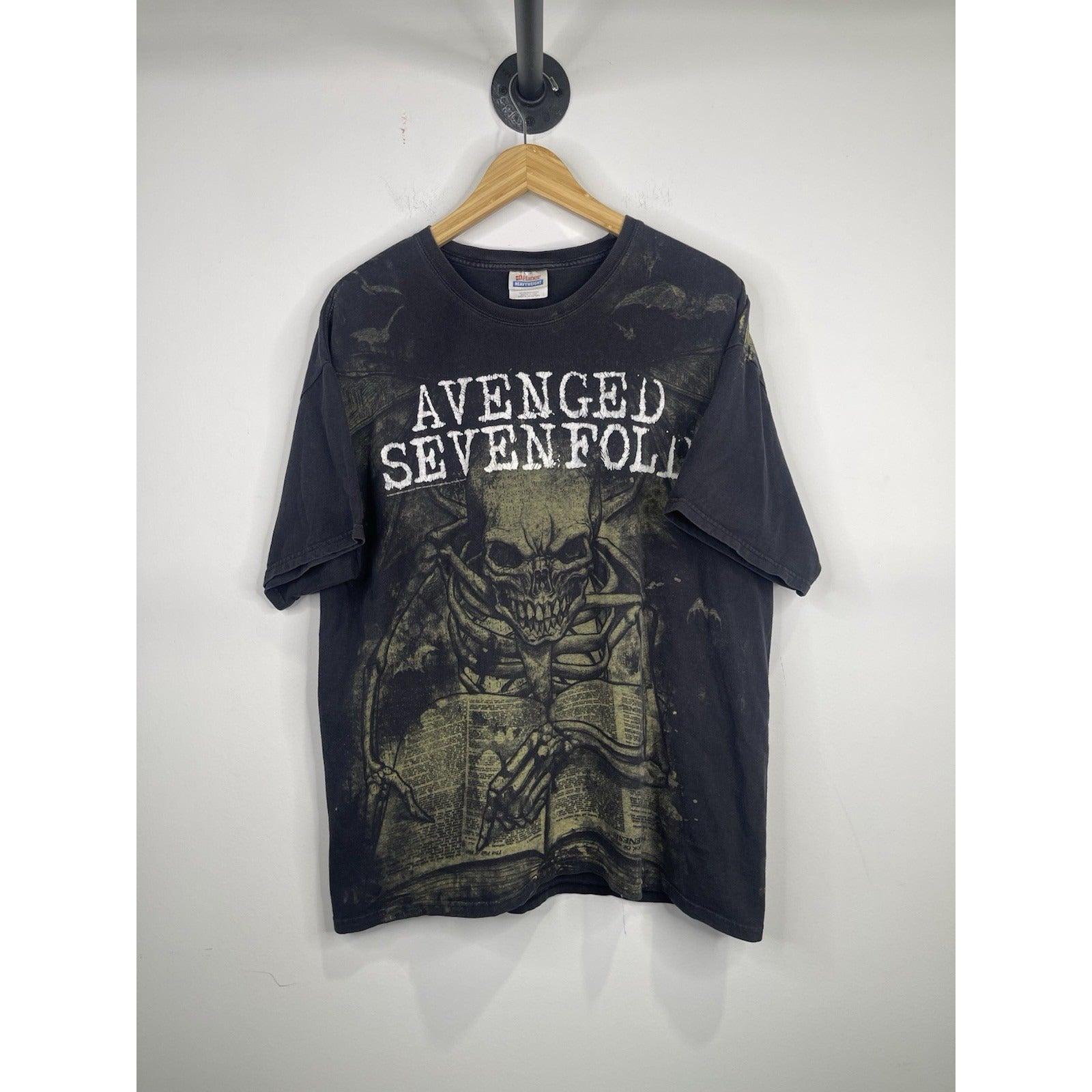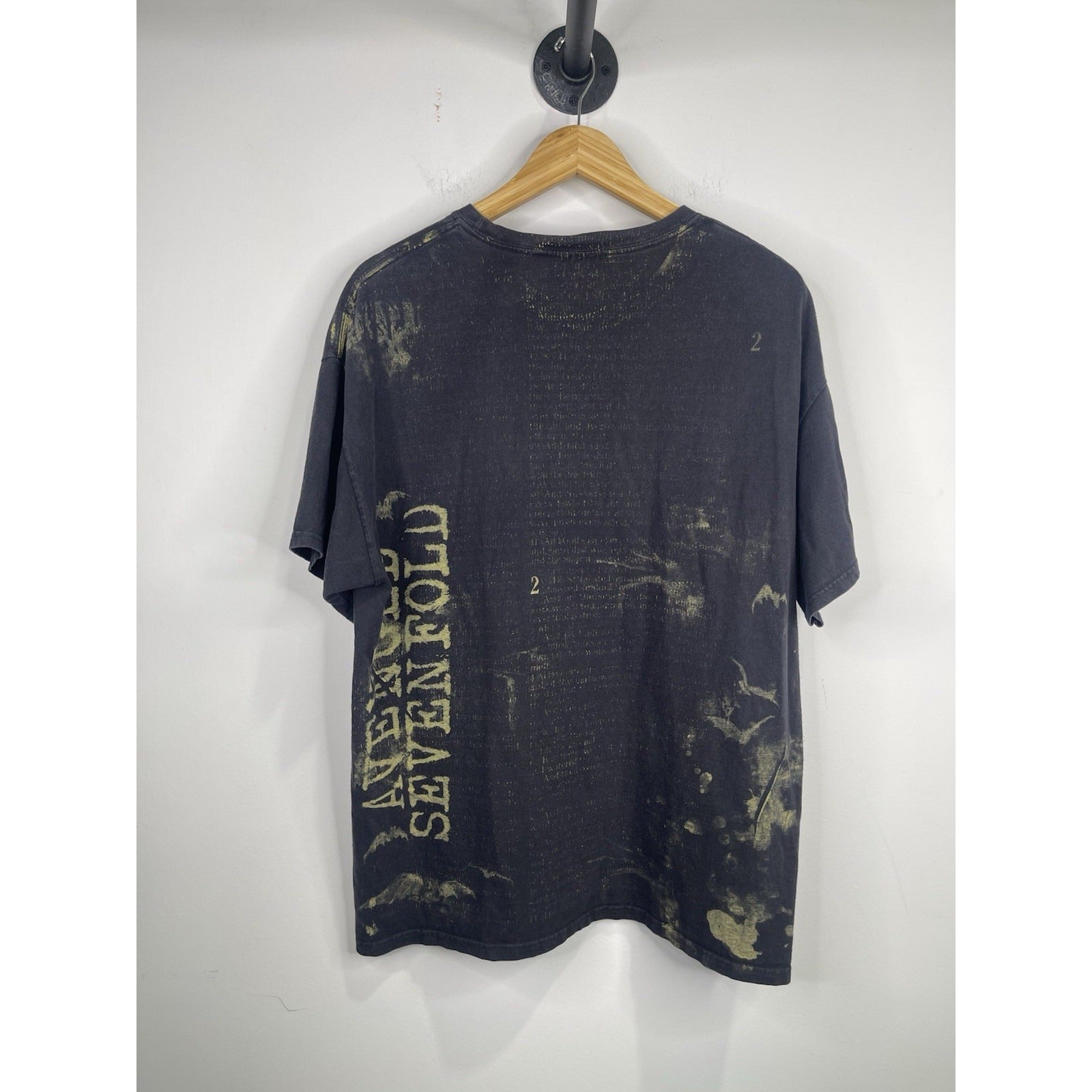 This Men's Vintage Avenged Sevenfold Skeleton All Over Print T-Shirt in size XL features a graphic print design with a crew neck and short sleeves. Made from cotton material, this black shirt is perfect for all seasons and showcases a theme of music, skull, and band. With a regular fit and double-sided print, this shirt by Hanes is an easy-care garment that is ideal for any music enthusiast looking to make a statement with their wardrobe.